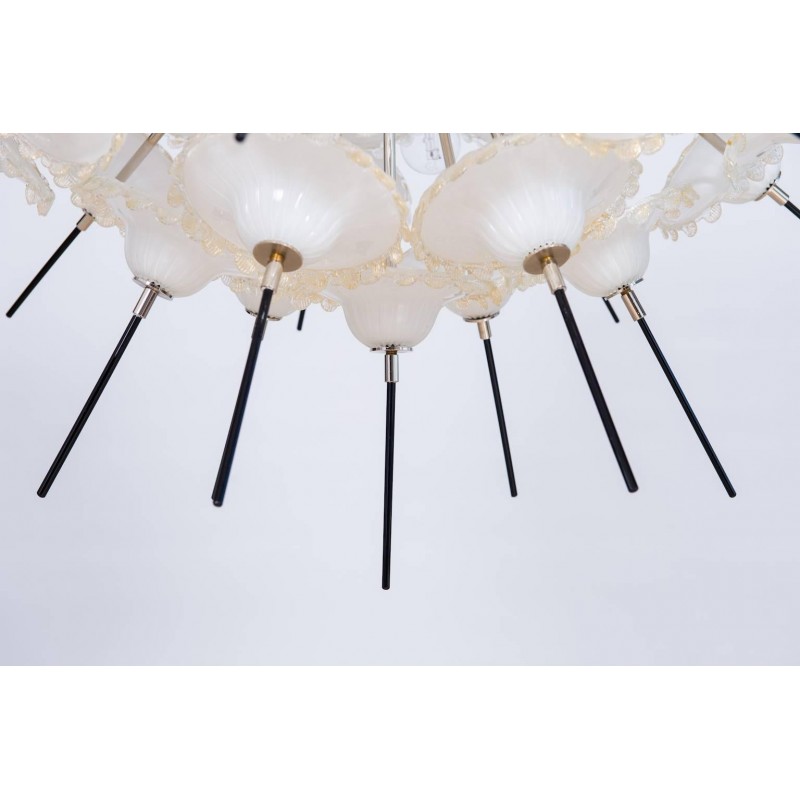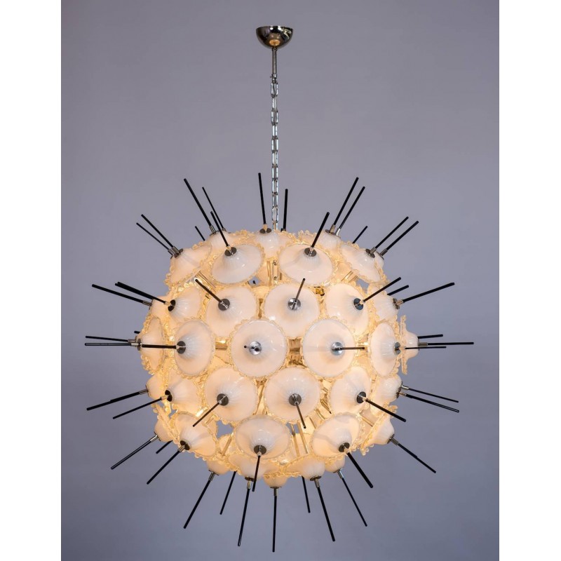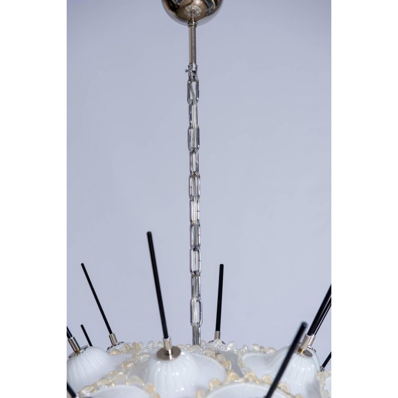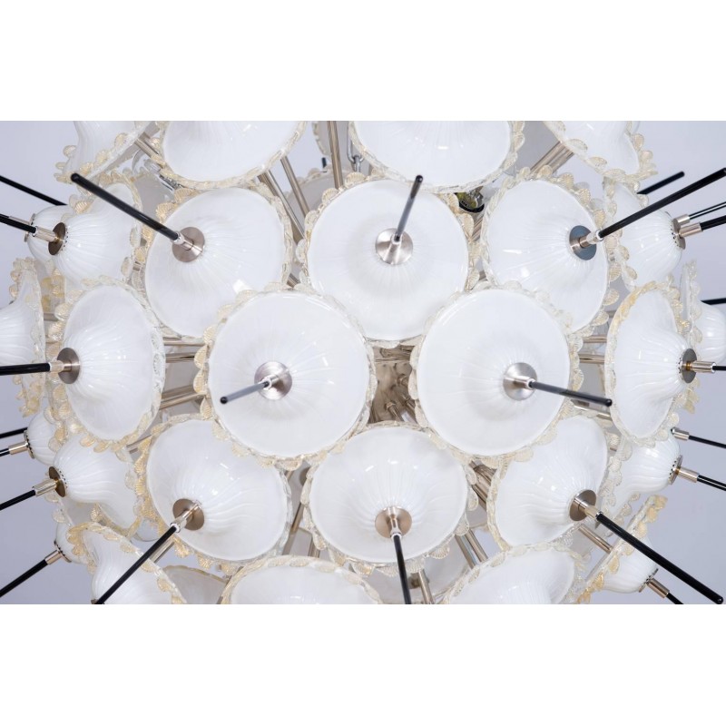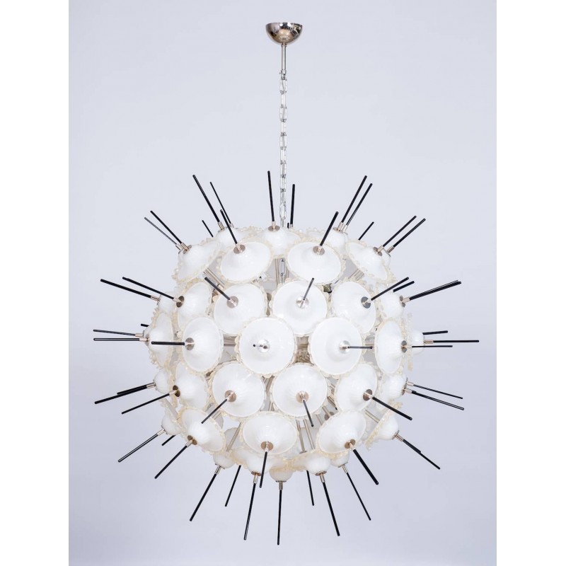 Imposing Sputnik Chandelier White Murano Glass and black elements 1970s Italy, Giovanni Dalla Fina production. Giant Sputnik chandelier in Murano glass is a masterpiece composed by milk color elegant cups with a 24-karat gold edge each. The outstanding decor elements are the black glass sticks decorating elements entirely in handcrafted Murano glass, located in each circular glass element. The masterpiece is a creation designed and manufactured by the artist Giovanni Dalla Fina, from 1970s in Art Deco. All elements are supported by a frame with twelve bulbs. The chandelier is in perfect conditions, as documented by the attached pictures. Currently, in the pictures, the flushmount is presented with a long simple chain, but different options are also available as chain colors and their decorations, as well with the opportunity to cover with a dedicated cloth all the chain length accordingly to your home decorations. Please, reach out us for any customized solution you would like to implement, we will more than happy to assist you in any request to enrich and make customizable for you the beauty of this masterpiece. It is part of the courtesy service the professional rewiring of the chandelier.