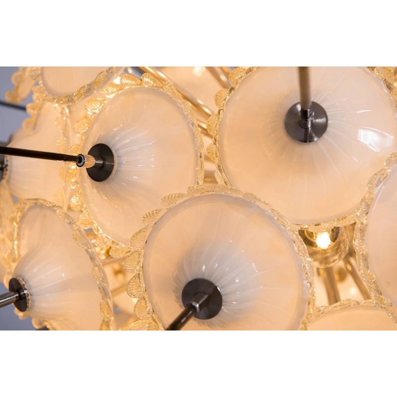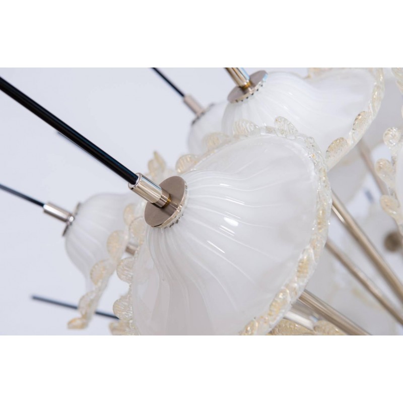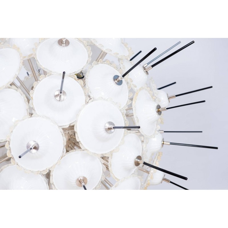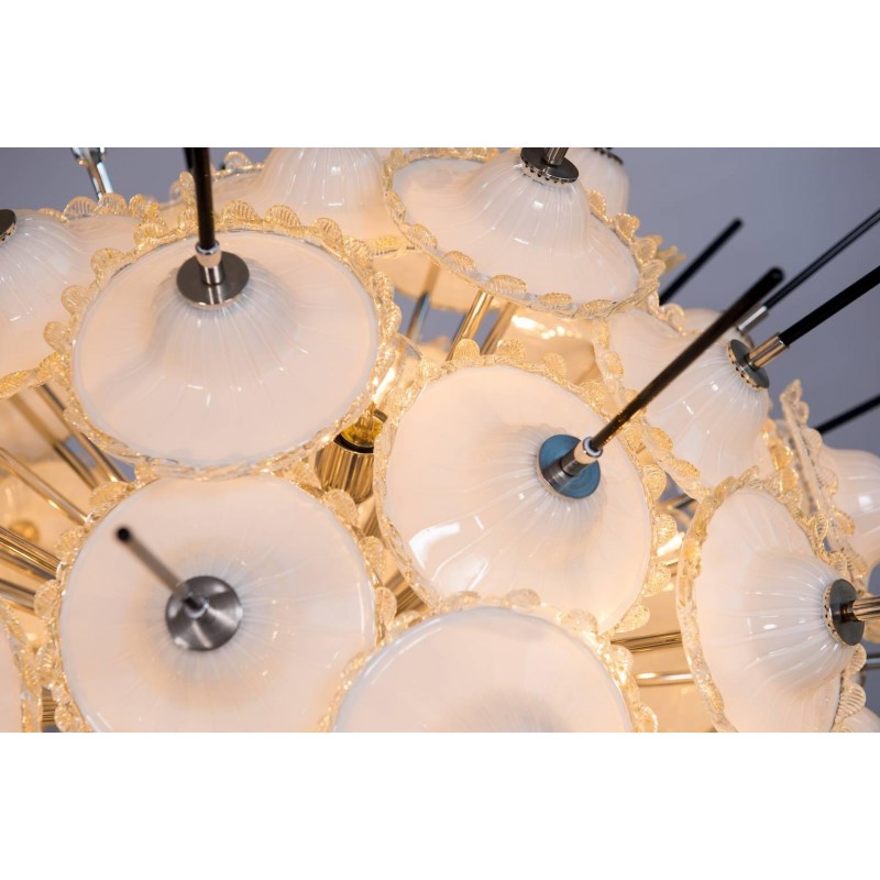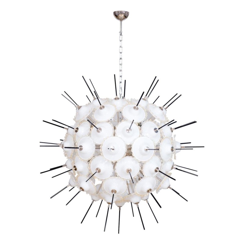 Imposing Sputnik Chandelier White Murano Glass and black elements 1970s Italy, Giovanni Dalla Fina production. Giant Sputnik chandelier in Murano glass is a masterpiece composed by milk color elegant cups with a 24-karat gold edge each. The outstanding decor elements are the black glass sticks decorating elements entirely in handcrafted Murano glass, located in each circular glass element. The masterpiece is a creation designed and manufactured by the artist Giovanni Dalla Fina, from 1970s in Art Deco. All elements are supported by a frame with twelve bulbs. The chandelier is in perfect conditions, as documented by the attached pictures. Currently, in the pictures, the flushmount is presented with a long simple chain, but different options are also available as chain colors and their decorations, as well with the opportunity to cover with a dedicated cloth all the chain length accordingly to your home decorations. Please, reach out us for any customized solution you would like to implement, we will more than happy to assist you in any request to enrich and make customizable for you the beauty of this masterpiece. It is part of the courtesy service the professional rewiring of the chandelier.