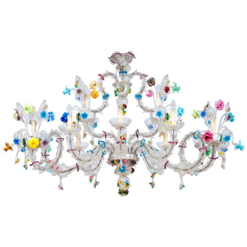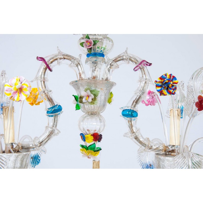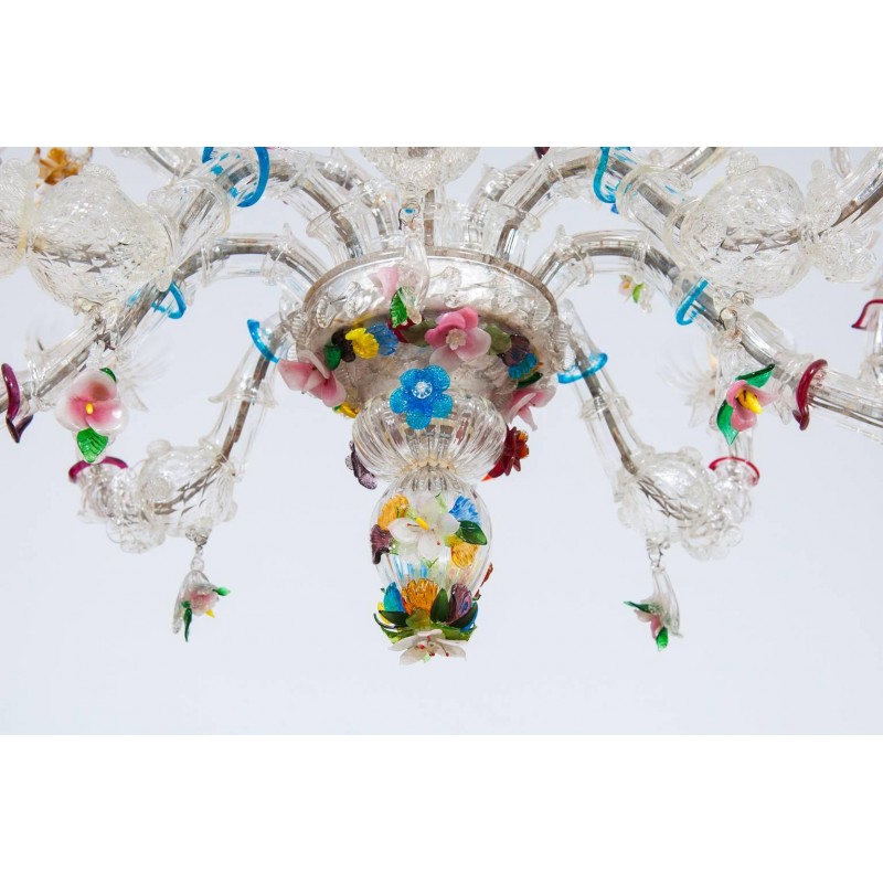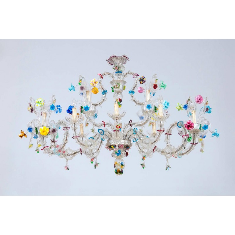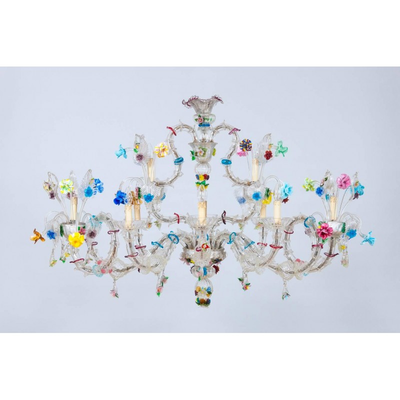 Elegant Murano Ca'Rezzonico Gondola chandelier in transparent color with multi-color refinishing, in excellent and original conditions. This an exclusive production entirely handcrafted in the Venetian Murano Island of Venice. The masterpiece is dated 1960s, composed by eight arms and with two additional fantastic twisted arms at the sides of the chandelier and with a gray original frame. All over the chandelier colorful flowers and leaves surrounding the beauty. The chandelier is 37.41 inch high, 29.92 inches deep, by 57.09 inches wide and having ten lights. The professional rewiring of the chandelier is part of our service.