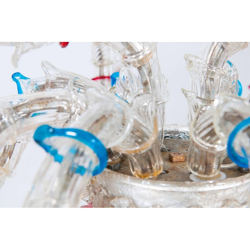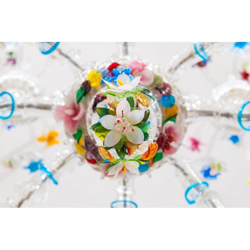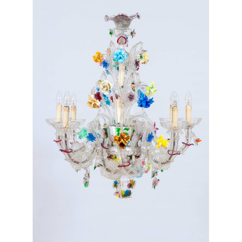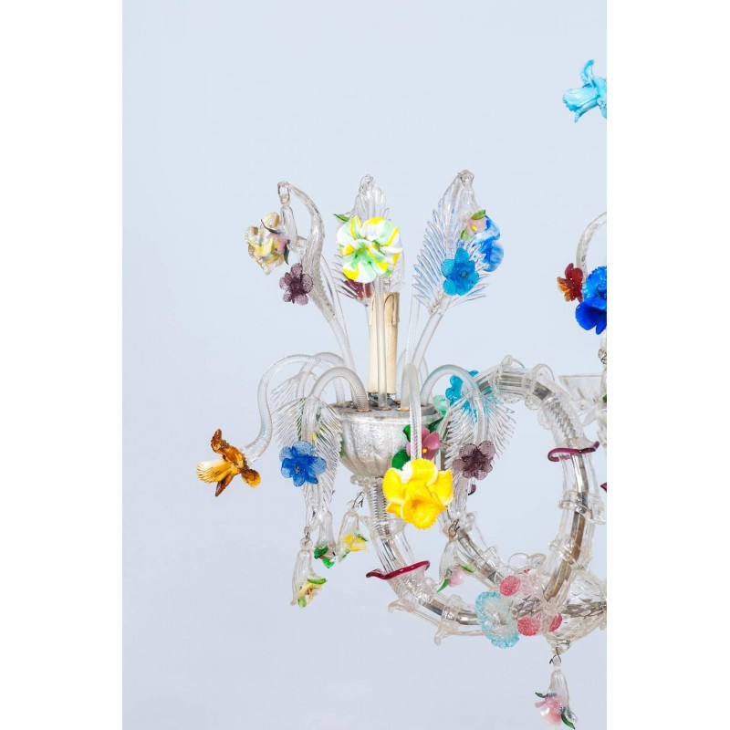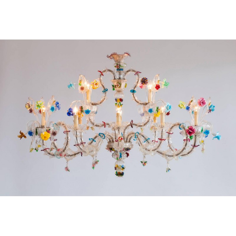 Elegant Murano Ca'Rezzonico Gondola chandelier in transparent color with multi-color refinishing, in excellent and original conditions. This an exclusive production entirely handcrafted in the Venetian Murano Island of Venice. The masterpiece is dated 1960s, composed by eight arms and with two additional fantastic twisted arms at the sides of the chandelier and with a gray original frame. All over the chandelier colorful flowers and leaves surrounding the beauty. The chandelier is 37.41 inch high, 29.92 inches deep, by 57.09 inches wide and having ten lights. The professional rewiring of the chandelier is part of our service.