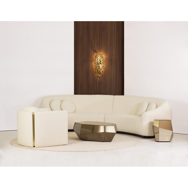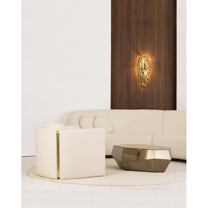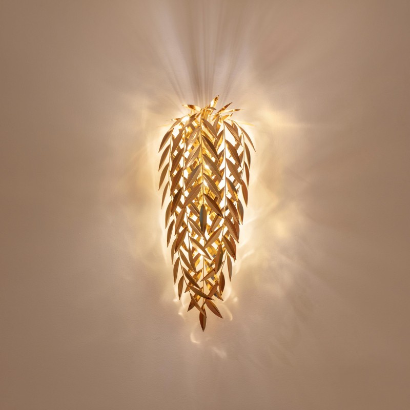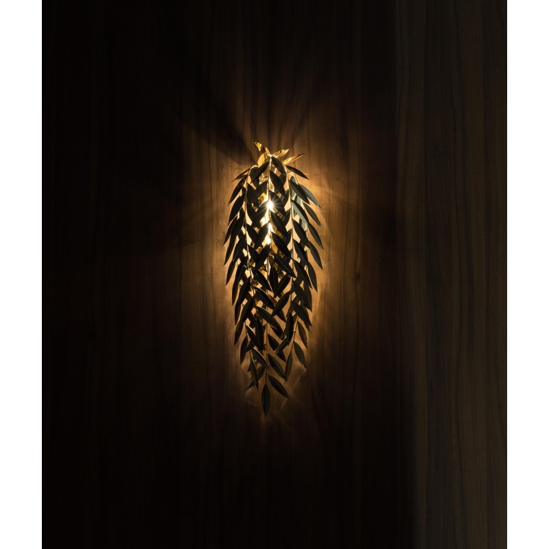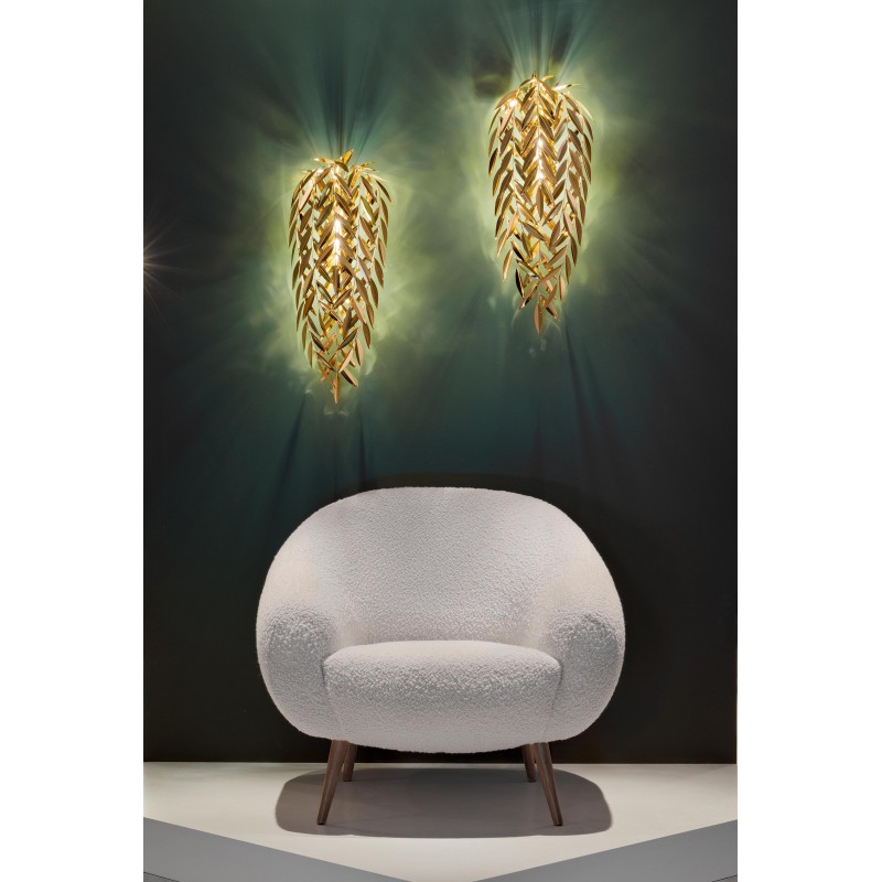 Best Lighting design at the iLuxury Awards 2021 Resulting from a trip S. Miguel, the Azores wall lamp recreates a weeping willow found near a lagoon and freezes a moment of contemplation.Born in the middle of the Atlantic Ocean, the archipelago of the Azores was formed by volcanic activity and belongs to the Portuguese territory. S. Miguel, the most exuberant of its islands, is a paradise covered in dense nature with hundreds of plant species that exhibit their different shades of green along the landscapes.The Azores wall lamp is a luxuriant lighting piece made with handcrafted brass leaves that subtly allow the rays of light to pierce them and illuminate the surroundings as a gift of nature.