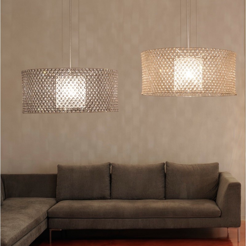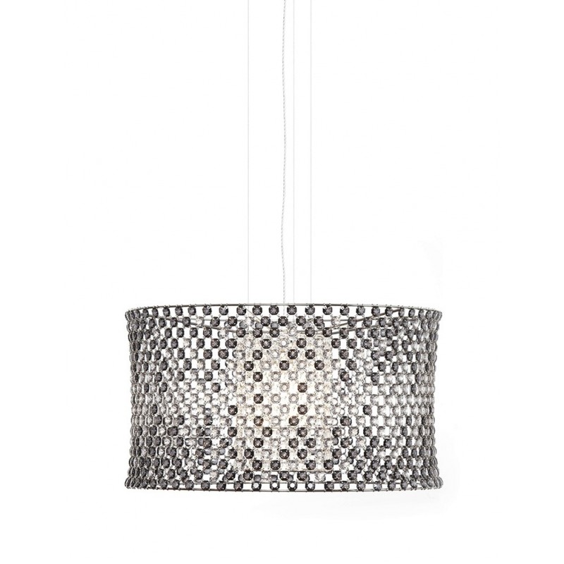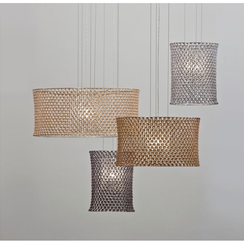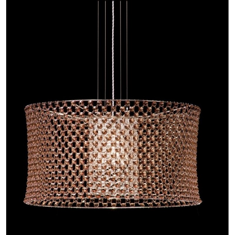 Crystals arranged in a continuous elastic surface, like a skin, cover a drum that has been geometrized to the bare essence of a metal skeleton. The arched profile reveals the secret, and the bejeweled mesh, so light as to not offer any resistance to the air itself, presents its tautness and symmetry as a touch of nature, as if waiting with bated breath.