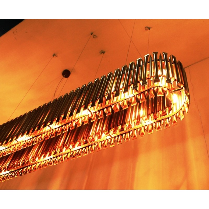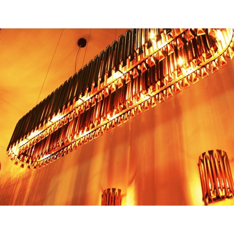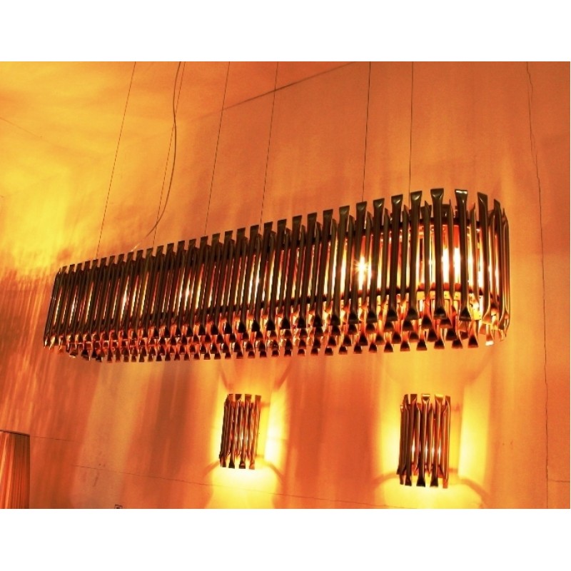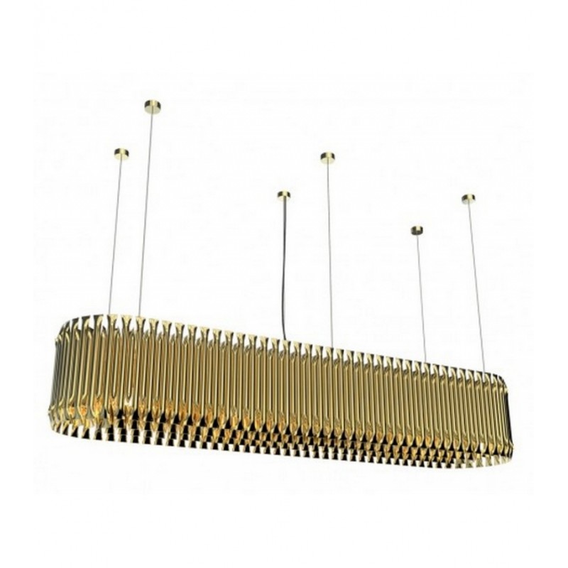 Feel the true statement of luxury with this modern ceiling lamp. Matheny is a unique chandelier, a new take on the mid-century classic. It has a geometric design of combined tubes and its structure is handmade in brass. Its shape is round and is composed by golden tubes, which reflect the sophistication of a timeless iconic lamp. With 110 pounds, this luxurious chandelier light can be used in a modern living room or as modern dining room lighting. All in all, Matheny round chandelier will certainly capture the attention of your guests.