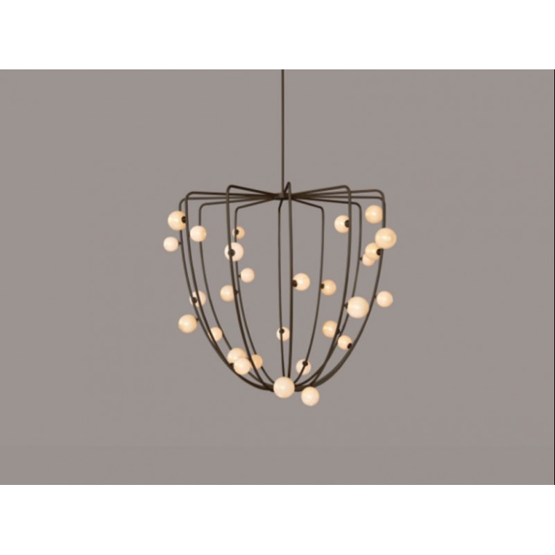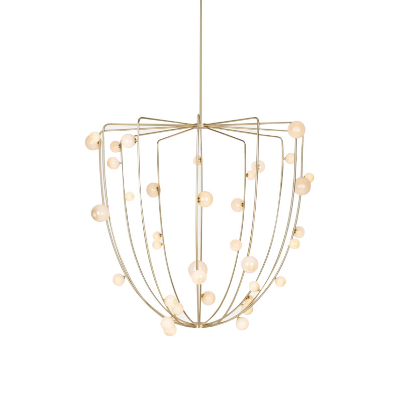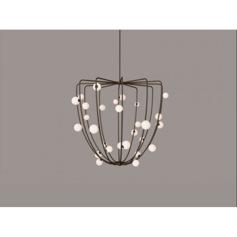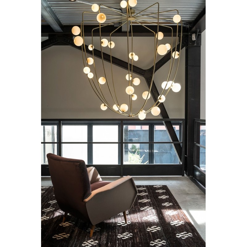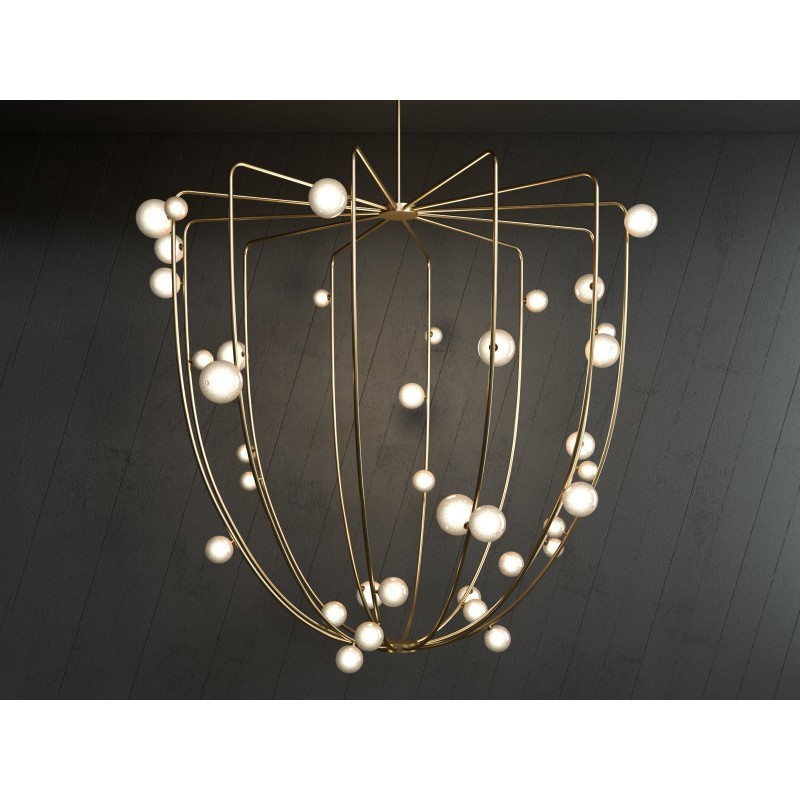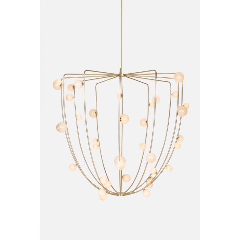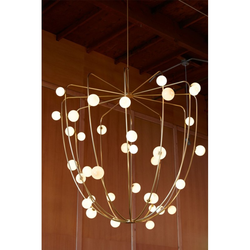 Cherry Bomb chandeliers feature oversized brass armatures and hand-blown mini-globes, recalling underwater cages and traps with small sea bubbles clinging to their surfaces. The Cherry Bomb collection is born with a passion for the spring blossoming Japanese trees that line grand boulevards throughout the world. Alan Mizrahi Lighting Design uses the latest technology, but also incorporates fine materials traditionally hand-crafted by local artisans. Each fixture is meant to be fully integrated, spreading a charming and enchanting play of light. Thus creating a constant interaction between the lamp and the surrounding space.