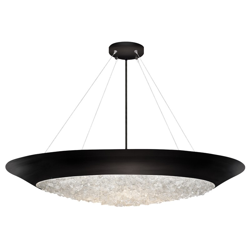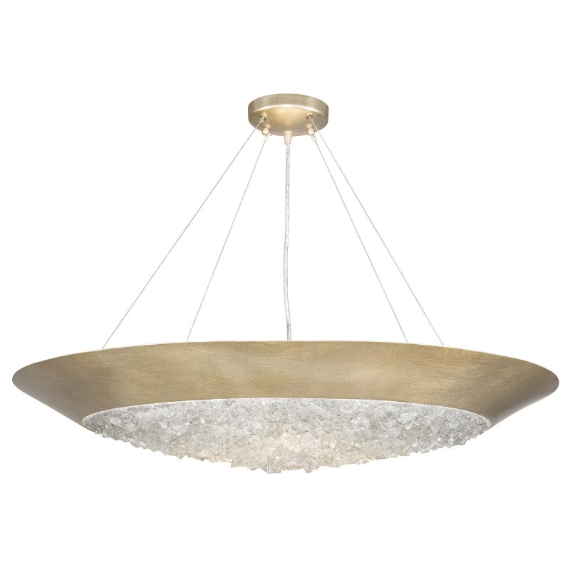 This chandelier in a silver leaf finish featuring hundreds of rough cut crystal glass gems that refract light in a manner reminiscent to the cirrus clouds ice crystals that form the lunar halo in the frozen night sky. Also available in tinted gold leaf or matte black. Crystal gems that refract light in a manner reminiscent to the cirrus clouds ice crystals that form the lunar halo in the frozen night sky.