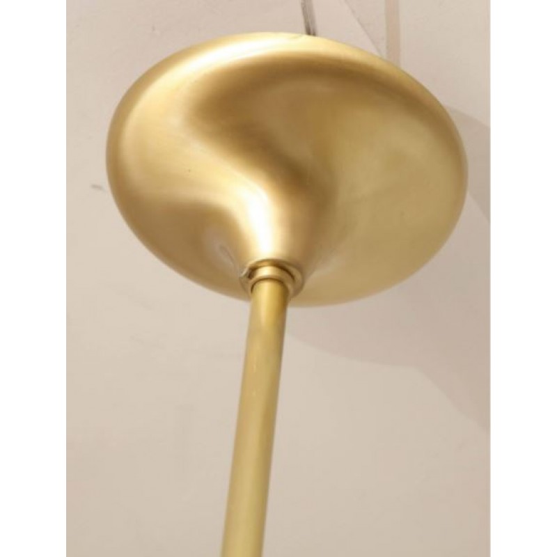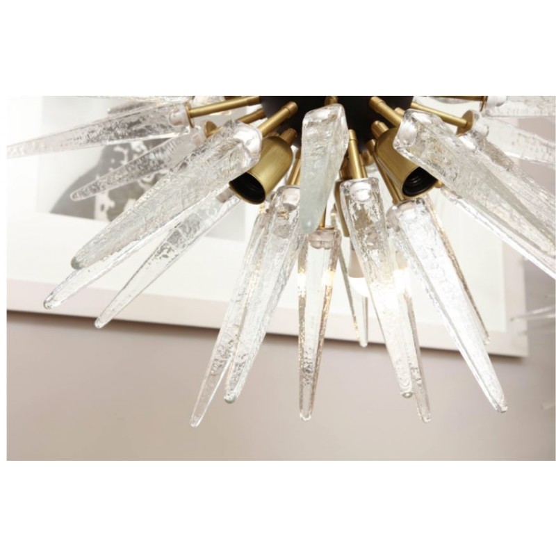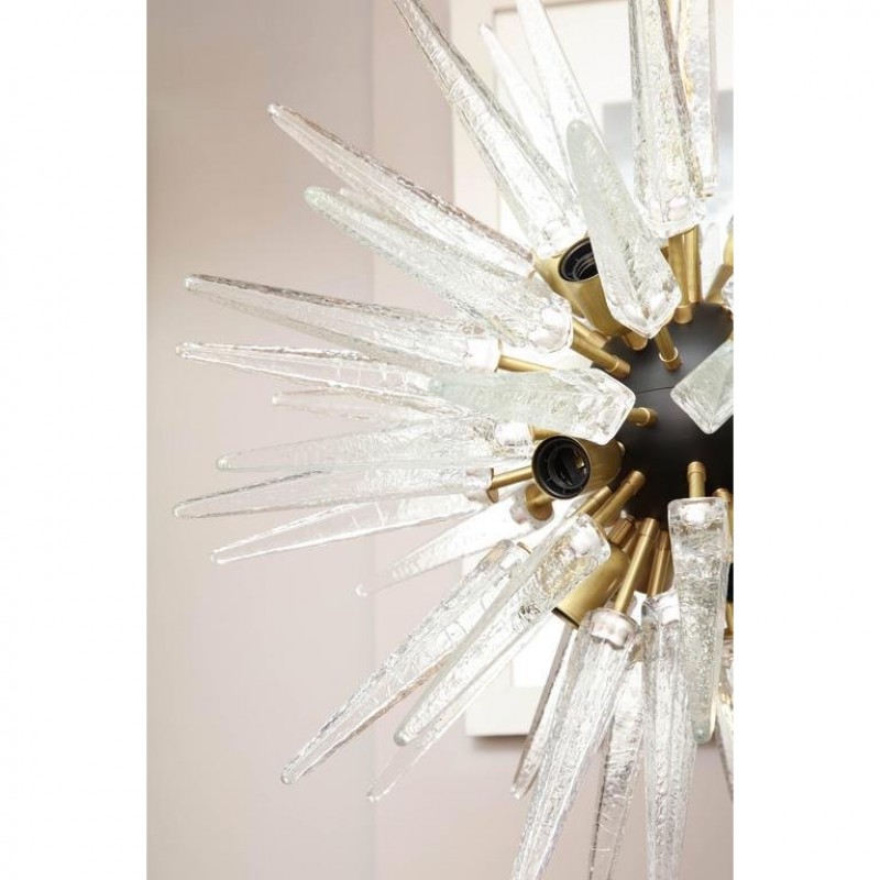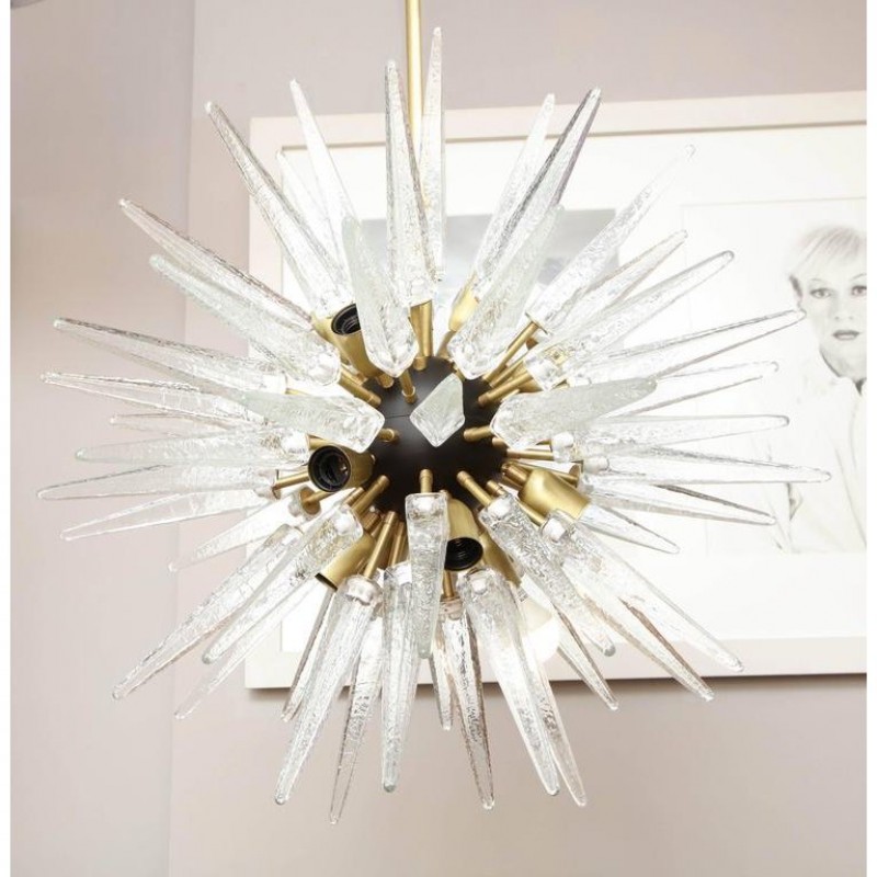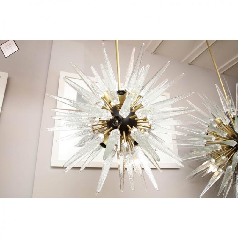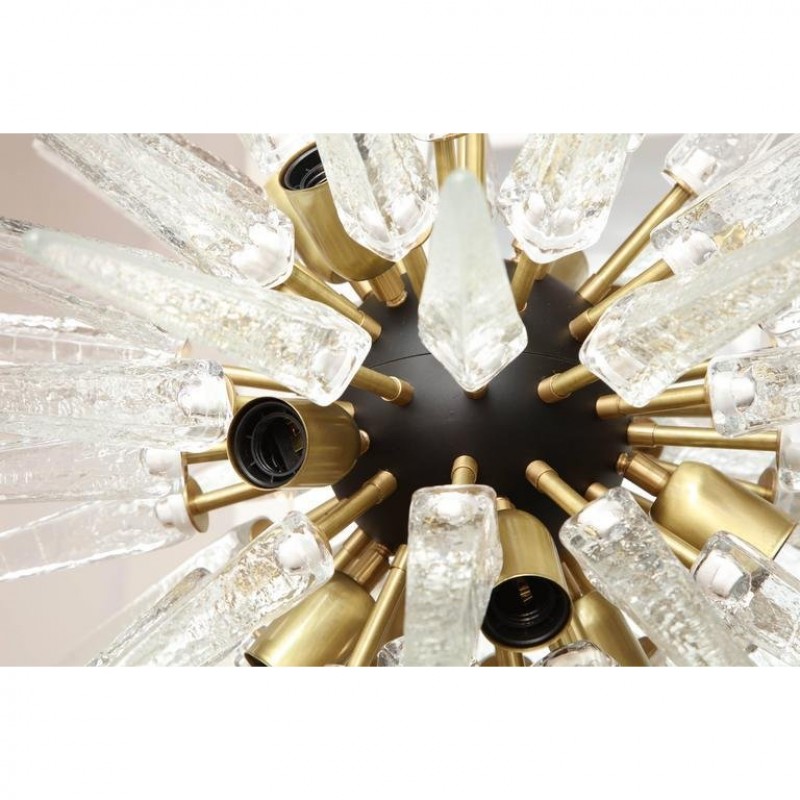 Designed to look like a shiny star created by Mother Nature, this piece is one piece that will not only stand out, but will provide an encompassing warming aura with its welcoming glow. Many decades of research and experimentation have led to the development of many exquisite glass finish options, including ribbed with slight obscurity, and the clean look of the crystal droplets. These can be created as hollow tubes to avoid weight issues. At Alan Mizrahi Lighting Design, we supply and manufacture many highly sought after designer pieces. All Chandeliers can be customized by number of lights, style, color and size to meet your specific needs.  This stunning and graphic modernist chandelier was realized in Murano, Italy-the islands off the coast of Venice renowned for centuries for their superlative quality glass. It features an abundance of hand blown Murano glass obelisks in a deep smoked graphite hue exploding from a central orb. The fixture attaches to the ceiling via a cylindrical rod in brushed brass and connects to a cylindrical canopy in the same material. With its timelessly elegant and dramatic form, this chandelier would be a winning addition to any style of interior, from Classic Mid-Century Modern to contemporary.
