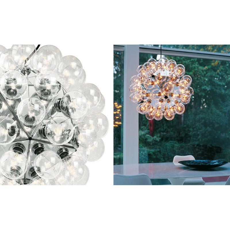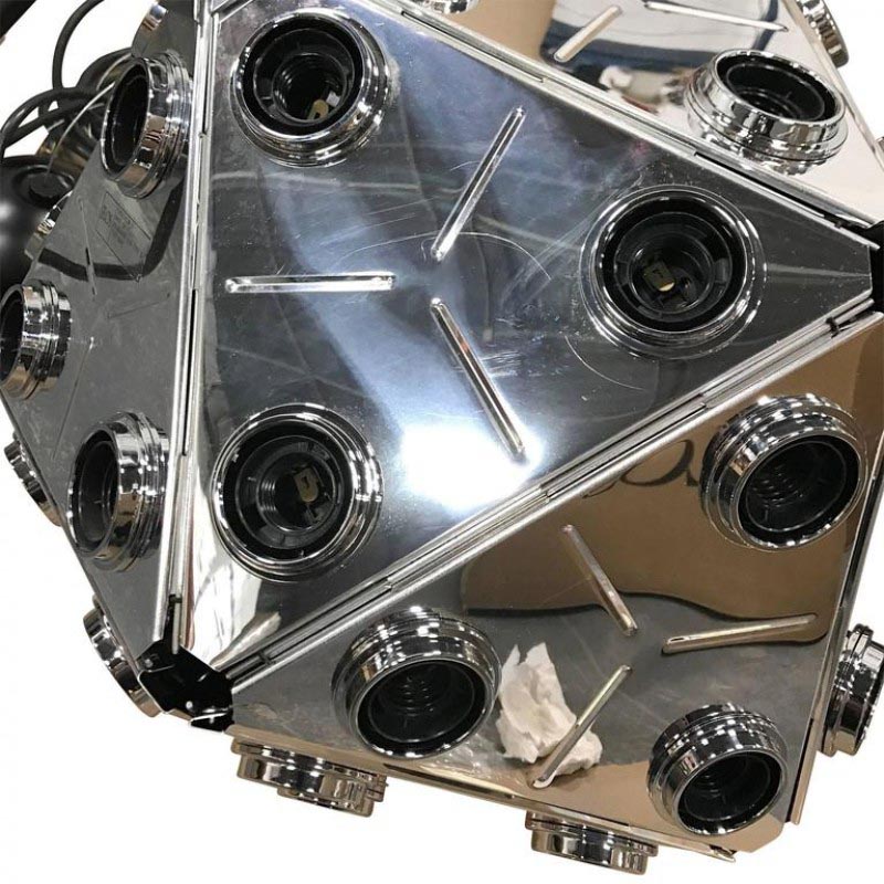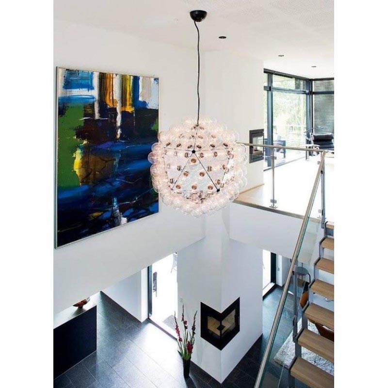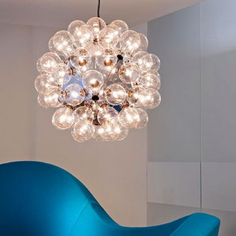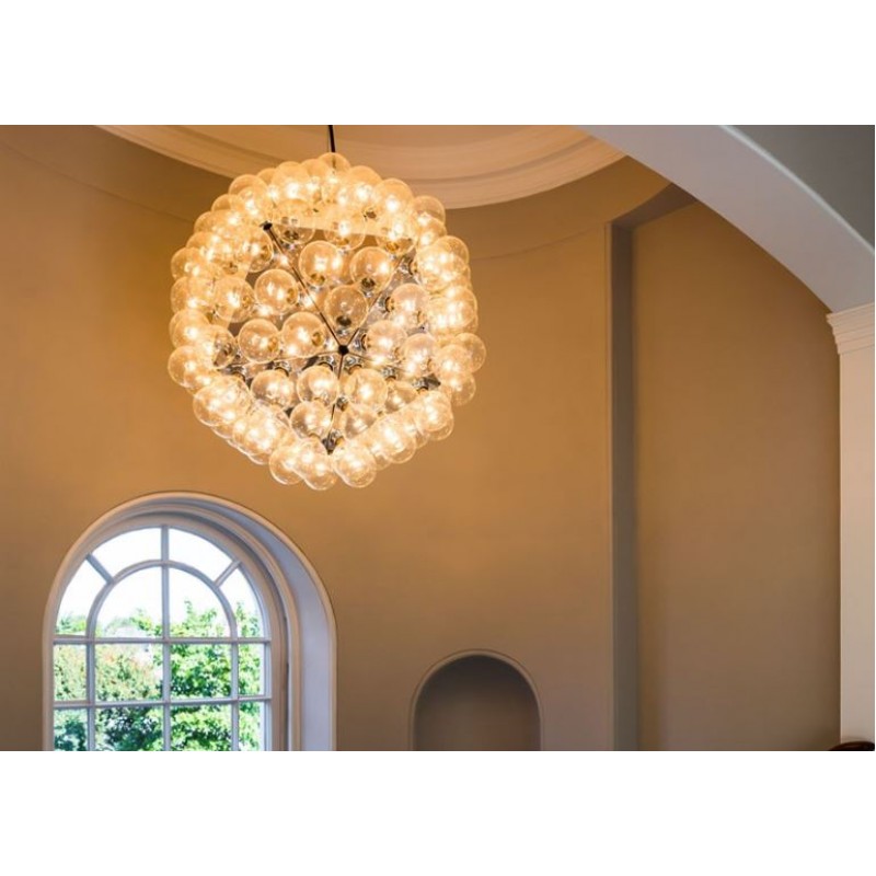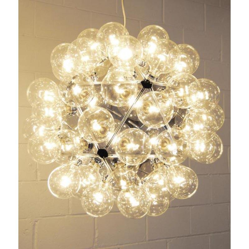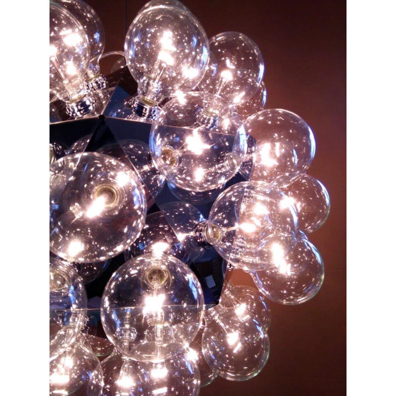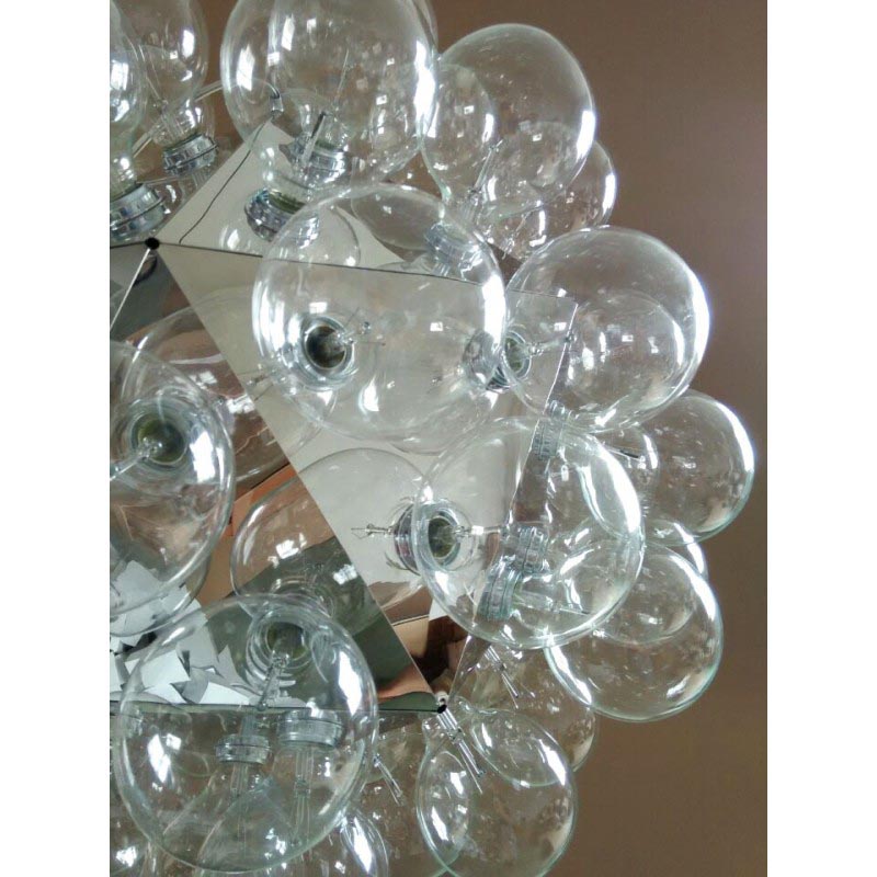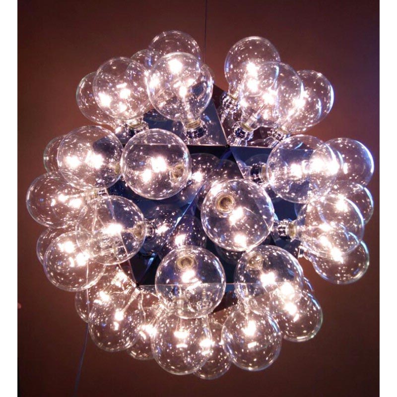Give your space a wonderful upgrade with this"Taraxacum 88” chandelier designed by Achille Castigloni. This dreamy epitome of luxury at its finest is a striking mix of contemporary style with modern appeal. This piece is composed from a basic frame with triangle shapes morphed around it in a flawless fashion that forms the multifaceted base for the clear globes that make up most of the piece. In each equilateral triangle are electrical sockets that hold the bulb globes. These globes reflect off the triangles underneath them giving you not only direct light, but reflected light as well. The lighting fixtures designed by this talented innovator gives us the illusion of floating lighting pieces, which is both futuristic, yet timelessly stunning. As you can see, Castiglioni's imaginative forms and melding of different styles have made him one of the most infamous and influential people in Italian design. The fusion of the fixture's modern shape, which blooms into an space-inspired dandelion shape, blend of elegant clear color and clean finish place this piece into a very modern and glamourous category of its own. When you're looking for a beautiful piece that is decadent yet contemporary, consider this “The One” to cherish for years to come.