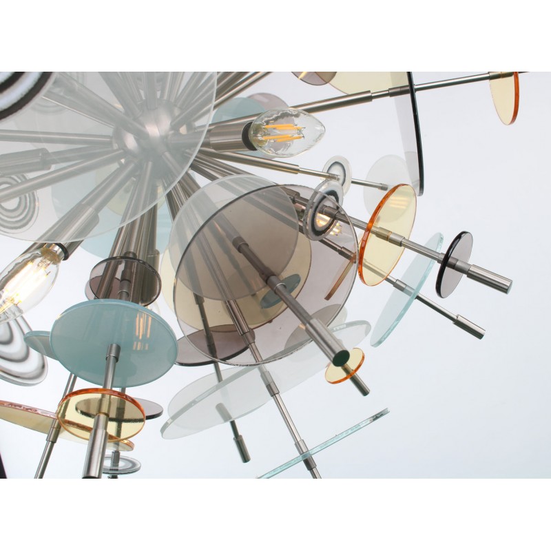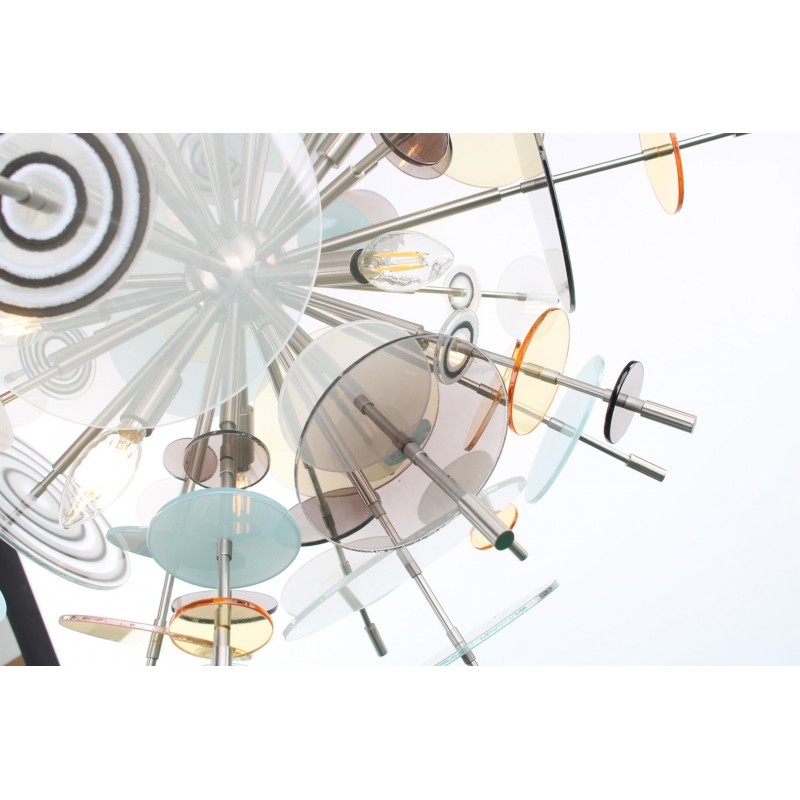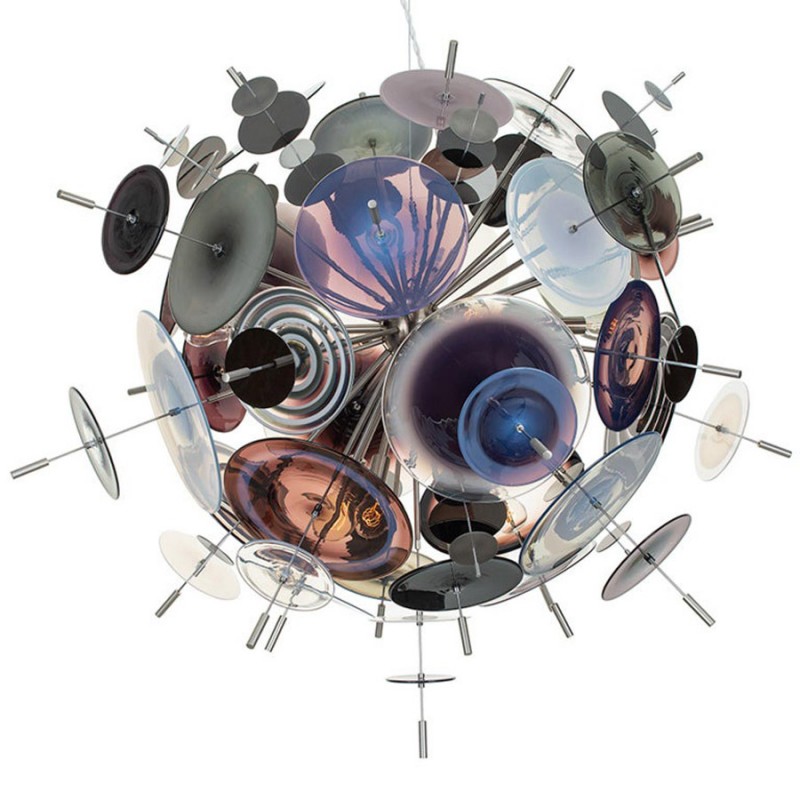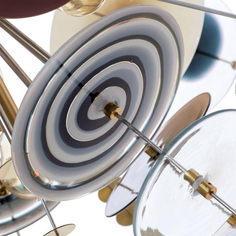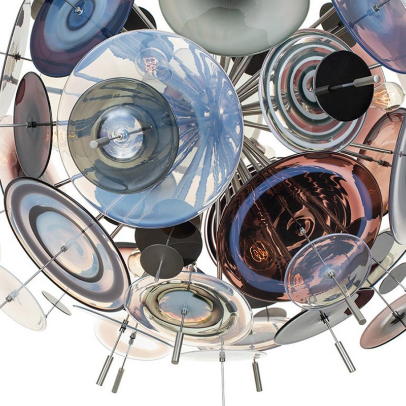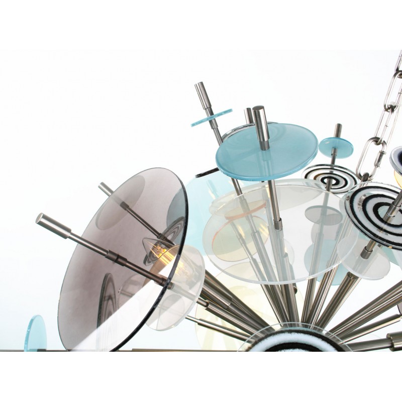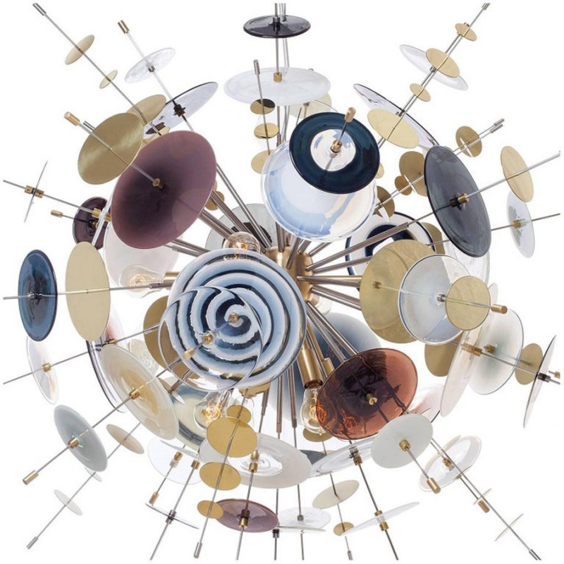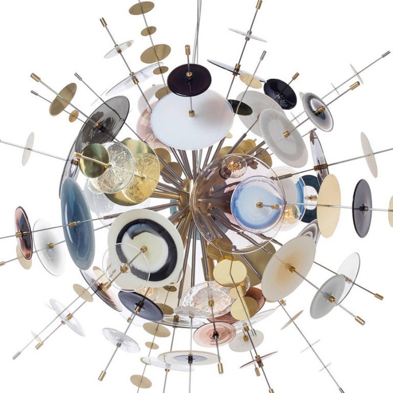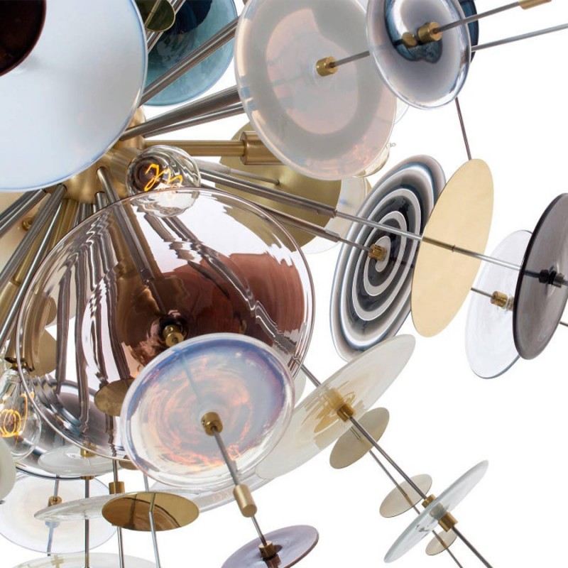 The Confetti glass chandelier features handblown glass discs in a variety of color palettes with a choice of metallic accents. Pictured: black, topaz, charcoal, dove, lilac, opaline, and white. Colors can be selected from existing palates, specified individually or fully customized. Please contact the studio for more information on a custom palette. Because our lighting is made by a workforce that still relies on traditional working methods, each product is unique and carries with it the sensitivity of the artisan. The pertinence of contemporary style lies in its functionality unpredictability. Our company provides collections that can make all your project dreams come true.