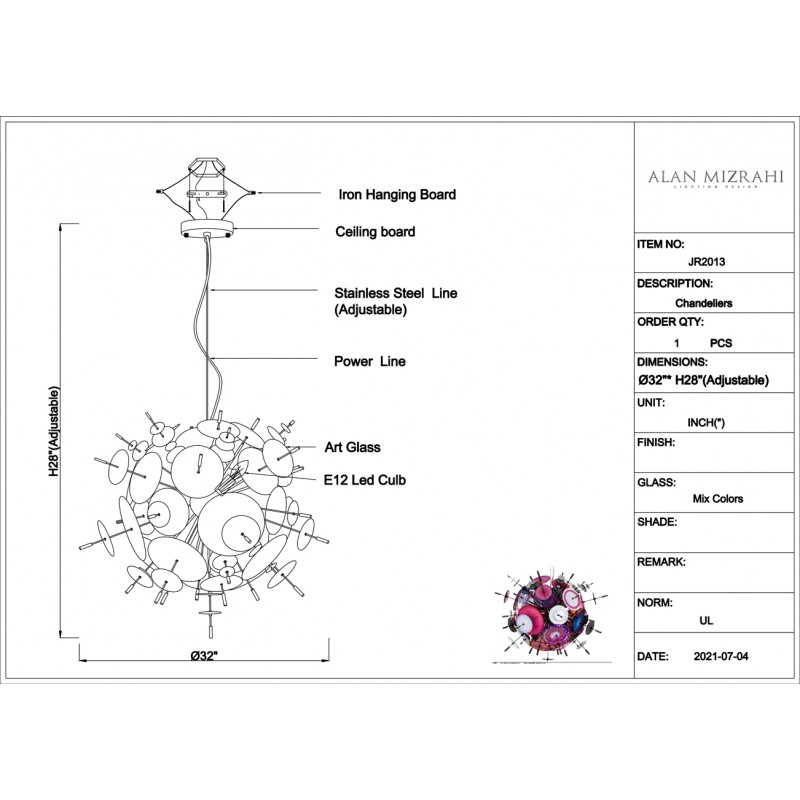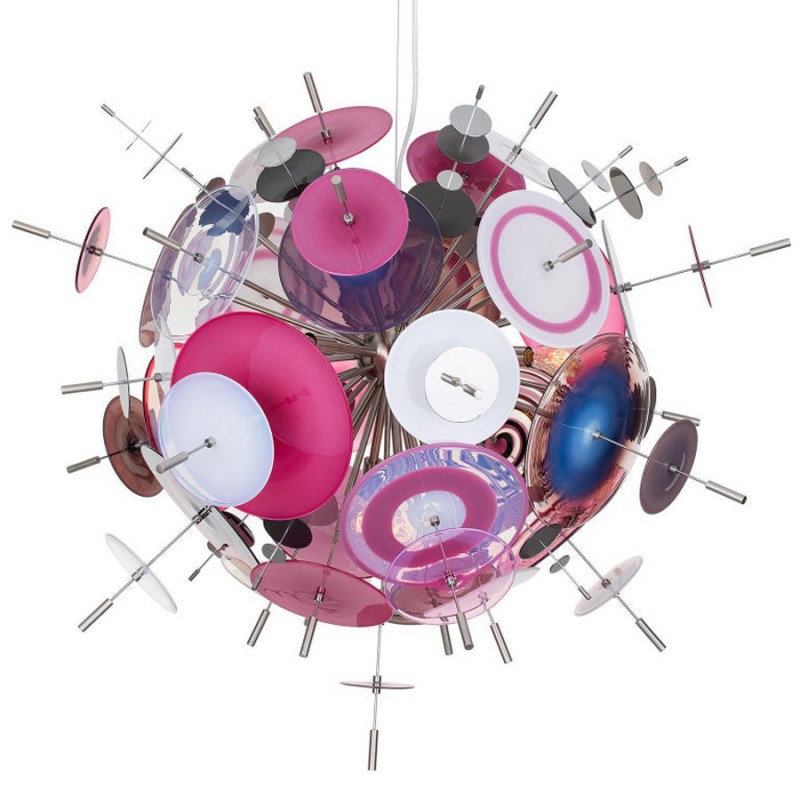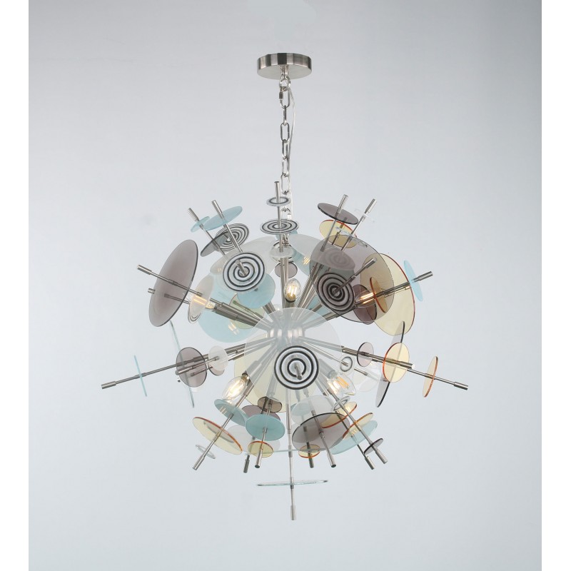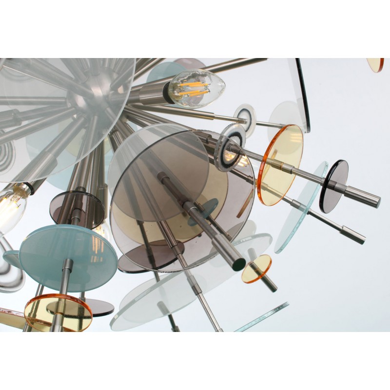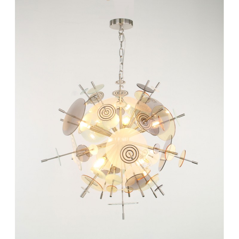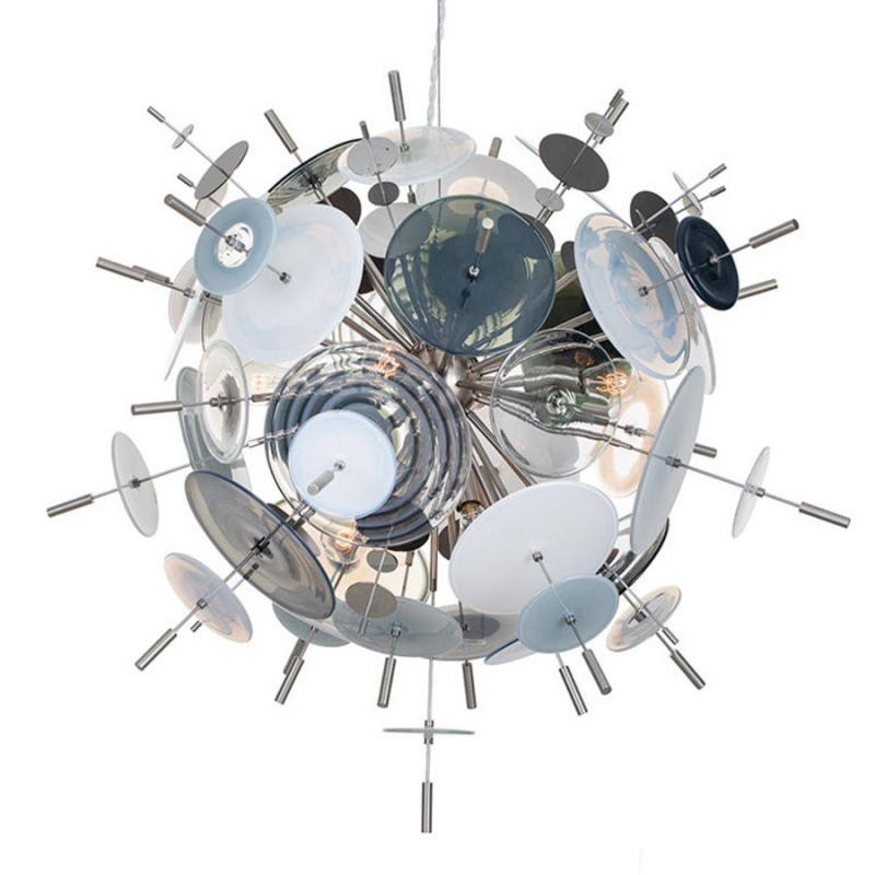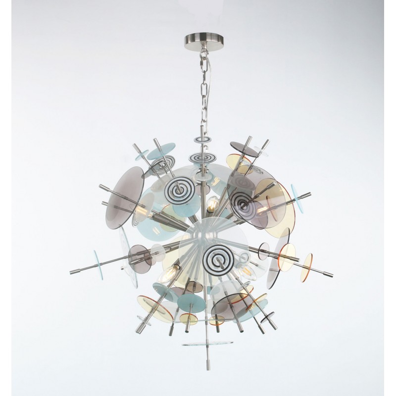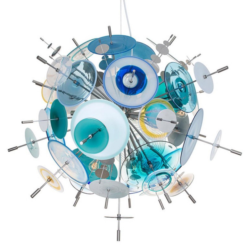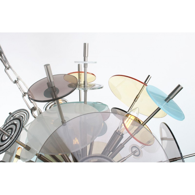 The Confetti glass chandelier features handblown glass discs in a variety of color palettes with a choice of metallic accents. Pictured: black, topaz, charcoal, dove, lilac, opaline, and white. Colors can be selected from existing palates, specified individually or fully customized. Please contact the studio for more information on a custom palette. Because our lighting is made by a workforce that still relies on traditional working methods, each product is unique and carries with it the sensitivity of the artisan. The pertinence of contemporary style lies in its functionality unpredictability. Our company provides collections that can make all your project dreams come true.