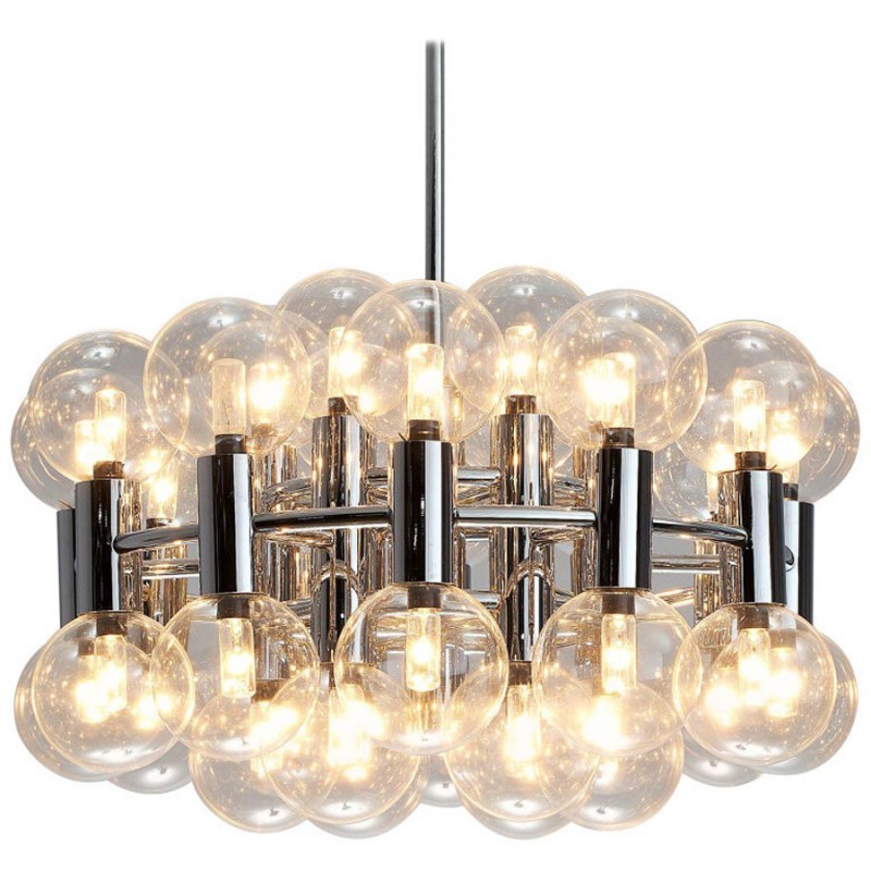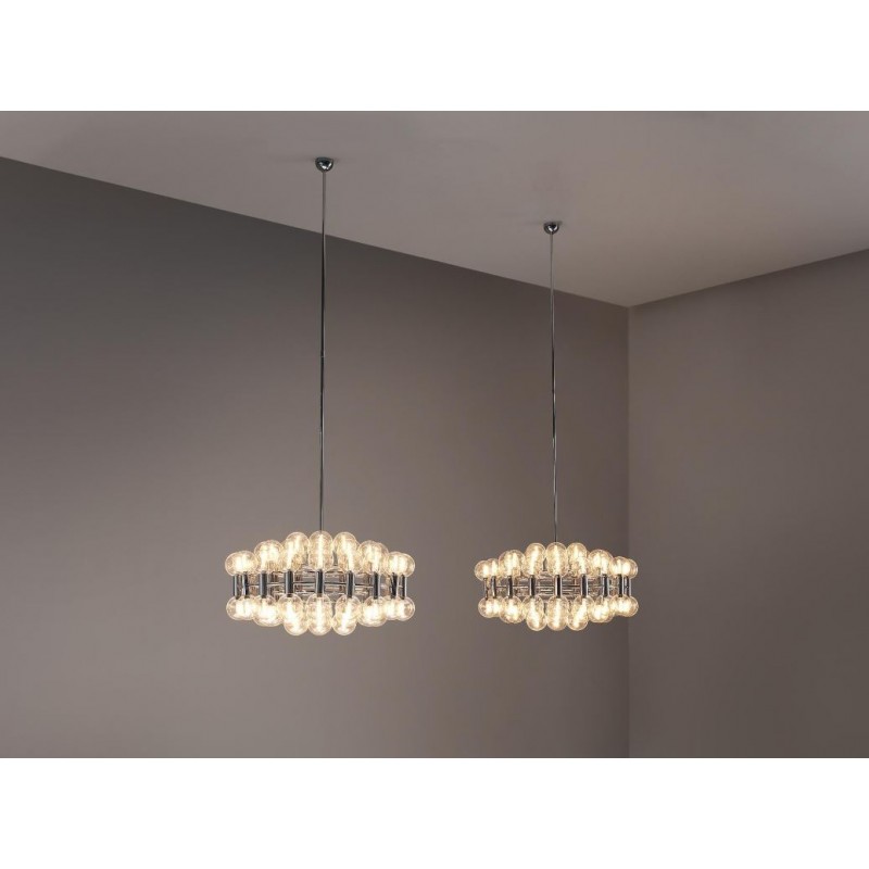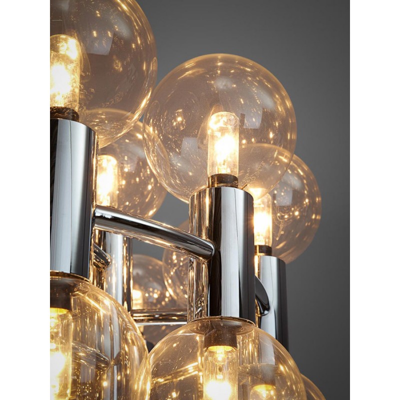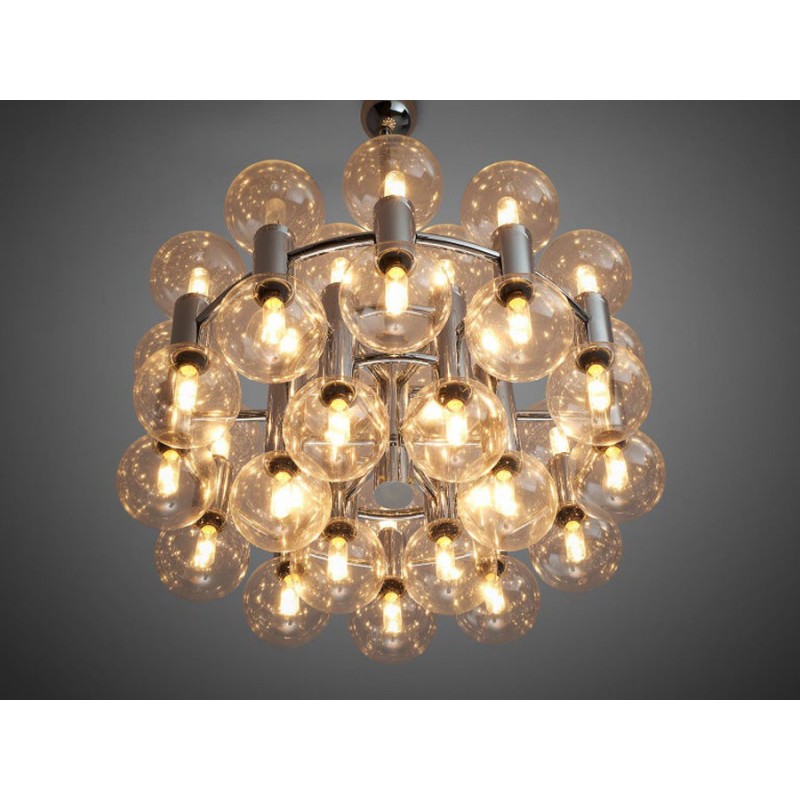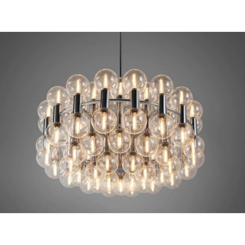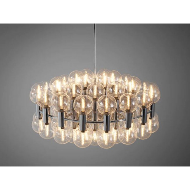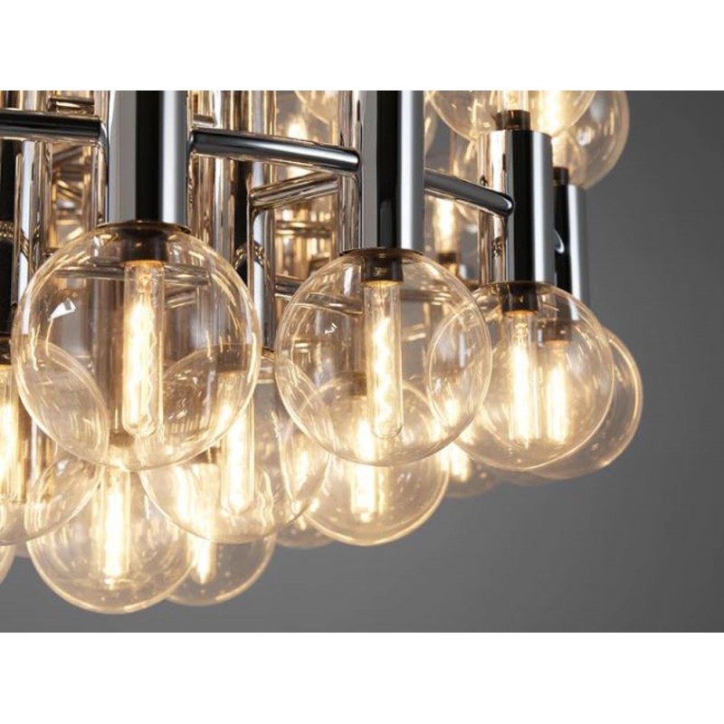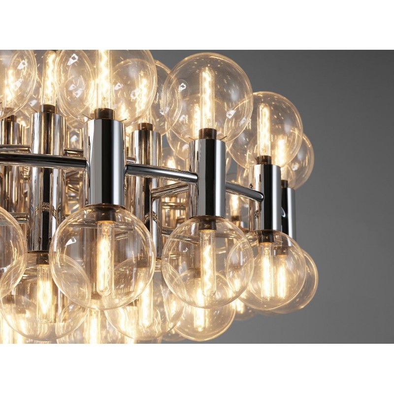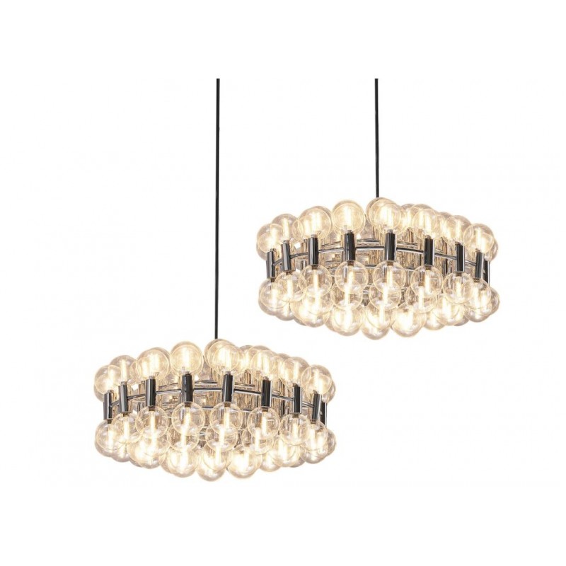 This chandelier spreads the light of the large amount of 37 spheres, divided over two levels. The metal frame is chrome-colored, which beautifully combines with the clear glass spheres. The ball-shaped shades have exceptional color, they are like pearls. Combined color and material, these chandeliers create a stunning light partition and spread a nice warm and diffuse light. We really like to play with light and shadow to create an atmosphere within an interior space. Not only does proper illumination add basic functionality, but it can also contribute to an overall design style and act as a tool to highlight different features or create the perfect ambiance.