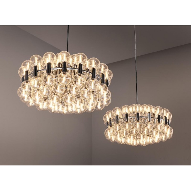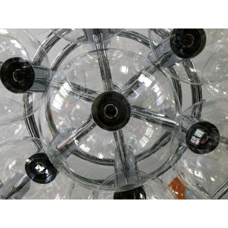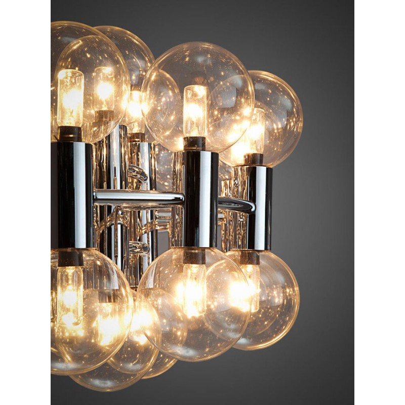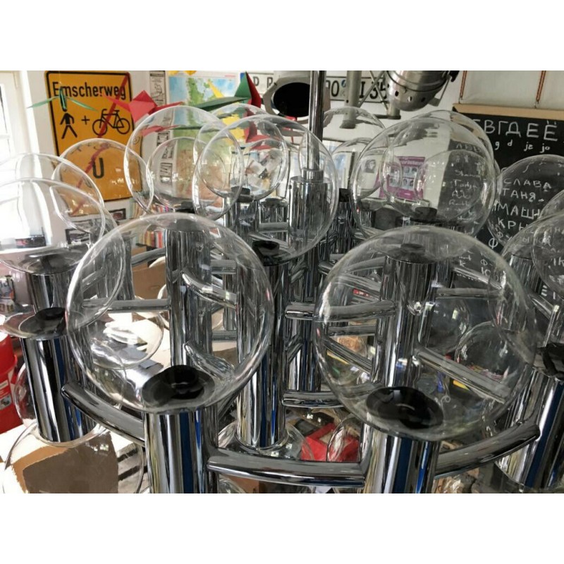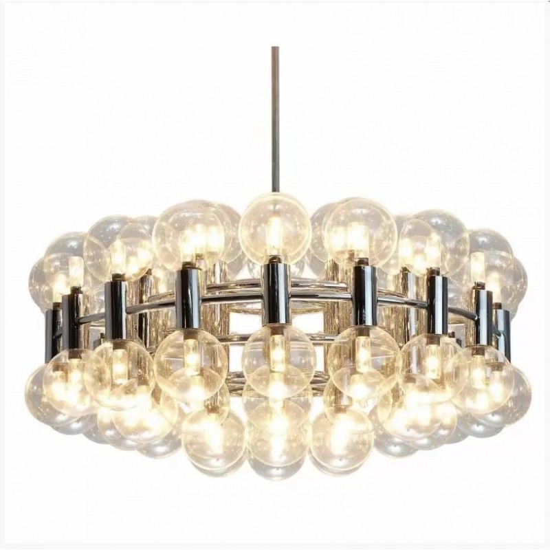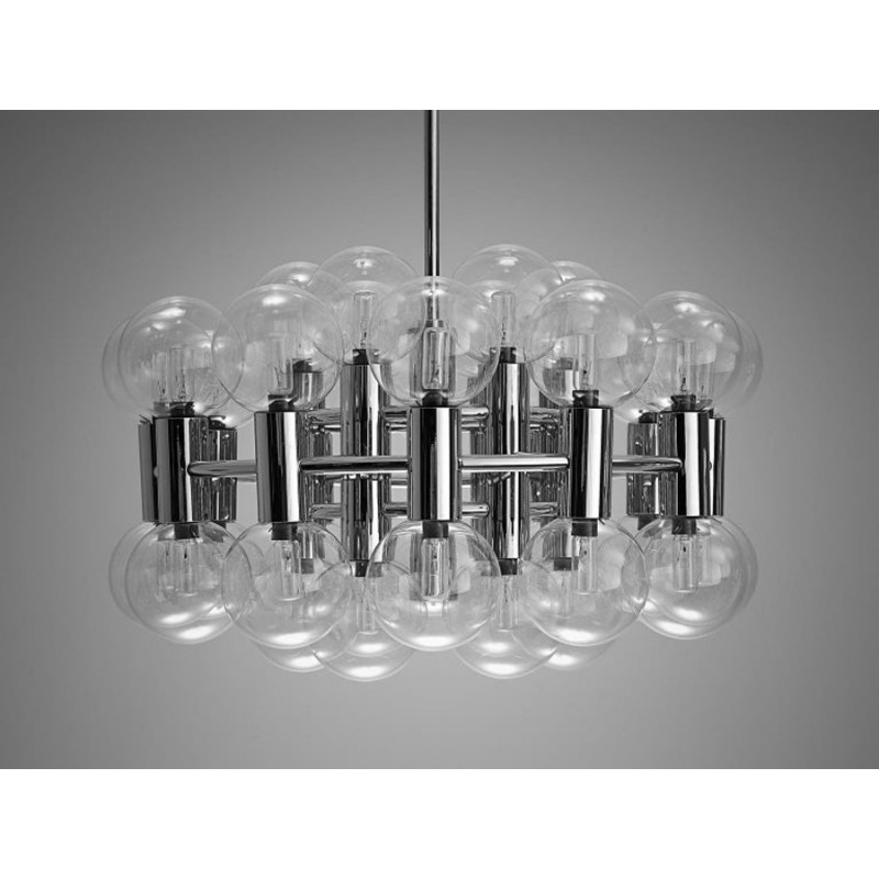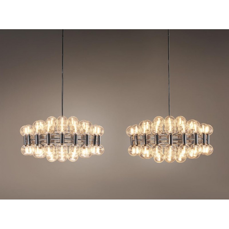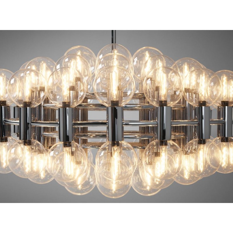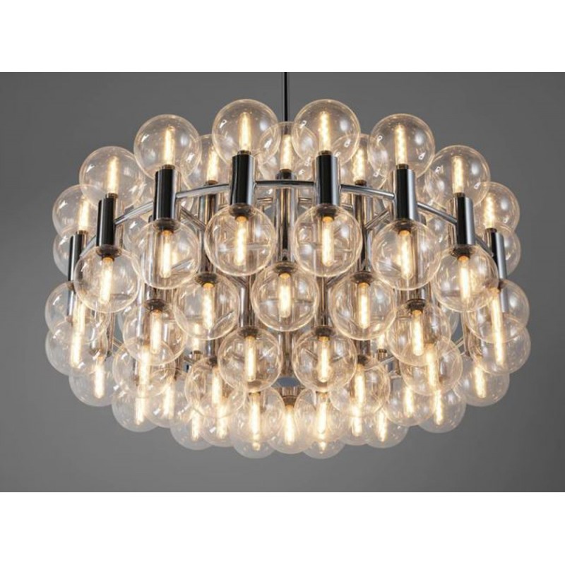 This chandelier spreads the light of the large amount of 37 spheres, divided over two levels. The metal frame is chrome-colored, which beautifully combines with the clear glass spheres. The ball-shaped shades have exceptional color, they are like pearls. Combined color and material, these chandeliers create a stunning light partition and spread a nice warm and diffuse light. We really like to play with light and shadow to create an atmosphere within an interior space. Not only does proper illumination add basic functionality, but it can also contribute to an overall design style and act as a tool to highlight different features or create the perfect ambiance.