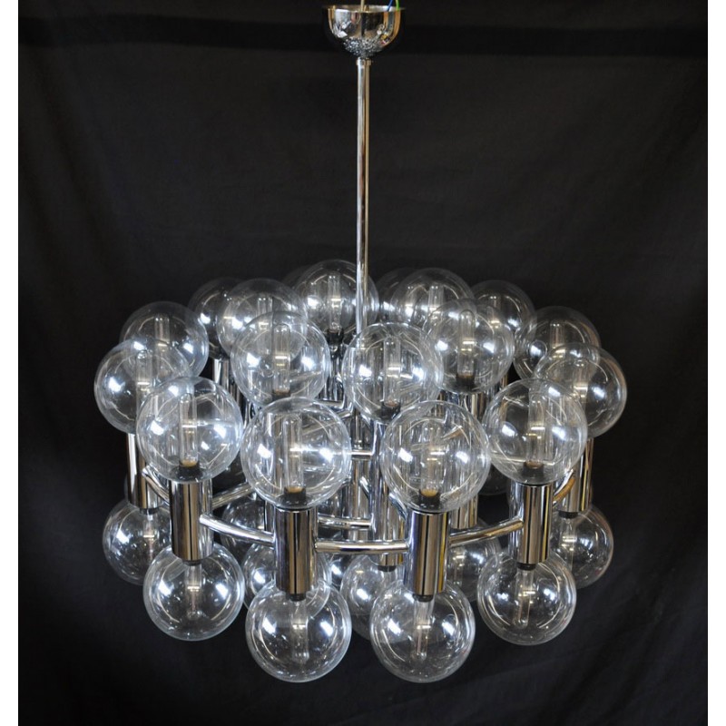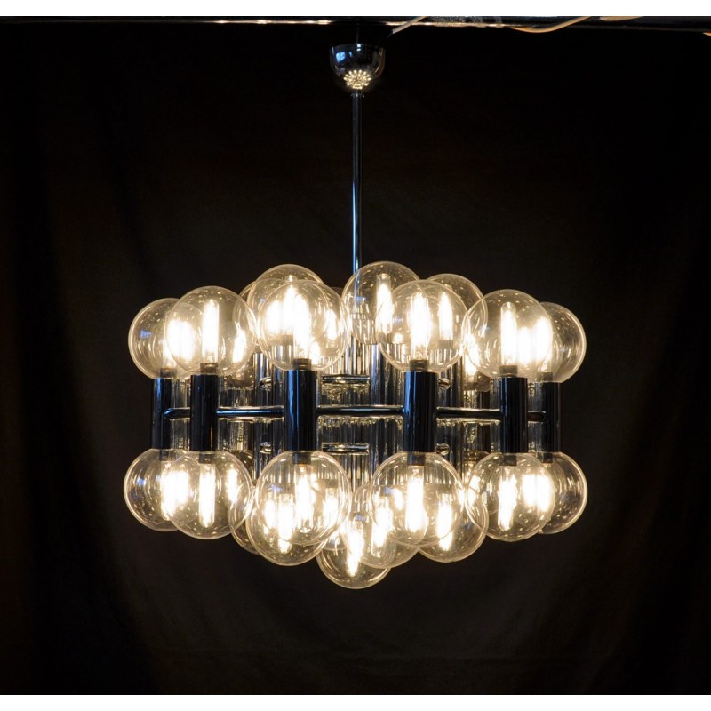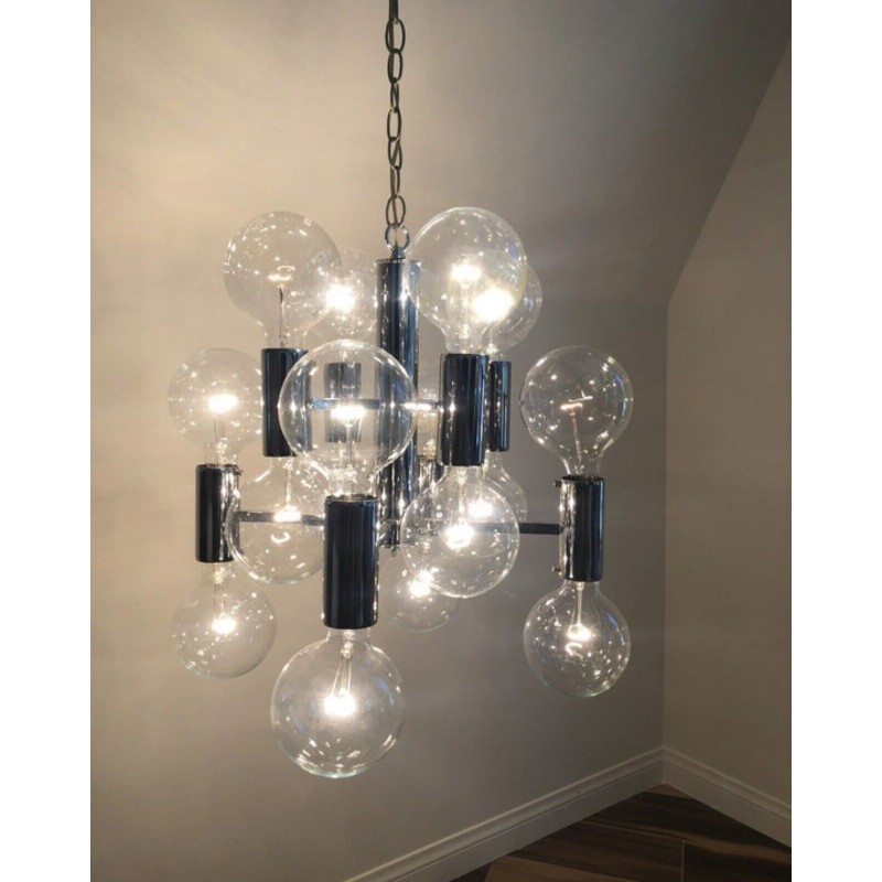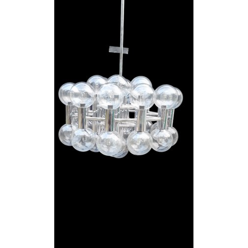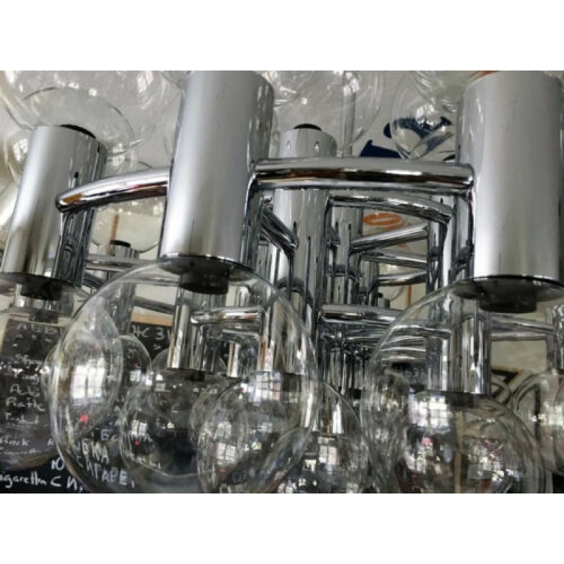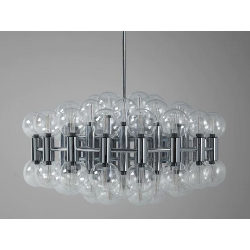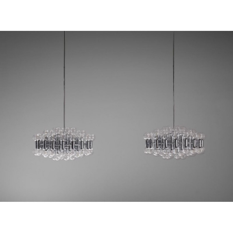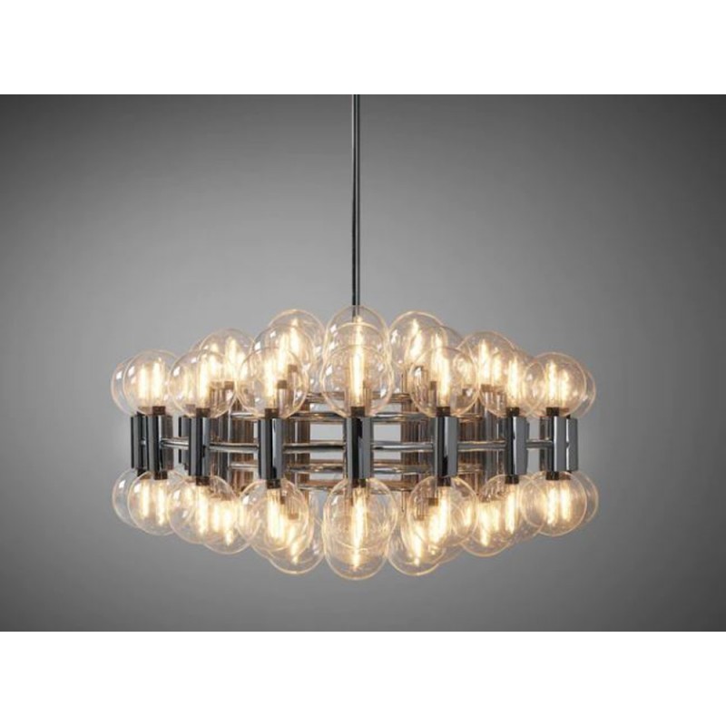 This chandelier spreads the light of the large amount of 37 spheres, divided over two levels. The metal frame is chrome-colored, which beautifully combines with the clear glass spheres. The ball-shaped shades have exceptional color, they are like pearls. Combined color and material, these chandeliers create a stunning light partition and spread a nice warm and diffuse light. We really like to play with light and shadow to create an atmosphere within an interior space. Not only does proper illumination add basic functionality, but it can also contribute to an overall design style and act as a tool to highlight different features or create the perfect ambiance.