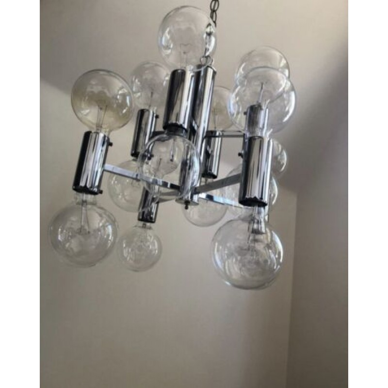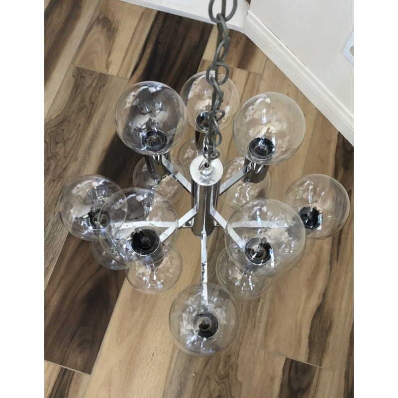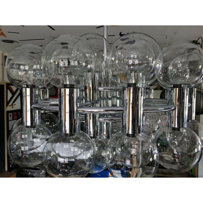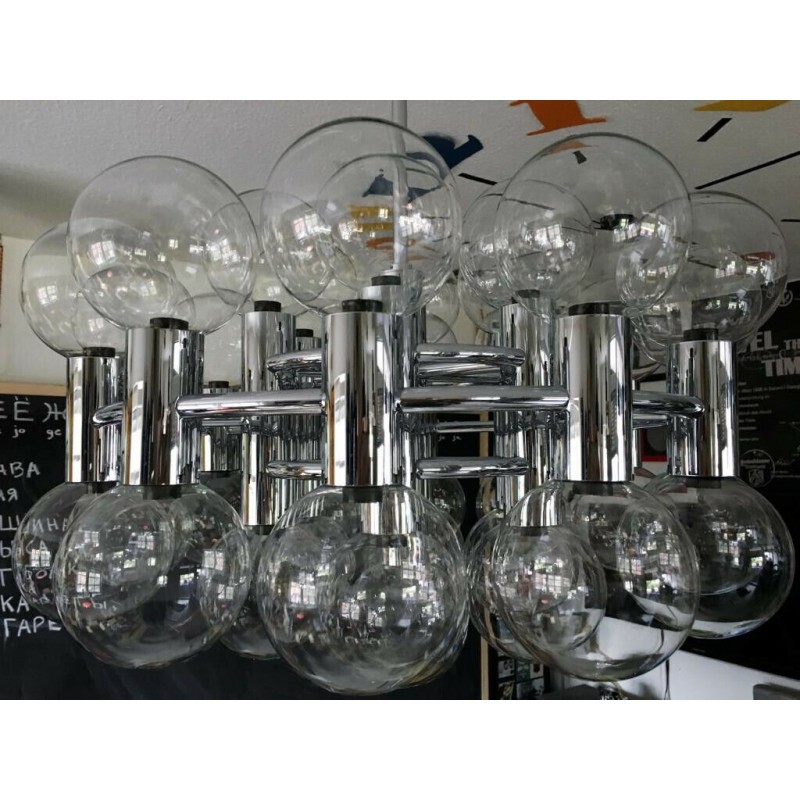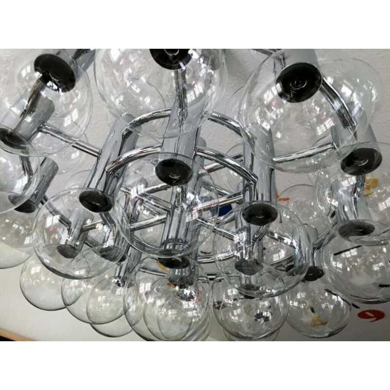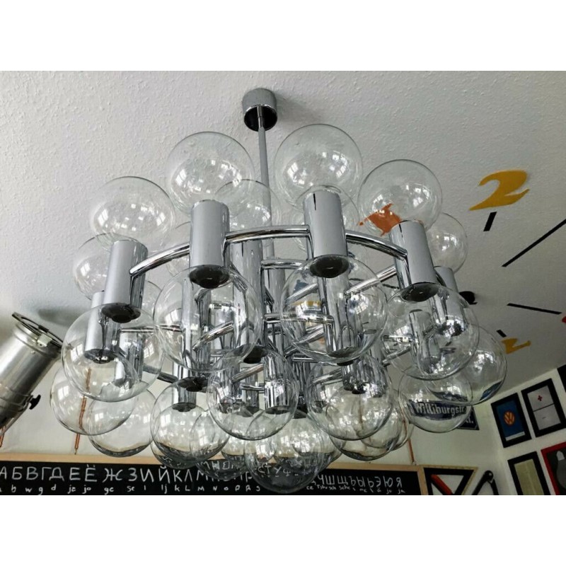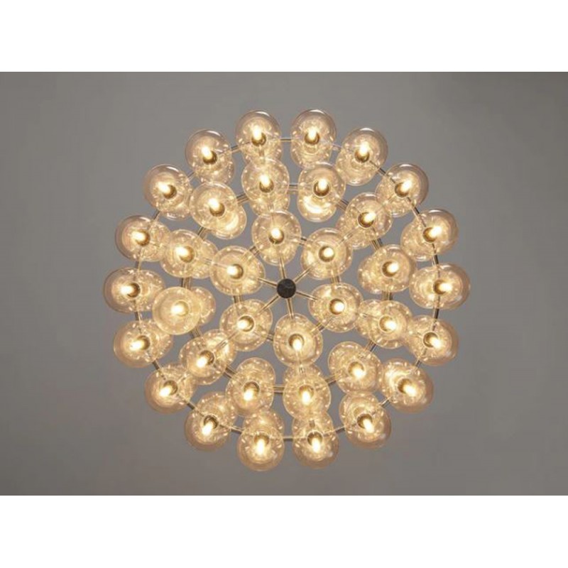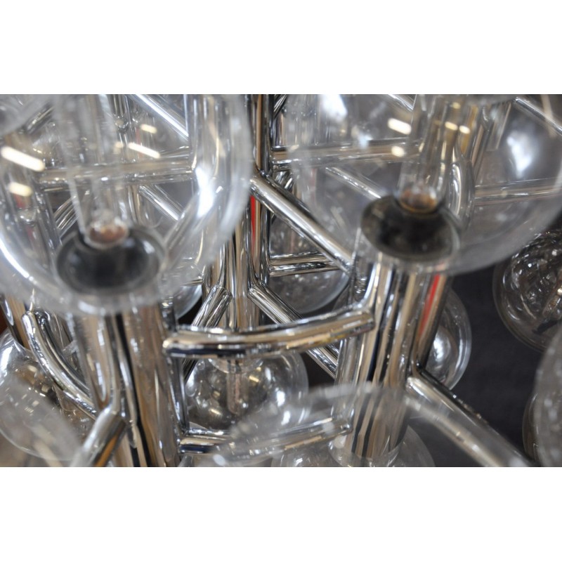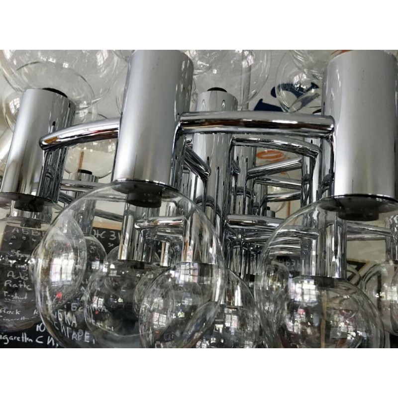 This chandelier spreads the light of the large amount of 37 spheres, divided over two levels. The metal frame is chrome-colored, which beautifully combines with the clear glass spheres. The ball-shaped shades have exceptional color, they are like pearls. Combined color and material, these chandeliers create a stunning light partition and spread a nice warm and diffuse light. We really like to play with light and shadow to create an atmosphere within an interior space. Not only does proper illumination add basic functionality, but it can also contribute to an overall design style and act as a tool to highlight different features or create the perfect ambiance.