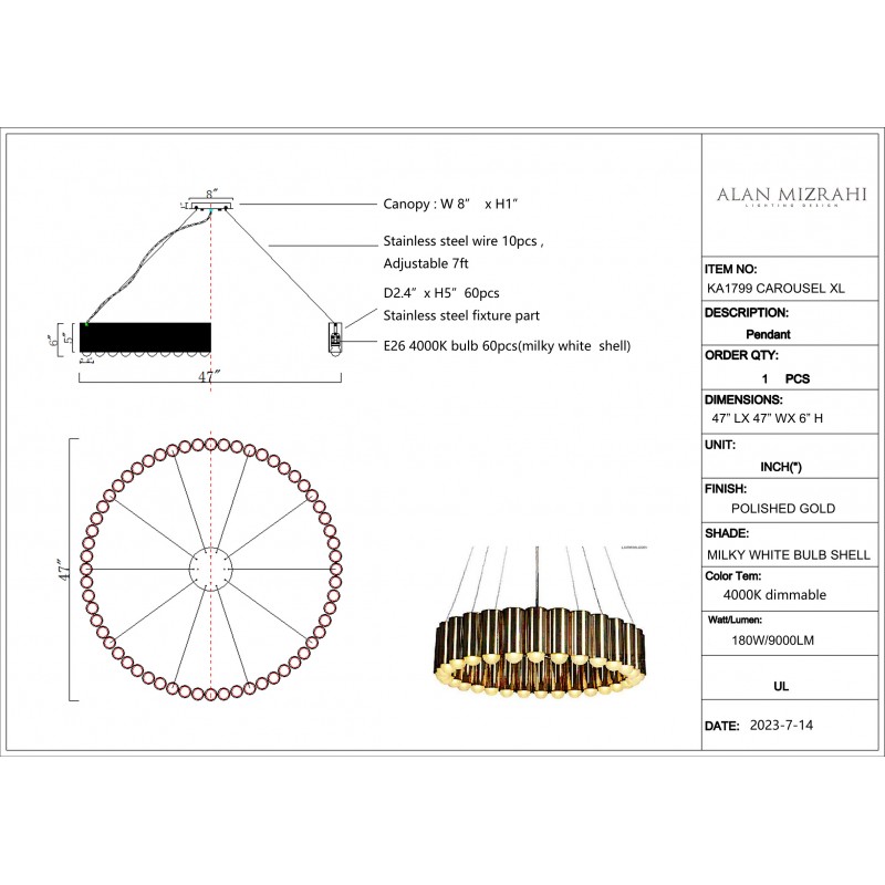 Inspired by the merry-go-round ride of a traditional British fairground, Carousel is a pendant light with a heavyweight presence that floats gently in space. Cylinders of gunmetal, gold, chrome or black, each one housing an inset LED lighting element resulting in a spectacular yet playful ring of light. Carousel is suspended from a matching finish ceiling plate by steel tensile wires with a single clear cable. Attract attention, provoke emotion to the imagination with games of light and matter. Such as the ambition and the creative spark of the “CAROUSEL XL” style. This hanging light sculpture looks interesting from any angle and makes nice shadows. At Alan Mizrahi Lighting Design, we especially emphasize exclusive creations, made by designers at home and abroad. No mass products, but one by one characteristic designs that offer you the possibility to add your own unique touch to your interior. Amazing lightning effects are able to change any space and to turn it into some unique place with a magical atmosphere.