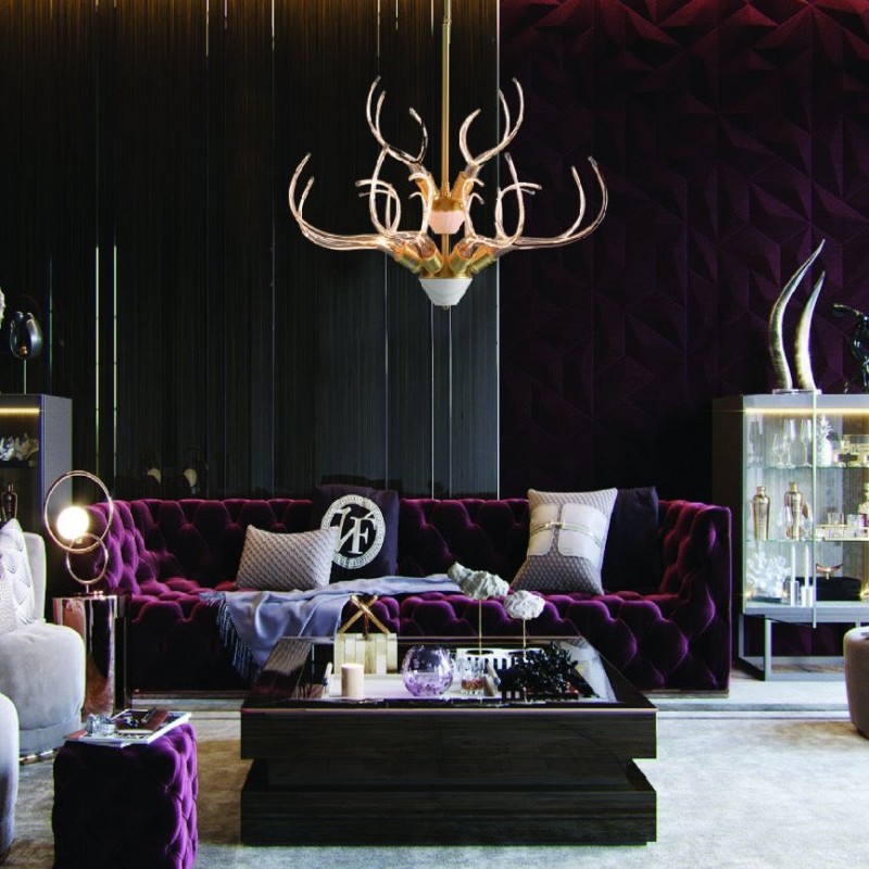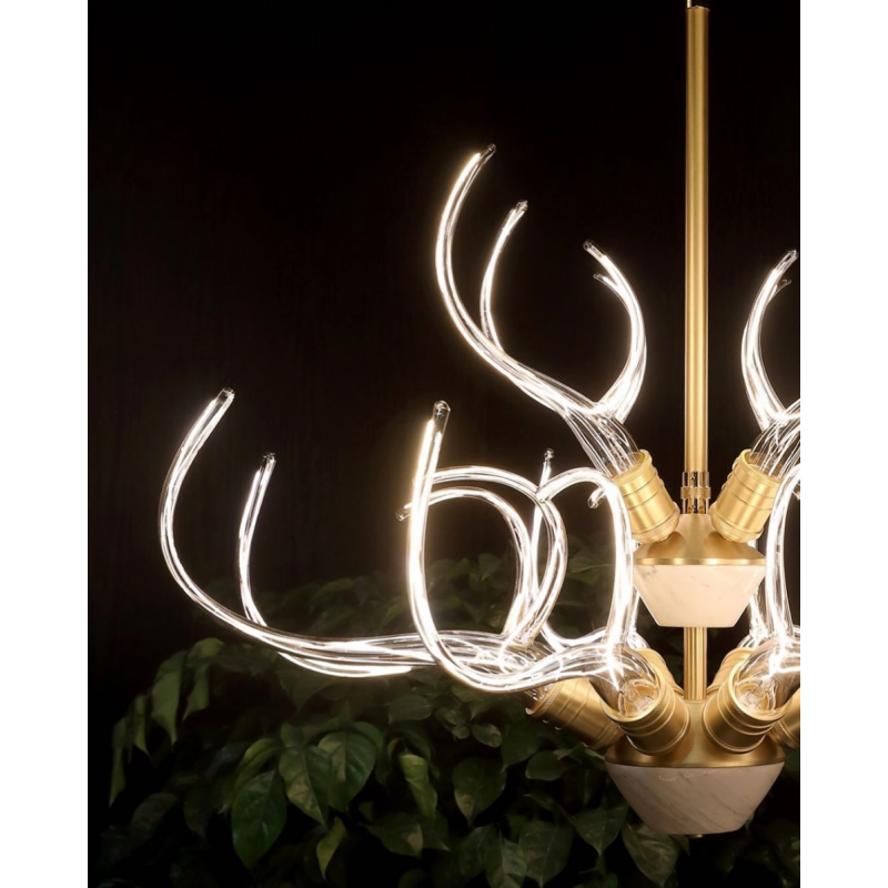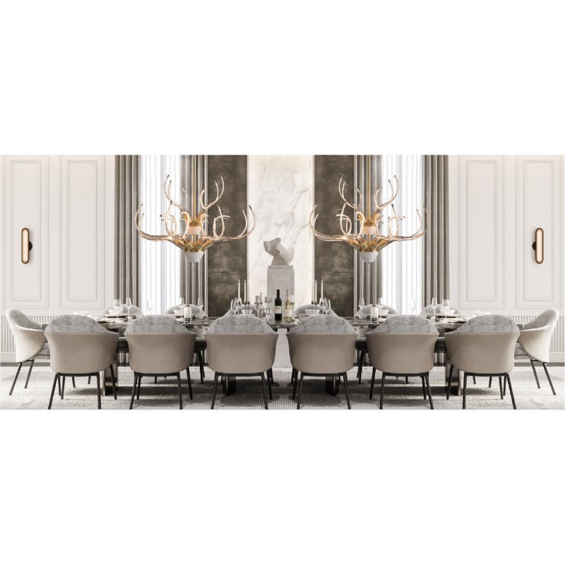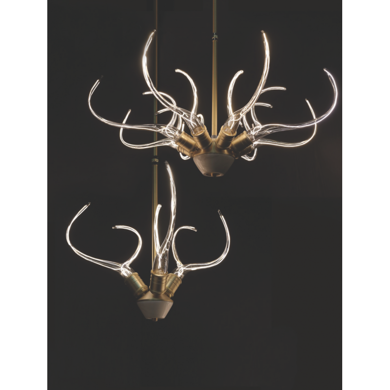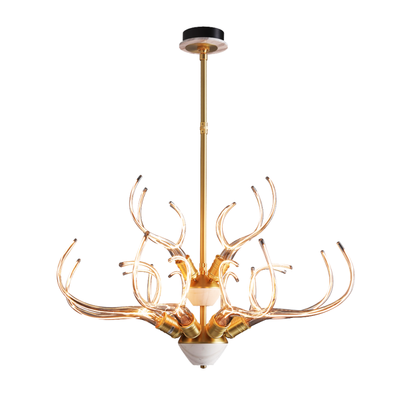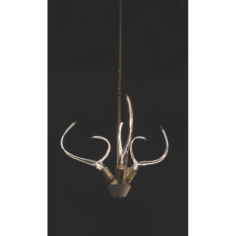 This is a unique artistic pendant with exceptional craftsmanship and lighting ambiance. This  is highly influential in breaking the rigidness of contemporary modernism and initiating the back-to-nature movement in design.  A luxurious chandelier that provides a soft and warm light through its layers, giving a romantic ambiance to any setting. The fixture features Antler's head suspended by a single adjustable rod in gold with 6 horns having 9W LED each giving ample ambient lighting.