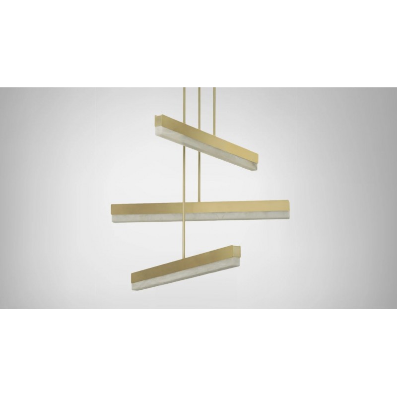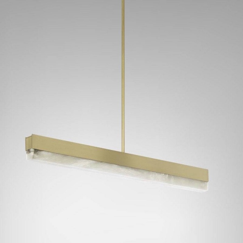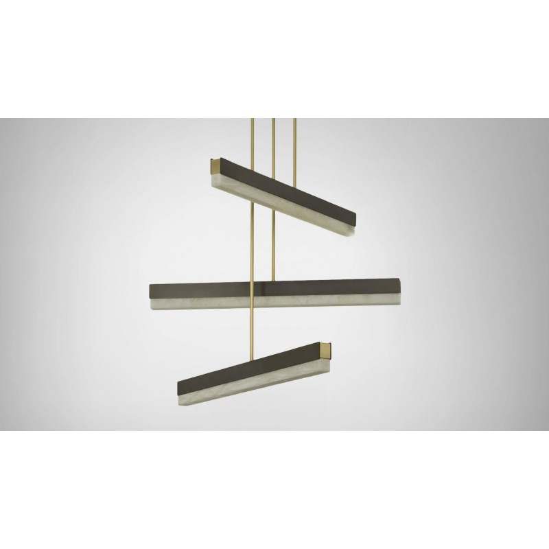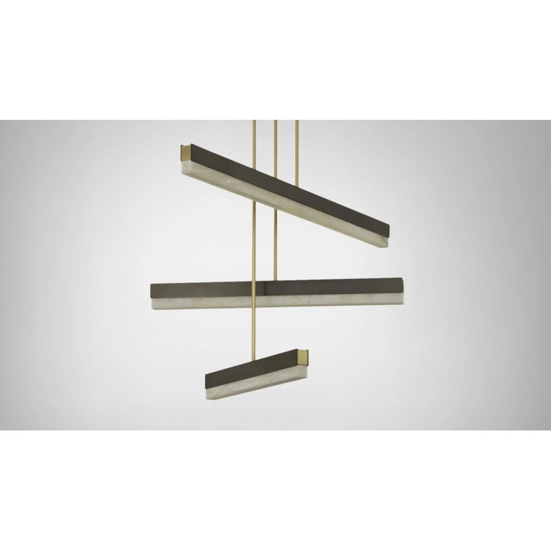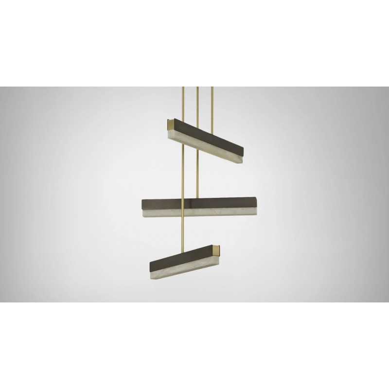 An architectural beam of light fused with premium materials such as bronze, satin brass and honed alabaster creates an elegant pendant that can be used singularly or as a composition creating endless possibilities to personalize a space. It is perfect to dress and decorate your living room, kitchen or dining room.