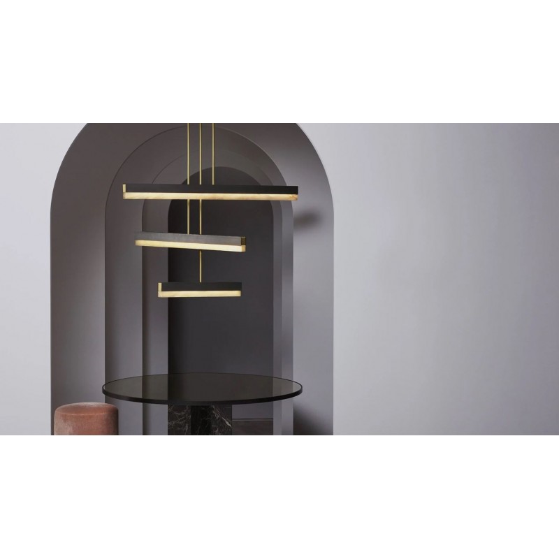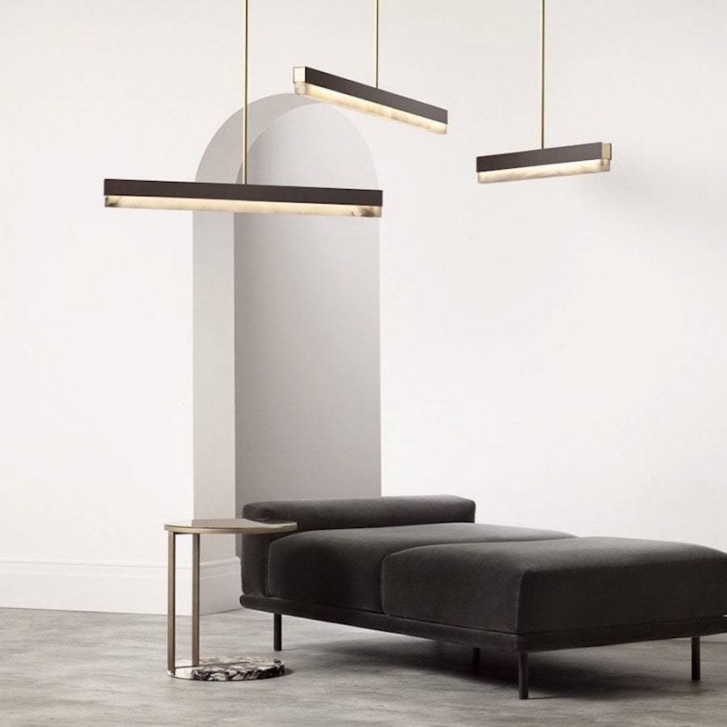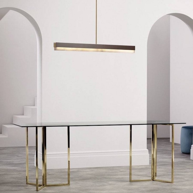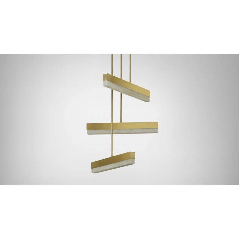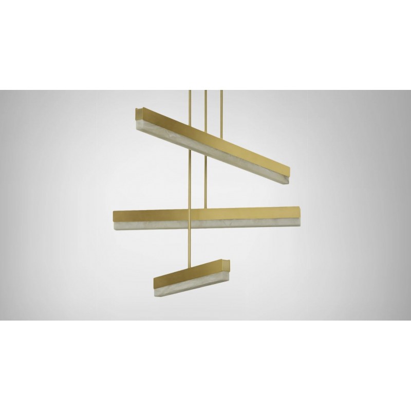 An architectural beam of light fused with premium materials such as bronze, satin brass and honed alabaster creates an elegant pendant that can be used singularly or as a composition creating endless possibilities to personalize a space. It is perfect to dress and decorate your living room, kitchen or dining room.
