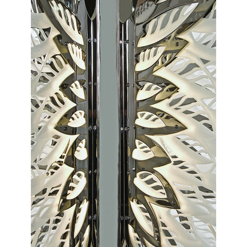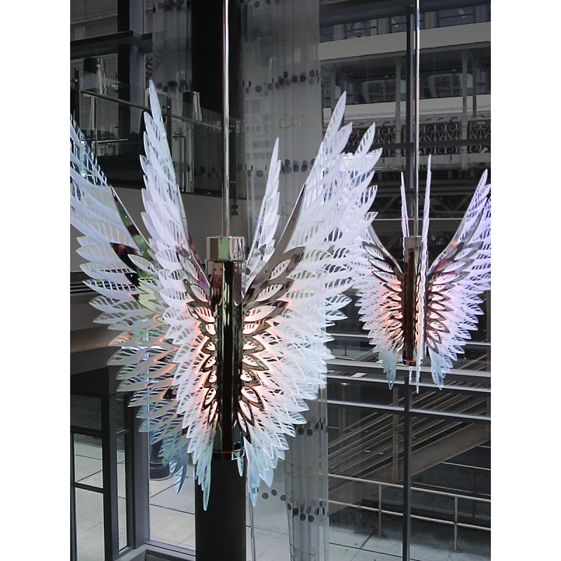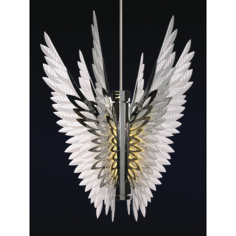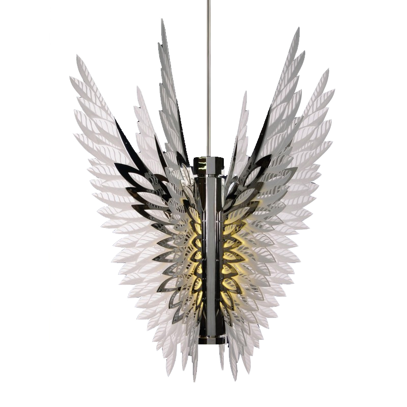 Custom Fixture with Carved and Etched Edgelit Lucite Wings with Stainless Steel Hardware.  Having created custom chandeliers for over three decades, we specialize in bringing lighting concepts into reality, whether your inspiration comes from a rough sketch, an existing chandelier, our original concepts, or even your own creative imagination. Large or small, our team can meet the challenge, and can even coordinate the production of a private collection, where all finishes are kept consistent. Let us create the perfect lighting fixtures for your individual needs, to your individual specifications, and with attention to detail throughout.
