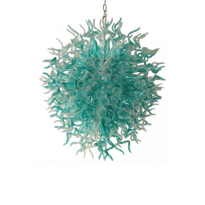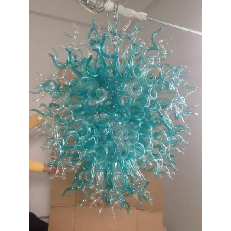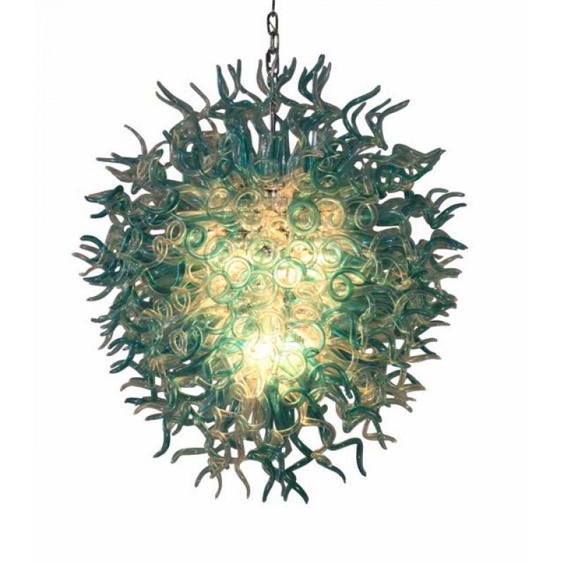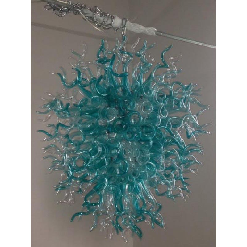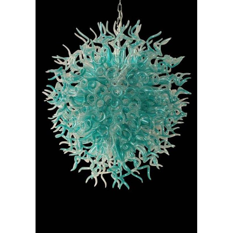 Welcome your guests with this teal, blue, and clear-toned lighting fixture has a modern feel but is also created with the classic look of hand-blown Murano glass. The majestic arms of this piece flow beautifully in a curling form from top to bottom of the frame, spinning and wrapping the piece flawlessly. In addition, this piece is also available in ANY color(s) you'd like. Simply ask us what you'd like, and we can make it happen. We also offer wall scones of the same design as well. The striking, fantasy feel of this piece would add the perfect touch to a room that is need of a pop of color or a huge statement piece set to transform a space into something totally different. It's smooth, hand crafted glass of multiple colors is sure to draw eyes and inquiries for years to come.