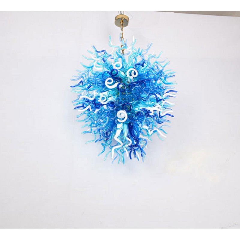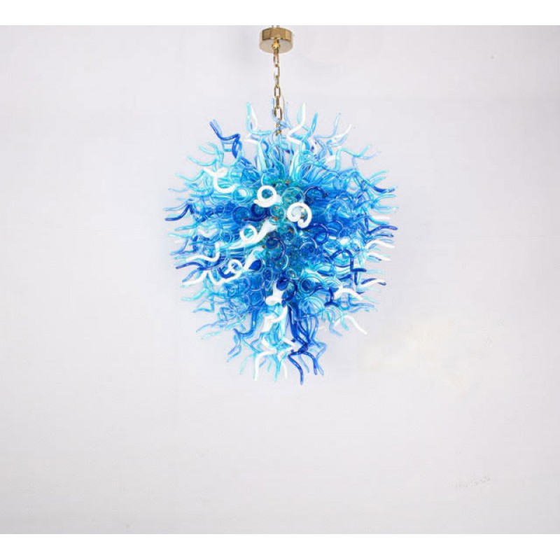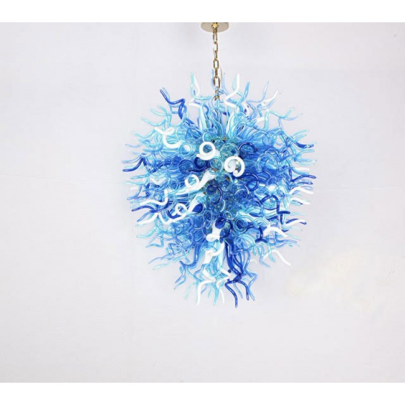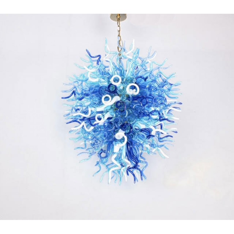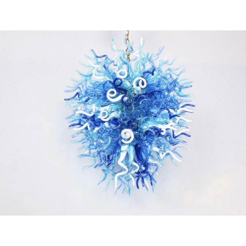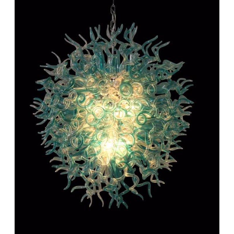 Welcome your guests with this teal, blue, and clear-toned lighting fixture has a modern feel but is also created with the classic look of hand-blown Murano glass. The majestic arms of this piece flow beautifully in a curling form from top to bottom of the frame, spinning and wrapping the piece flawlessly. In addition, this piece is also available in ANY color(s) you'd like. Simply ask us what you'd like, and we can make it happen. We also offer wall scones of the same design as well. The striking, fantasy feel of this piece would add the perfect touch to a room that is need of a pop of color or a huge statement piece set to transform a space into something totally different. It's smooth, hand crafted glass of multiple colors is sure to draw eyes and inquiries for years to come.