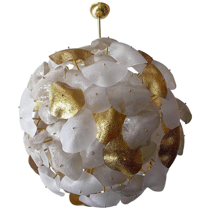 Italian chandelier with hand blown frosted, gray and gold Murano glass shades mounted on a spherical brass frame designed by Maria Maggi. A series of little lights located on the internal frame beams light shafts through the petals to refract on their faceted surfaces and multiply into a thousand reflections. Pairing haute couture influences with luxe accents, this shimmering luminary makes a versatile addition to any decor. Skilled artisans hand make this round chandelier in brass, covering it with a gold-plated finish or customized in multiple other finishes. The result of this outstanding creation is a functional dining room chandelier with sculptural shapes. A luxurious chandelier that provides a soft and warm light through its layers, giving a romantic ambiance to any setting. Birthed from the distinct design wardrobe of Alan Mizrahi Lighting, this piece promises to deliver only the highest standard in design and materials.