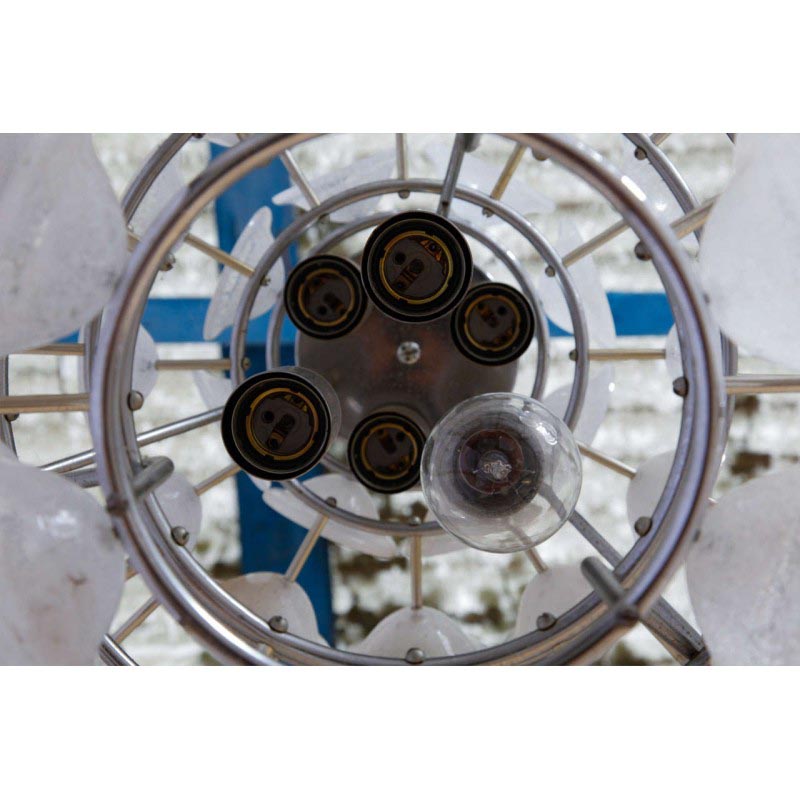 Amazing and rare Italian Murano chandelier, early 1960's composed of hand blown Murano glass. Each ice disc is crafted with much care and precision and flows gorgeously around and down the figure from top to bottom. What makes this piece stand out is its wonderfully balanced shape, vibrant and so full of life. This piece is truly a head turner with its detailed artwork. It’s available in other mixtures of colors, whatever works best for you! Finally, the lamp is equipped with a long cable that is adjustable up to 12 feet to ensure just the right placement of this unique and compliment accompanying fixture. Let this bring the optimum amount of magical charm and contemporary elegance in you seeking in a chandelier to be cherished, here and now and forever more.
