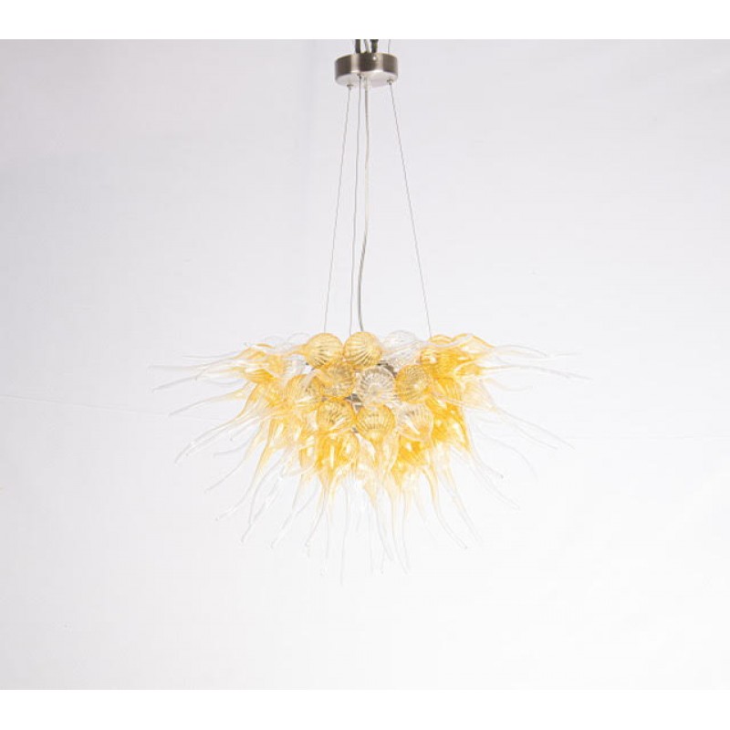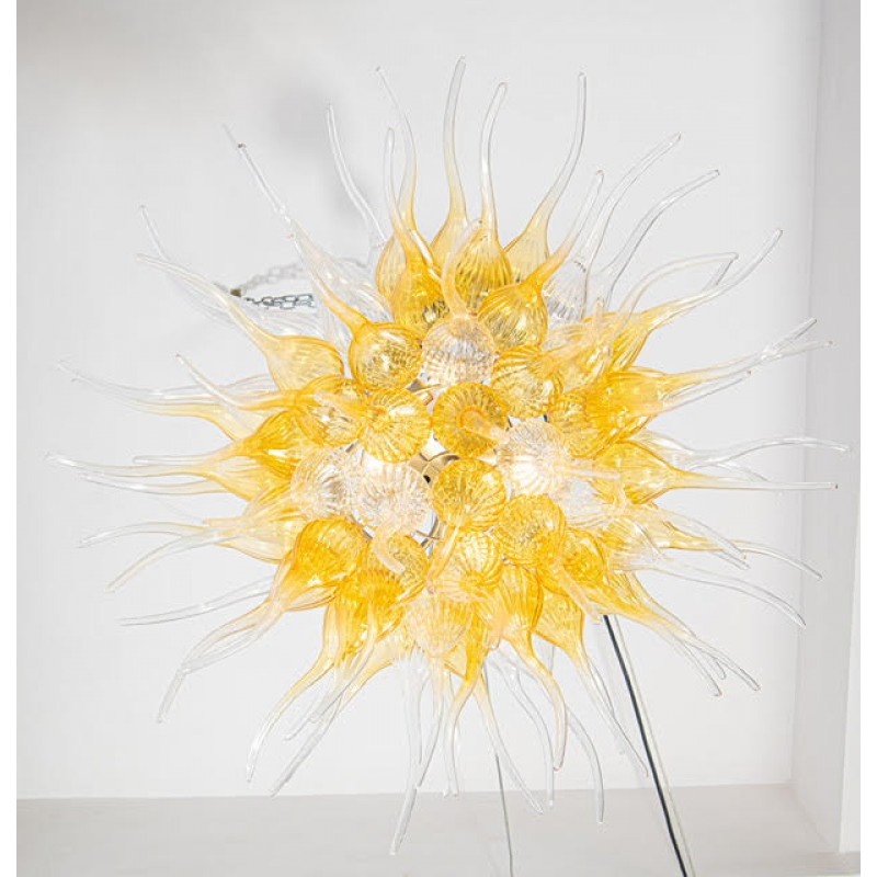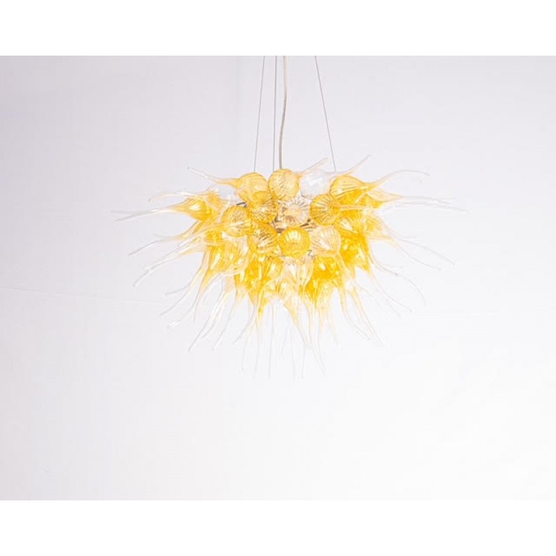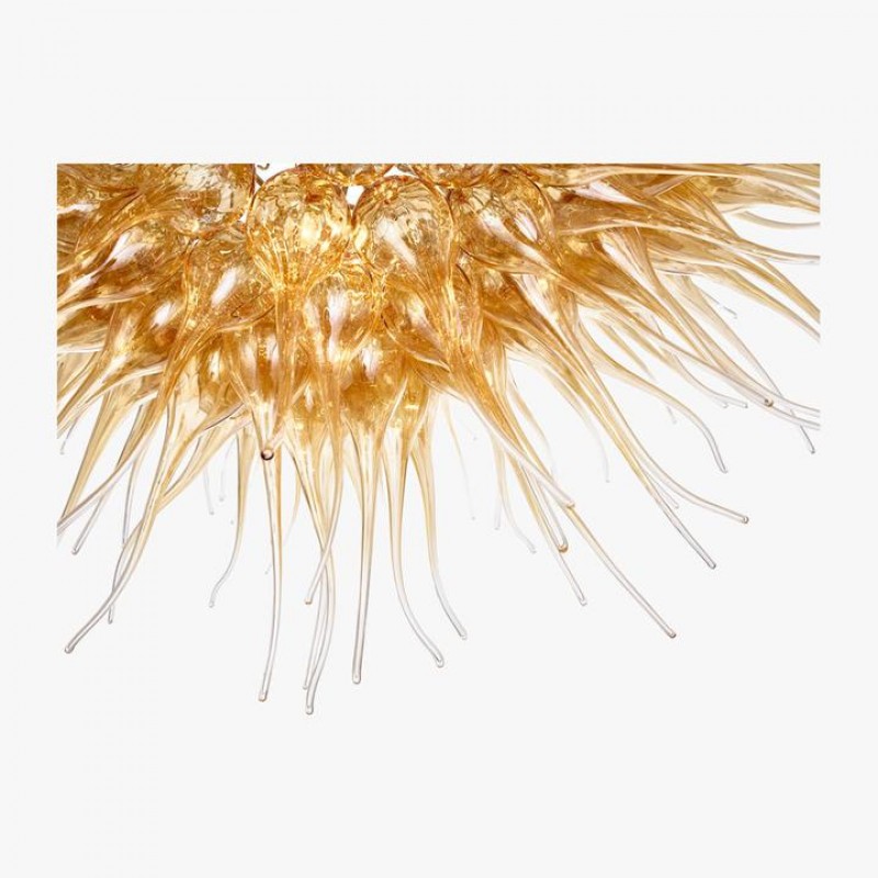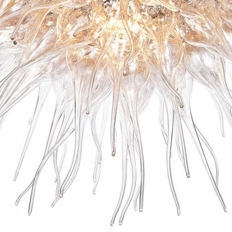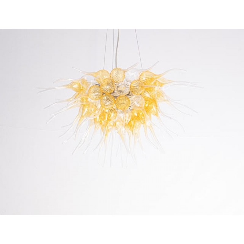 A spectacular contemporary chandelier that will add a touch of drama to any room setting. This stunning piece is created to illuminate both classic and contemporary environments with its design characterized by the use of hand made Murano glass icicles in a variety of colors (Clear White Amber), elegantly placed for optimum balance throughout the piece. Its pristine detailing and transparent shape give the fixture a feeling of incredible lightness. A sensational ceiling light that is also a piece of Murano glass sculpture.