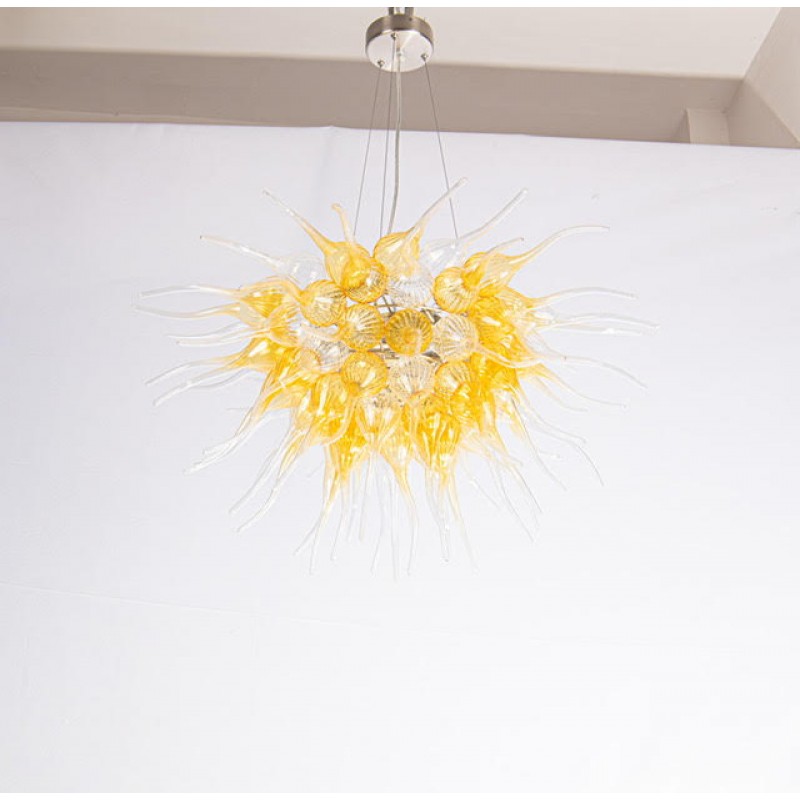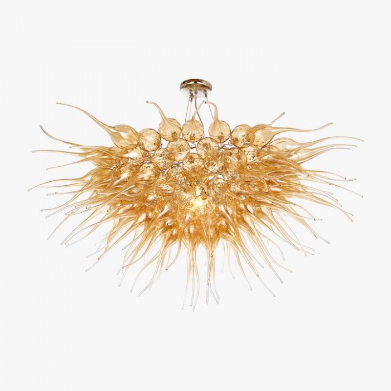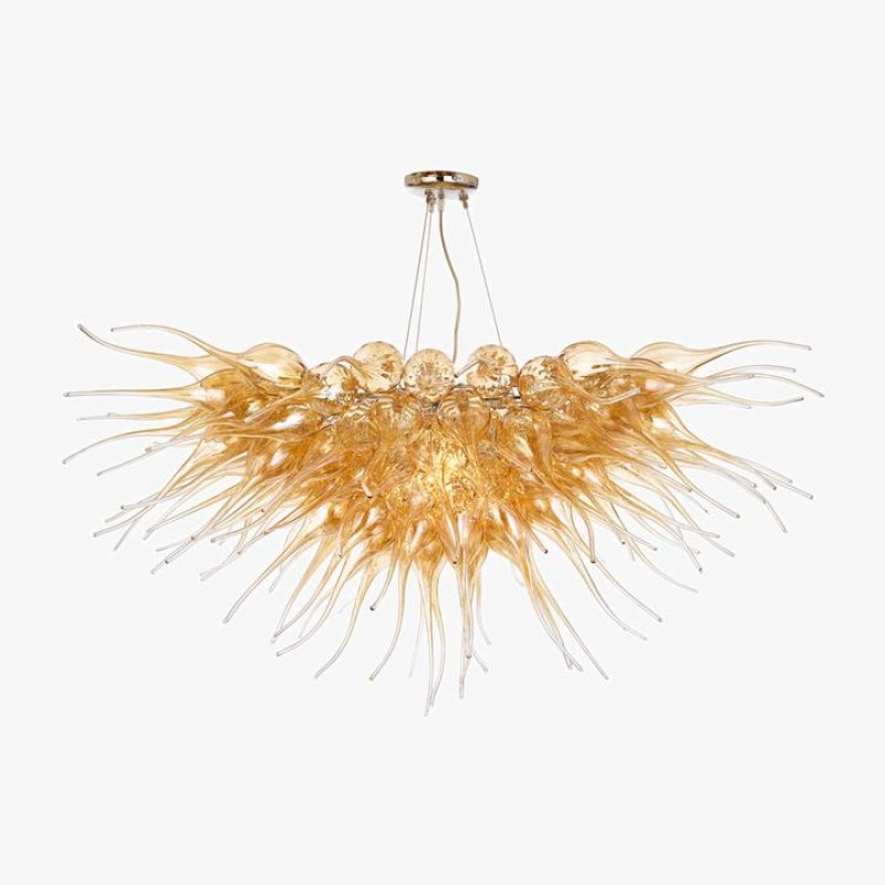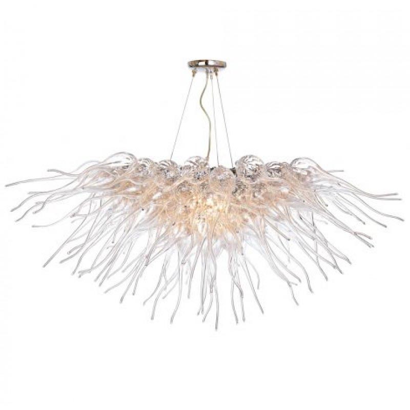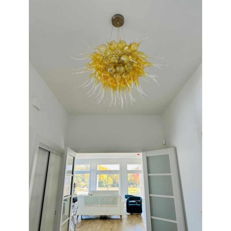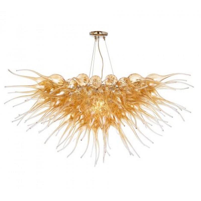 A spectacular contemporary chandelier that will add a touch of drama to any room setting. This stunning piece is created to illuminate both classic and contemporary environments with its design characterized by the use of hand made Murano glass icicles in a variety of colors (Clear White Amber), elegantly placed for optimum balance throughout the piece. Its pristine detailing and transparent shape give the fixture a feeling of incredible lightness. A sensational ceiling light that is also a piece of Murano glass sculpture.
