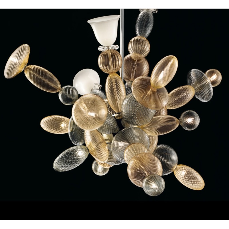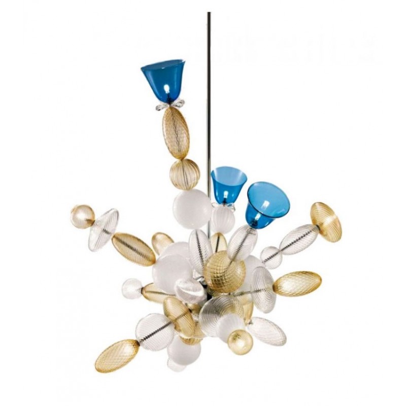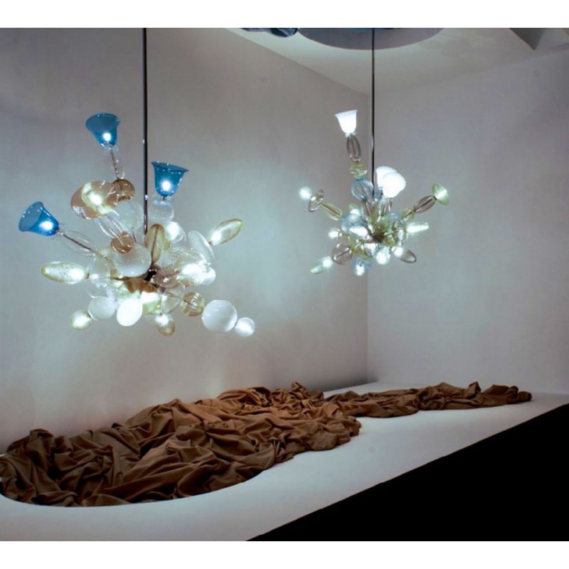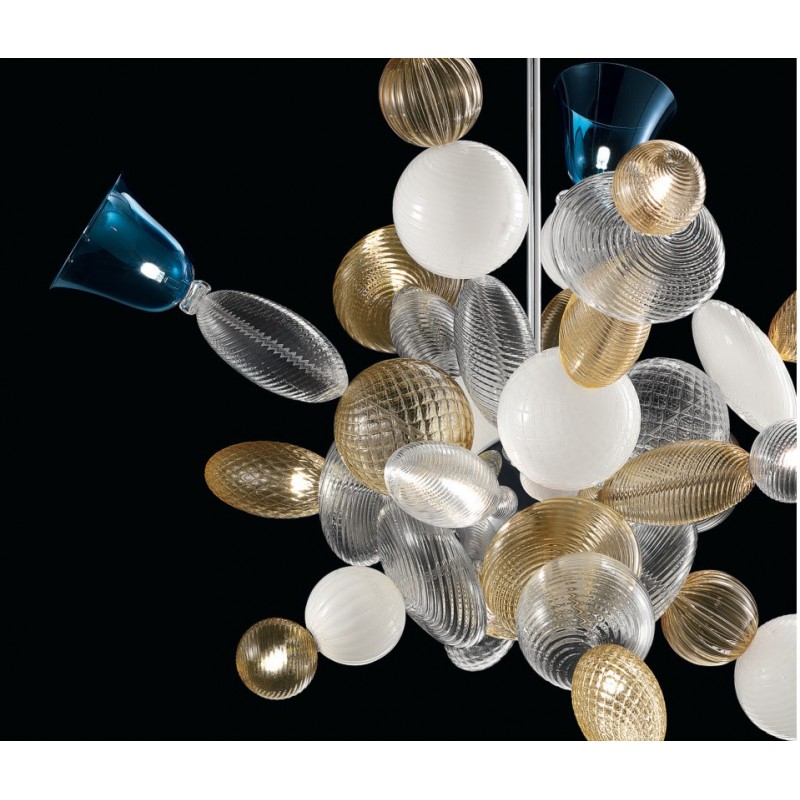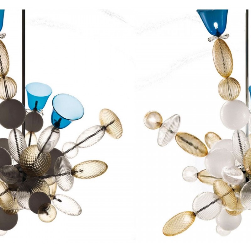 Daring enhancement of the Murano tradition, Perseus is composed of many glass elements that represent a compendium of the glassmaking techniques studied and developed in the course of its long history, here reinterpreted, paired, and mixed in a subversive way with respect to the canons of classicism. This chandelier looks like a dazzling explosion of glass, carefully balanced in volume, in the alternation of different colors, in the asymmetrical game of the arms.