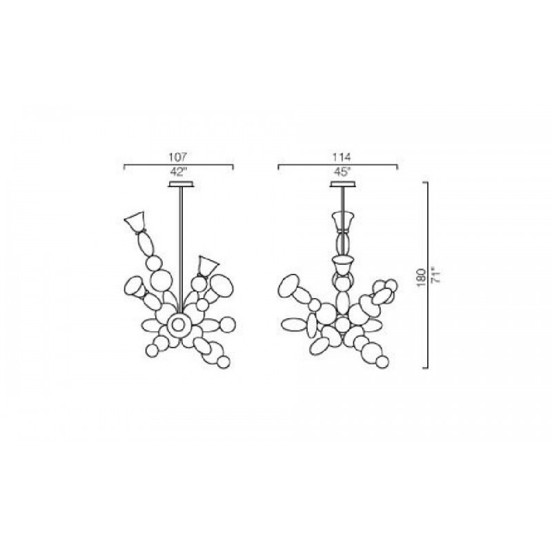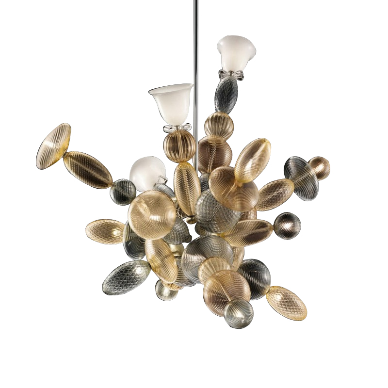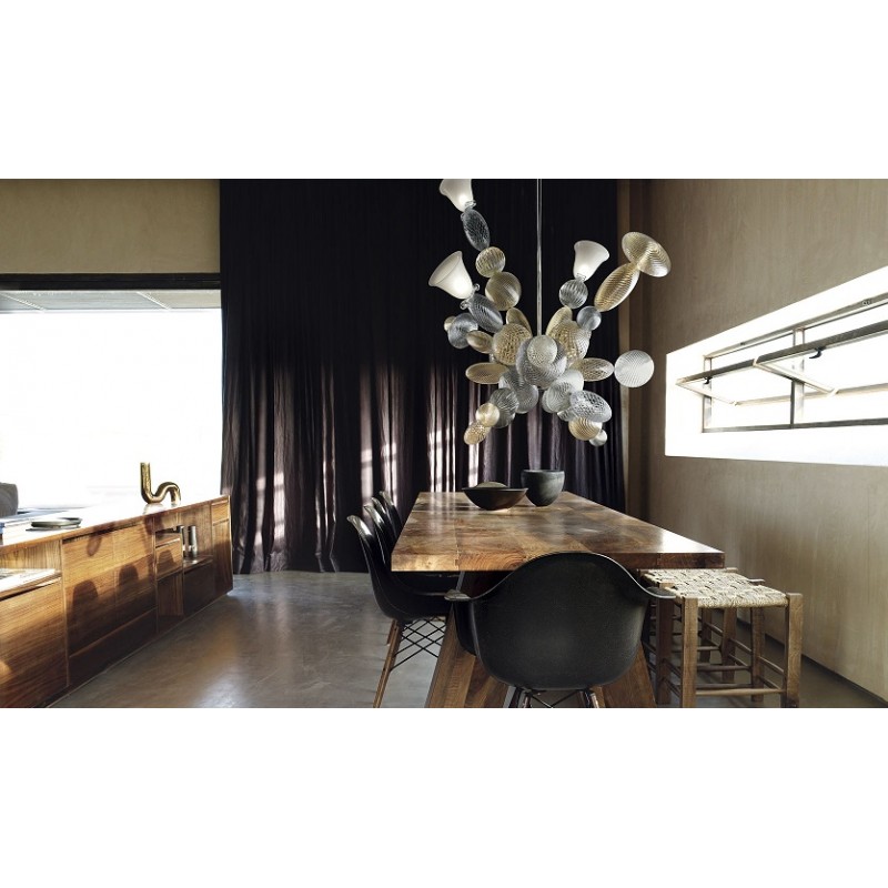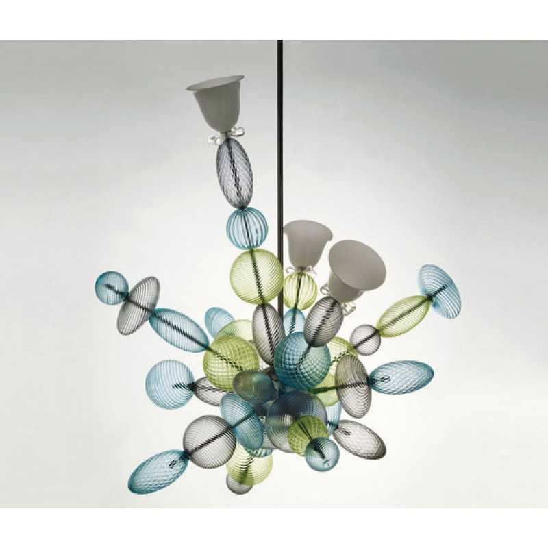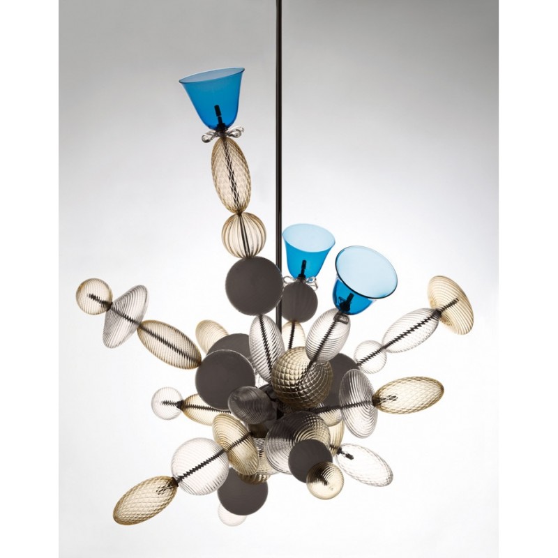Daring enhancement of the Murano tradition, Perseus is composed of many glass elements that represent a compendium of the glassmaking techniques studied and developed in the course of its long history, here reinterpreted, paired, and mixed in a subversive way with respect to the canons of classicism. This chandelier looks like a dazzling explosion of glass, carefully balanced in volume, in the alternation of different colors, in the asymmetrical game of the arms.