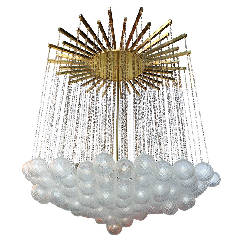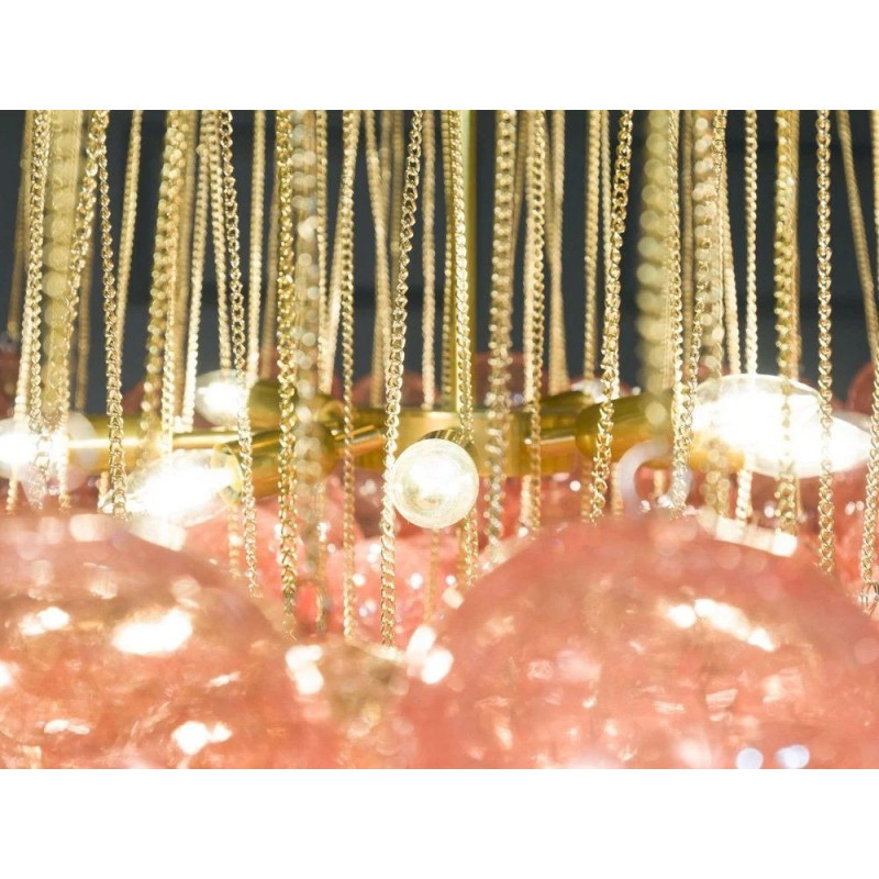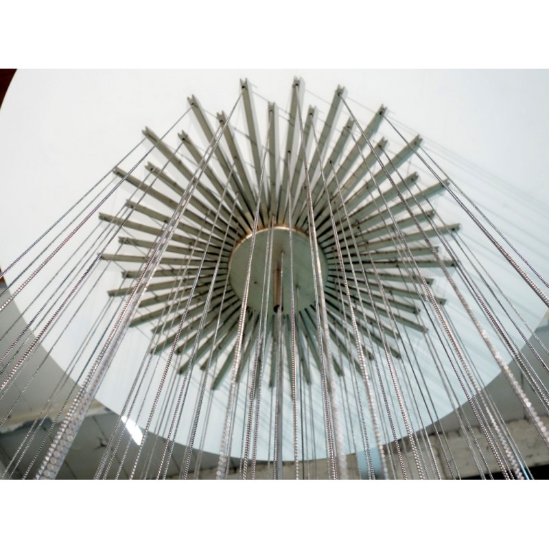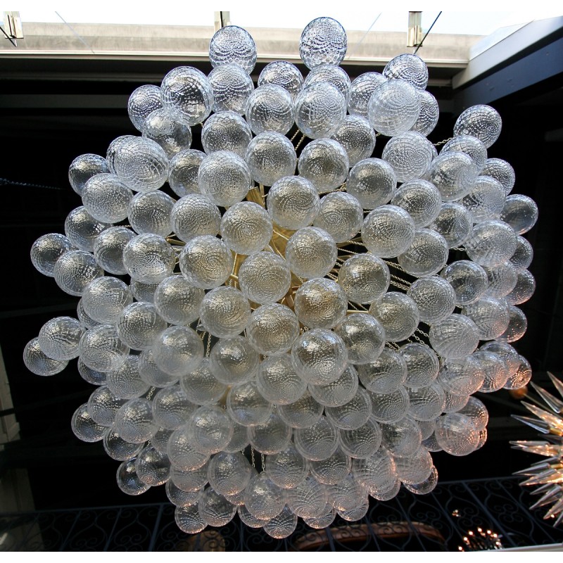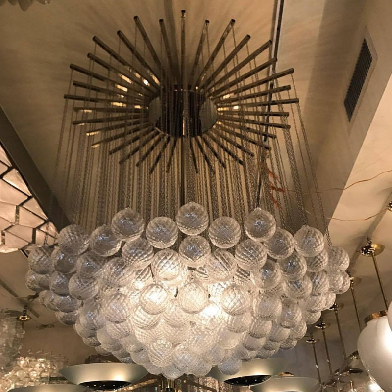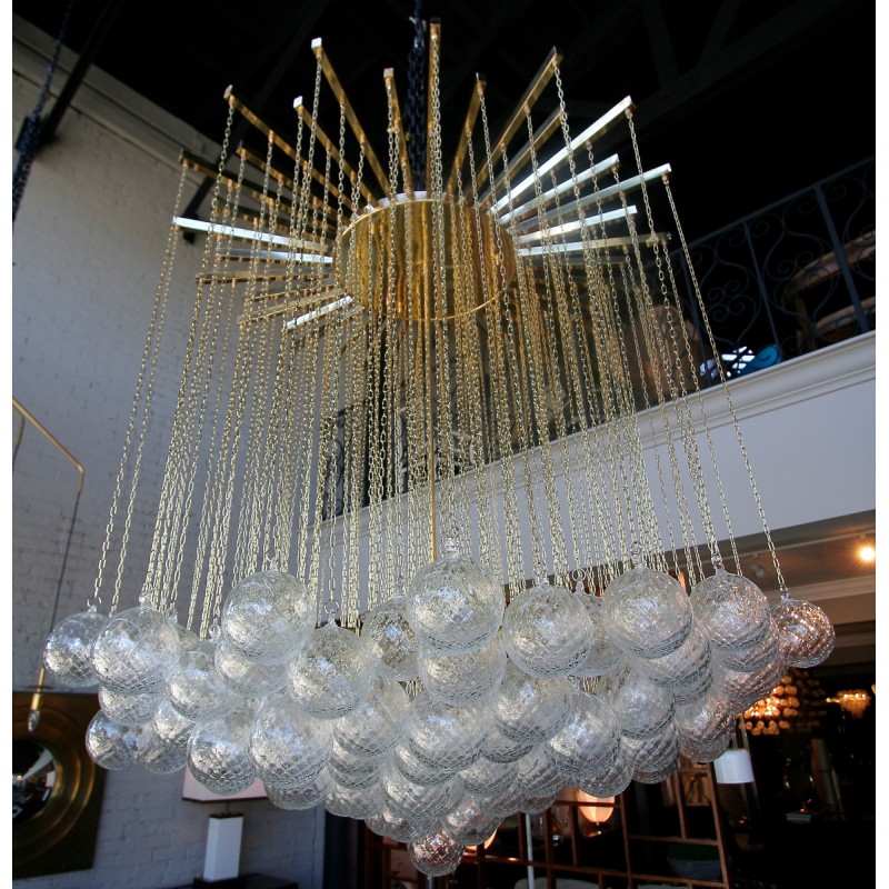 Expressive designs combined with high-end European materials are the foundation of the collection. 1970s Italian chandelier with 137 glass balls hanging from fine brass chains from a starburst frame. Robust yet refined metalwork with an outstanding finishing, mouth-blown glass of the finest crystals are the main components of these conversation pieces. Designers with different views and backgrounds have succeeded in creating a collection that is unique, divergent and recognizable.
