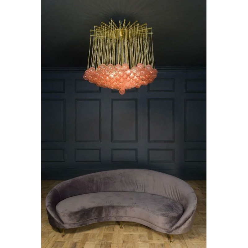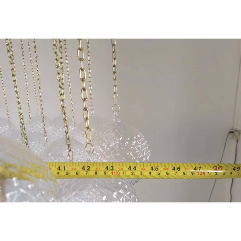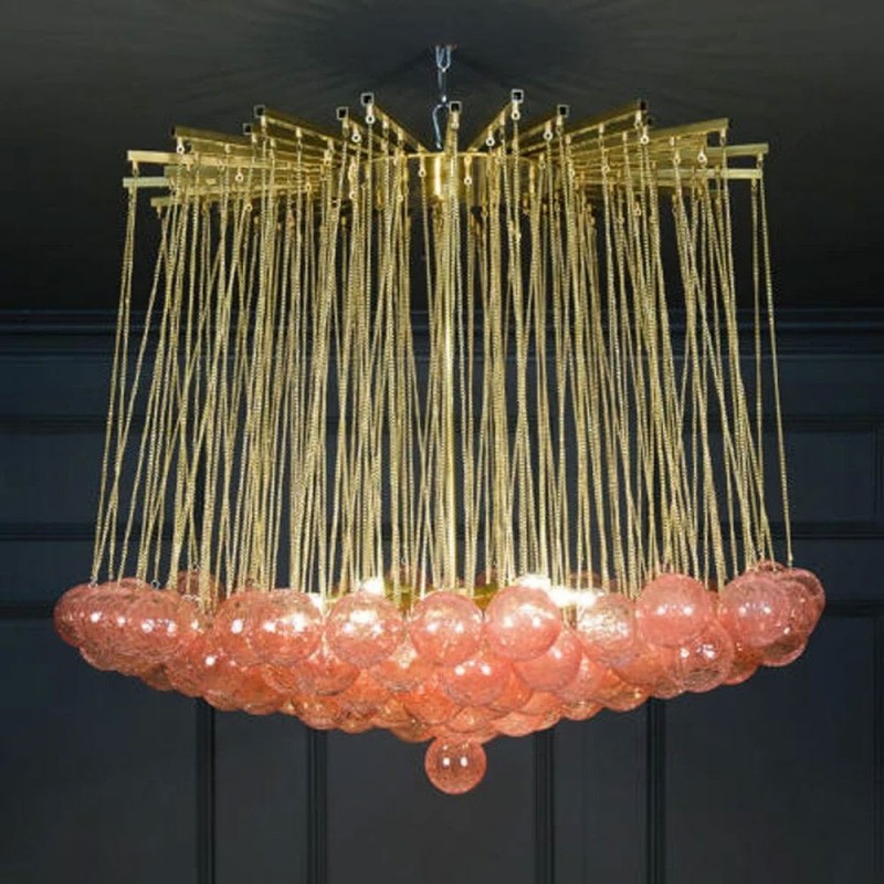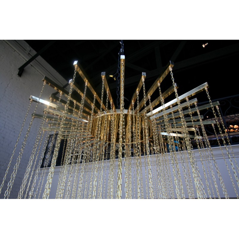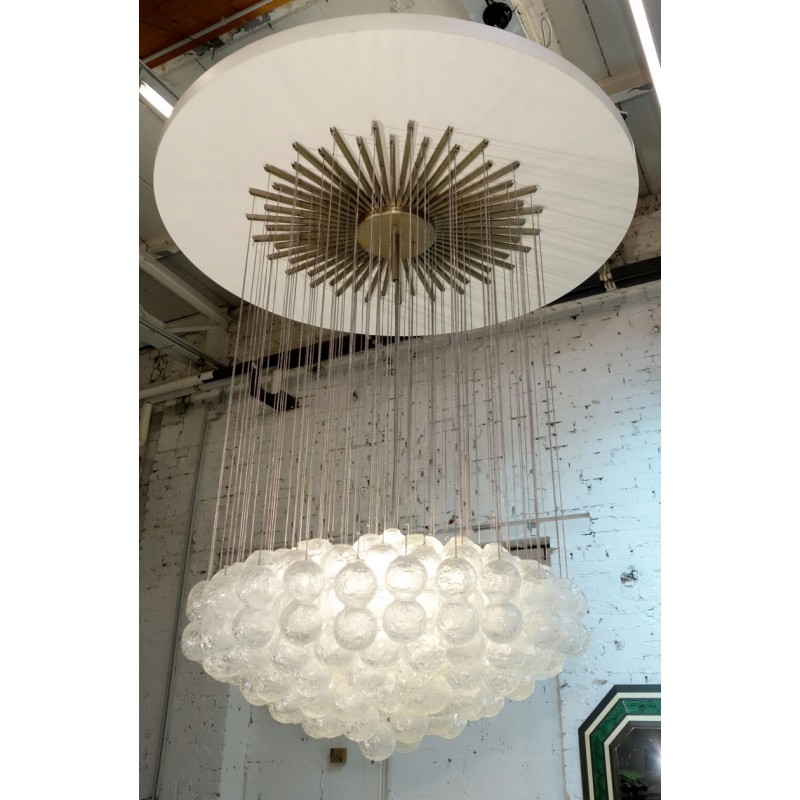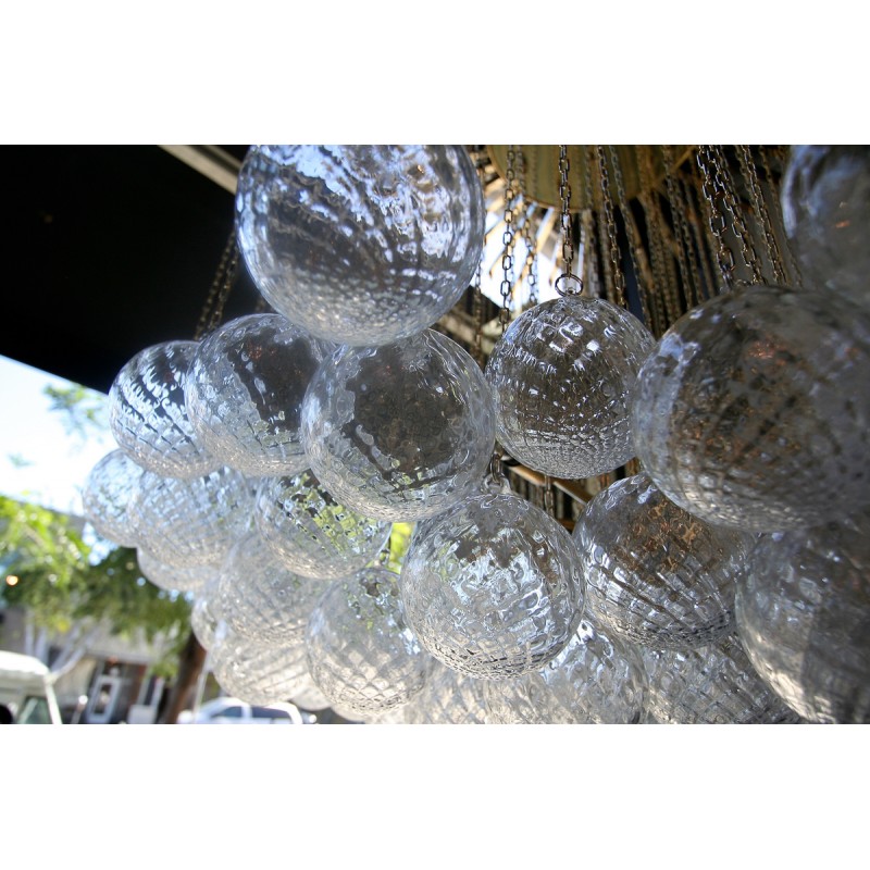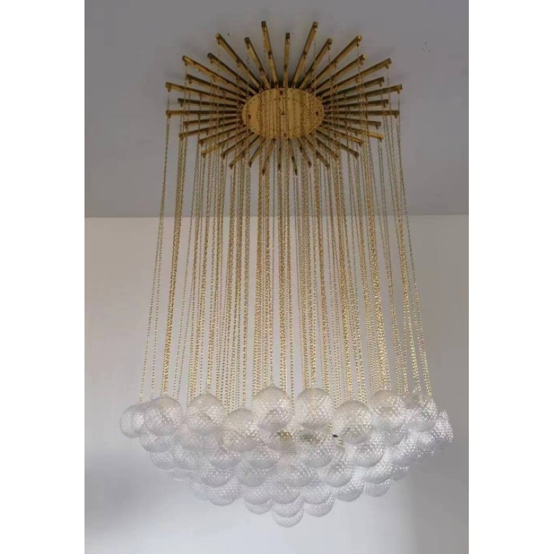 Expressive designs combined with high-end European materials are the foundation of the collection. 1970s Italian chandelier with 137 glass balls hanging from fine brass chains from a starburst frame. Robust yet refined metalwork with an outstanding finishing, mouth-blown glass of the finest crystals are the main components of these conversation pieces. Designers with different views and backgrounds have succeeded in creating a collection that is unique, divergent and recognizable.