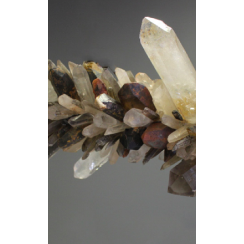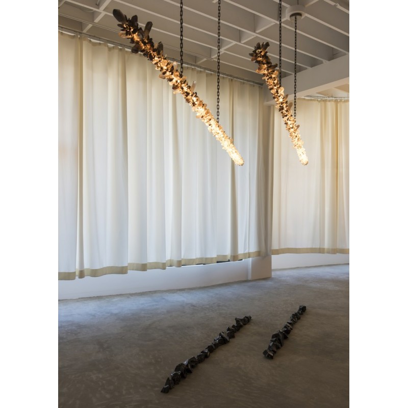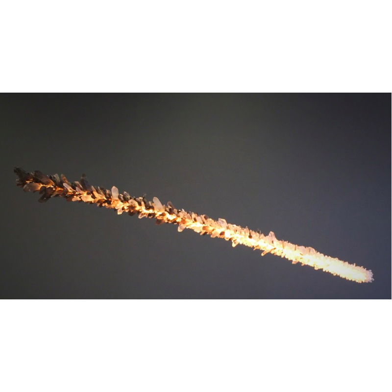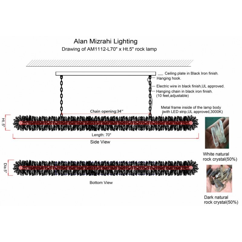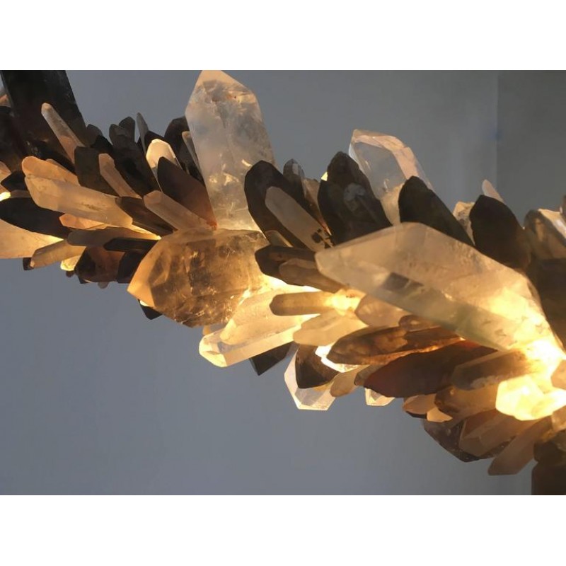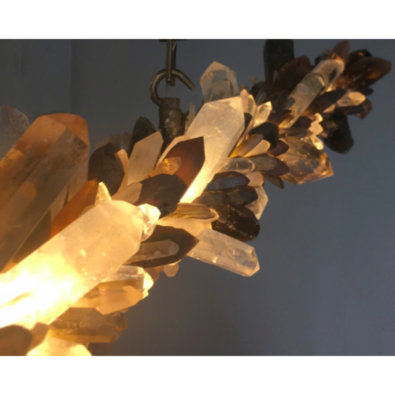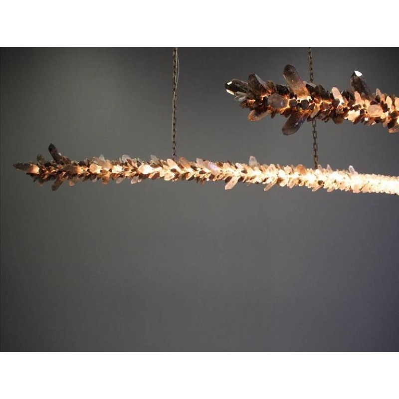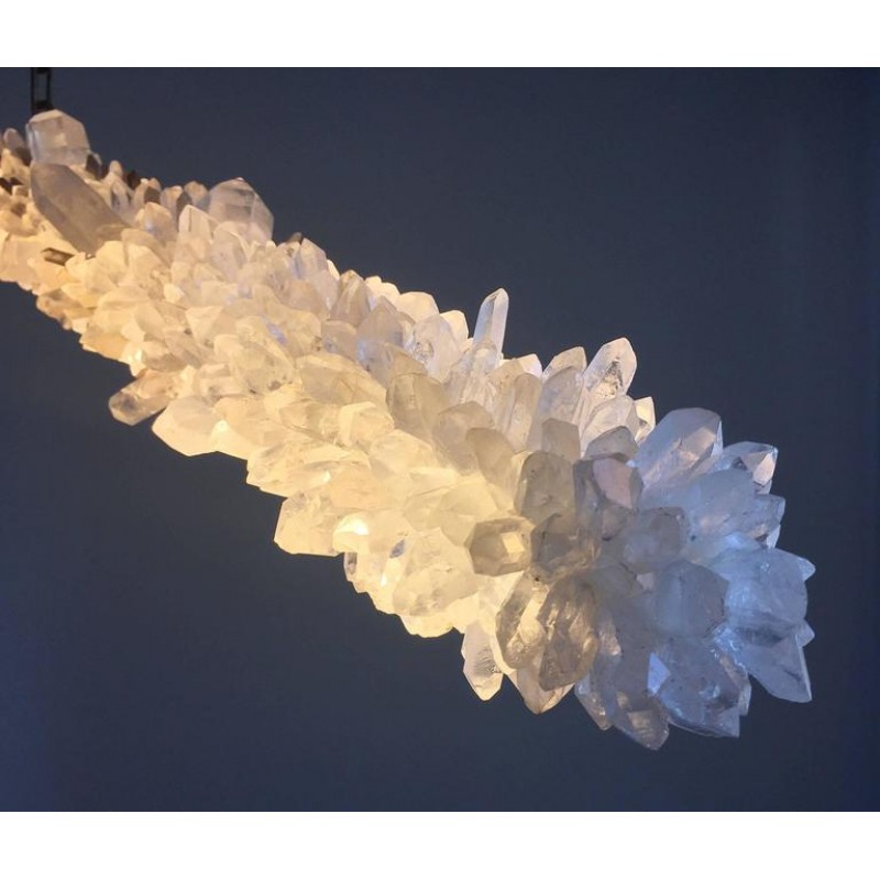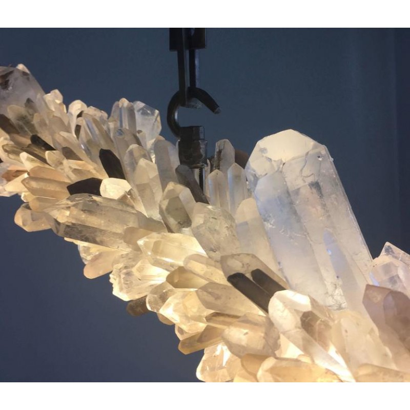 Naturally occurring quartz crystals appear to have grown by Mother Nature, and lit themselves from the inside, illustrating explorations of pure natural expression. Meteor Quartz crystals point like the Sword of Damocles. All crystals will differ in size, shape, and scale with every fixture. The Meteor is a dynamic work of contemporary design art. Meteor Line of Quartz Crystal was produced and displayed as a pair of Light that were prototypes with slight variations in the crystal arrangement between the two. Available in custom sizes, Colors, and metal Finishes.  At Alan Mizrahi Lighting Design, we supply and manufacturer many highly sought after designer pieces, All Chandelier can be customized by a number of lights, style, color and size to meet your specific needs. Every chandelier can also be combined with a matching table lamp and wall lamp to accomplish the best room design.