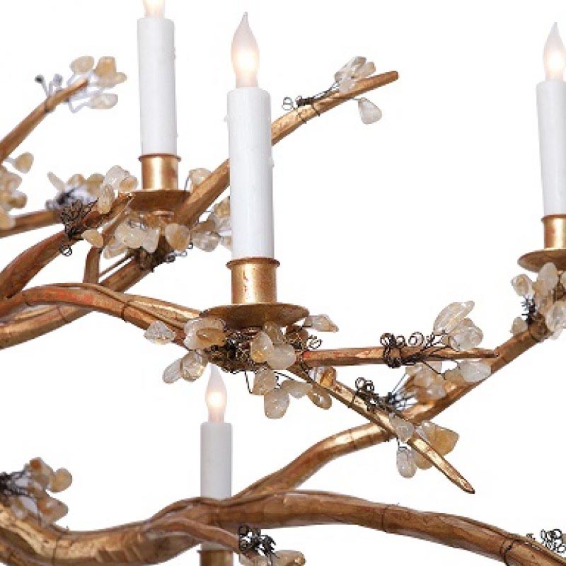 Bring the most festive and unique feel to a room with this Gemstone Chandelier finished in French gold with citrine that glows with only the utmost romance and glamour possible. It features branches ensuring a wonderful piece designed just to your liking. Its citrine beads balanced beautifully along the piece provide you with a warm and comforting setting for any room or event, as well as endless second glances and compliments for years to come. The rediscovery of rock crystal as a conductor of a magical rare light source pushed Designers to define creation within a repertoire of ever-changing material making each piece an original work. The natural and precious nature of this crystal becomes the first argument of this seductive lighting. Their size is the first seducing argument, broken lines streak to the ceiling, squares and rectangles light a subtly receptive universe, crystal brings mystery and uniqueness to these creations. From a single production principle, is made a line that is eternal, paradoxically, always renewed and always the same.