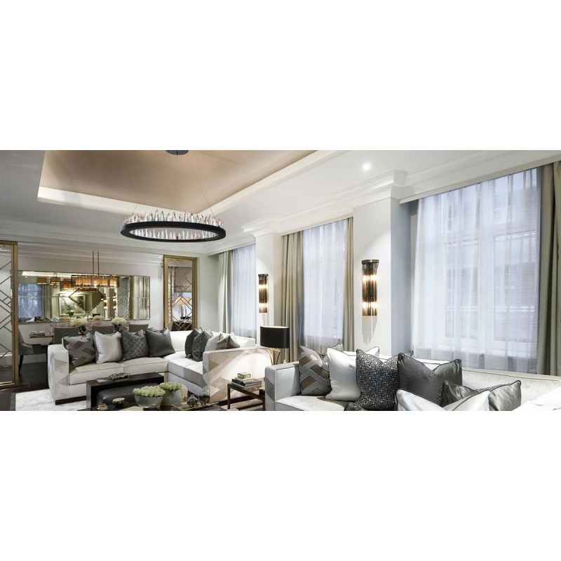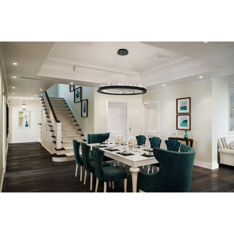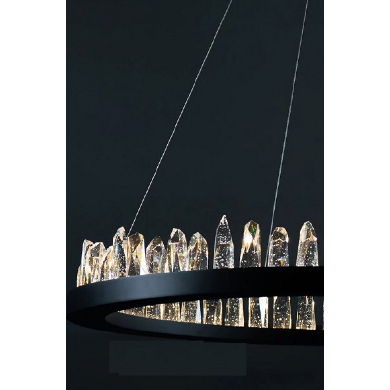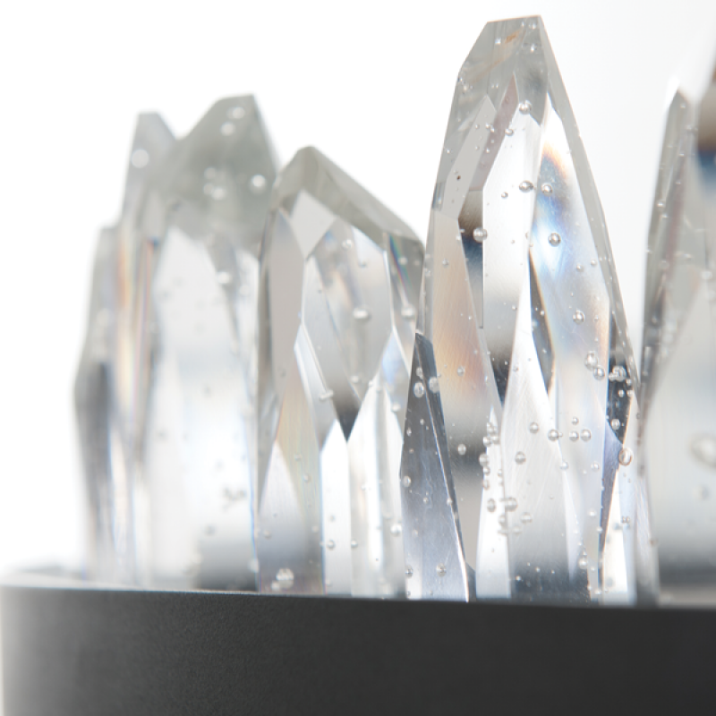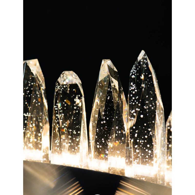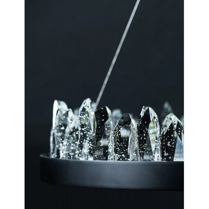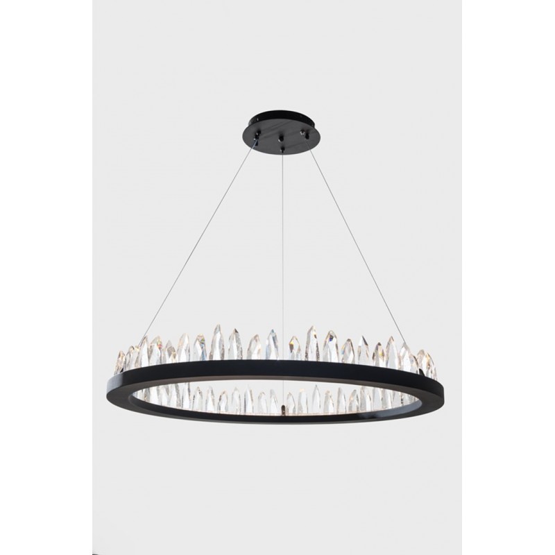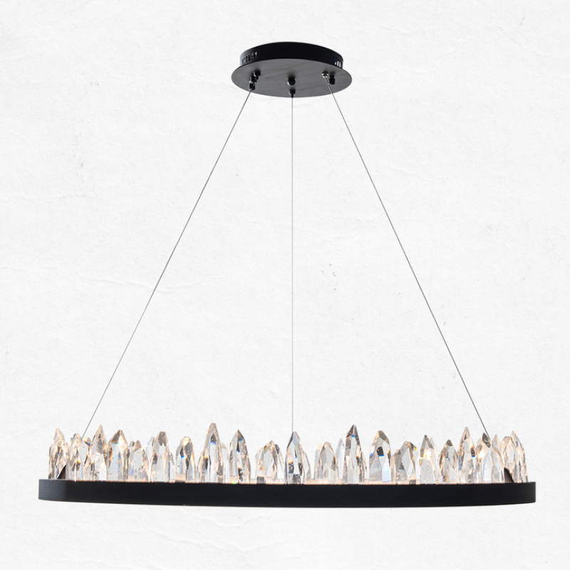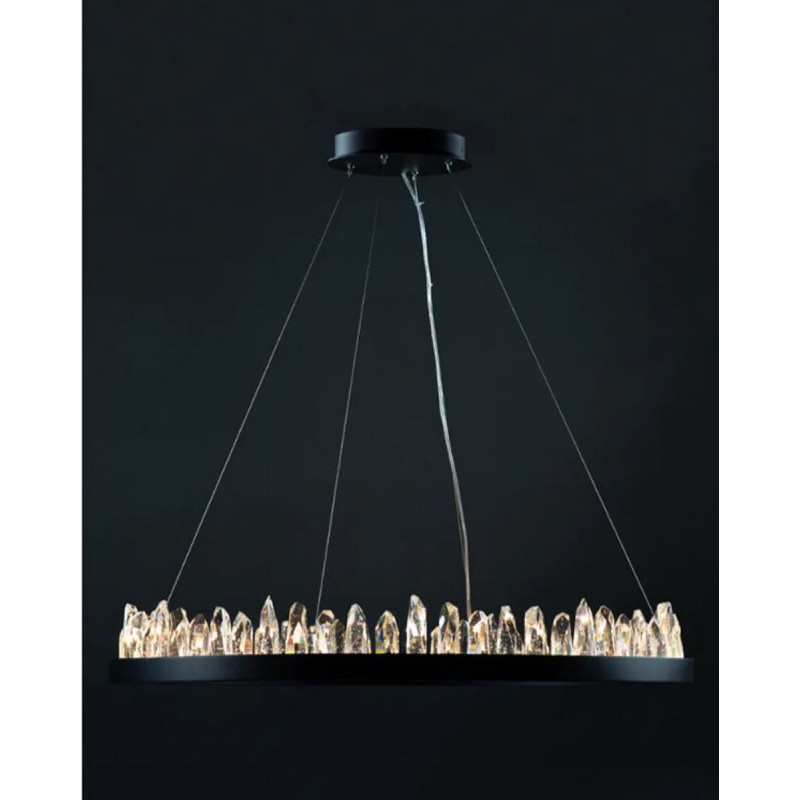 The ancient Greek, Prometheus, gave to mortals what was re-served for the gods “fire”. Here, a simple yet elegant construction creates a timeless light – a ring of ‘ flames’. With the gift of fire, Prometheus allowed humanity to develop… Simple yet elegant construction with warm white LED, natural uncut quartz crystals attached* with rare earth magnets, and a classic bronze ring, creates a timeless light. Greek philosophy’s quest was to distill all things to their essence, their most elemental. Whether in Euclid’s elements of geometry or Democritus’ first concept of the atom, Greek thought explored the possibilities of nature’s abstracted and universal essence. Naturally occurring quartz crystals appear to have grown by Mother Nature, and lit themselves from the inside, illustrating an explorations of pure natural expression. Quartz crystals point up like a crown. Prometheus II Quartz crystals point down like the Sword of Damocles. All crystals will differ in size, shape and scale with every fixture. At Alan Mizrahi Lighting Design, we supply and manufacturer many highly sought after designer pieces,  All Chandelier can be customized by number of lights, style, color and size to meet your specific needs. Every chandelier can also be combined with a matching table lamp and wall lamp to accomplish the best room design.