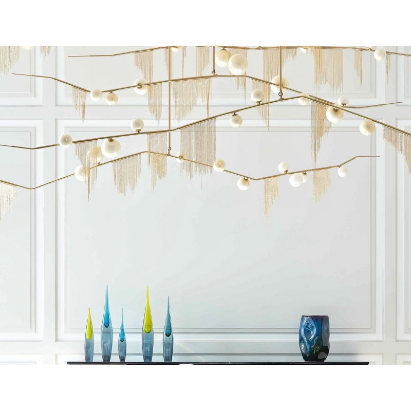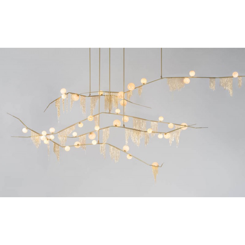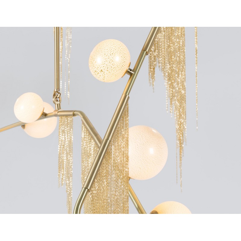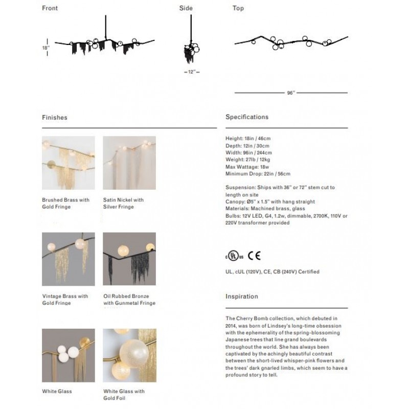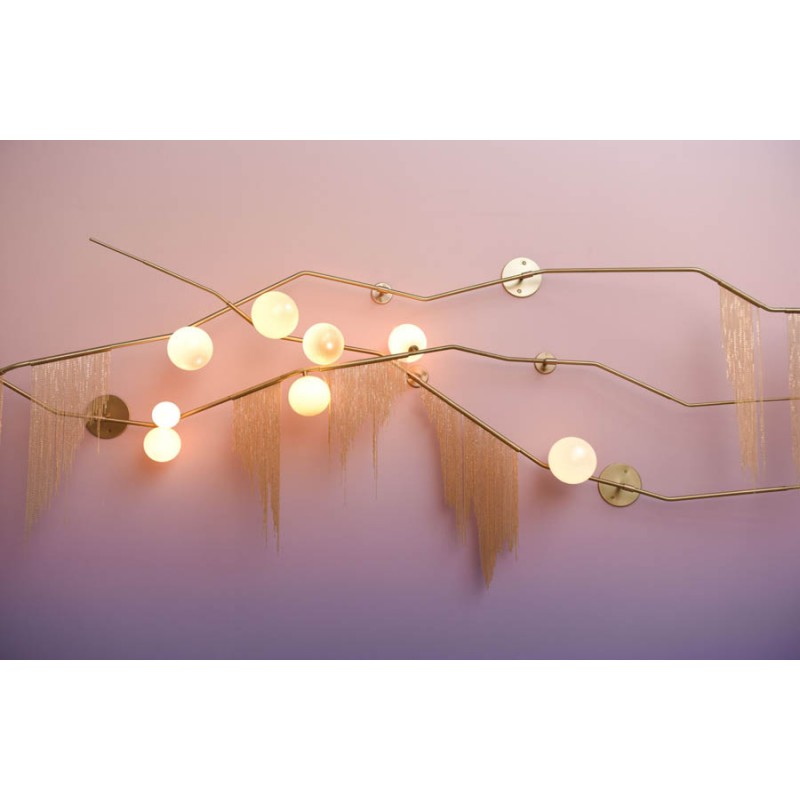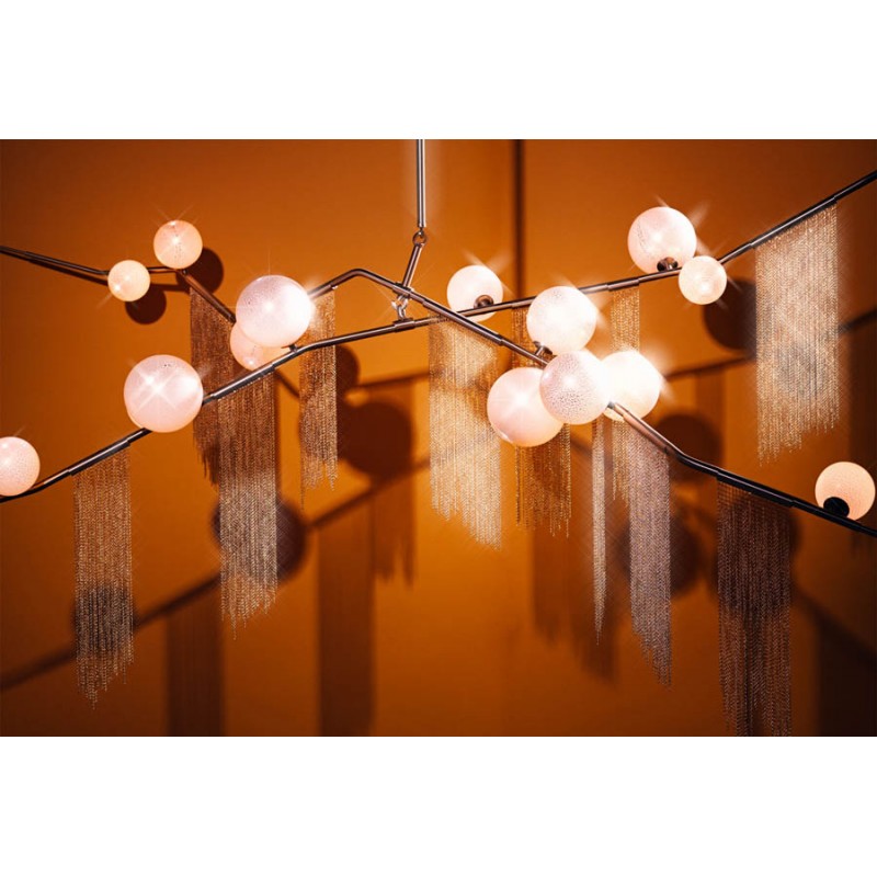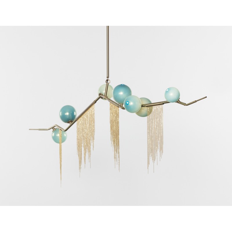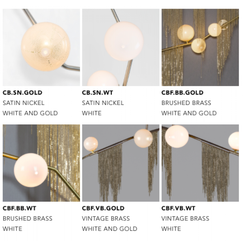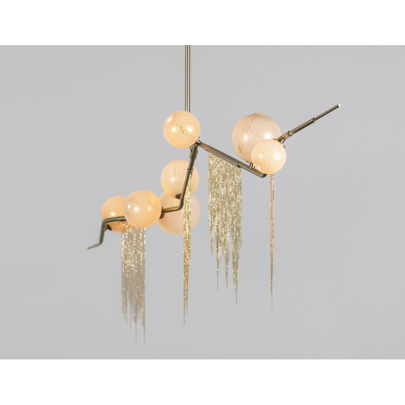 This gives a harmonious balance between effortlessly chic design with an opulent twist. The delicate gold fringing juxtaposes the rigid gold arms and frosted glass, which brings a sense of chaos to space. The Chandelier is available in a 6, 7, 9, or 10 bulb option, and can be hung either alone, to keep it simple and neat, or clustered together to create a luxuriously textured feature in any space. The on-trend brushed gold finish is one of the hottest trends in lighting at the moment, while the gold chains will keep it edgy and different. This is a diverse group of fixtures with dozens of possible configurations and several finishes, unified by the use of small, pale, round globes--yellow, pink, white or blue--burnished with gold foil that gives them a soft, otherworldly glow amid the slender metal branches. From chandeliers that hang above a table like a gentle solar system to the bold yet almost weightless Cherry Bomb cages, which resemble lobster traps freshly pulled from the bay, glistening in the sun, the collection gives expression to a panoply of emotions.