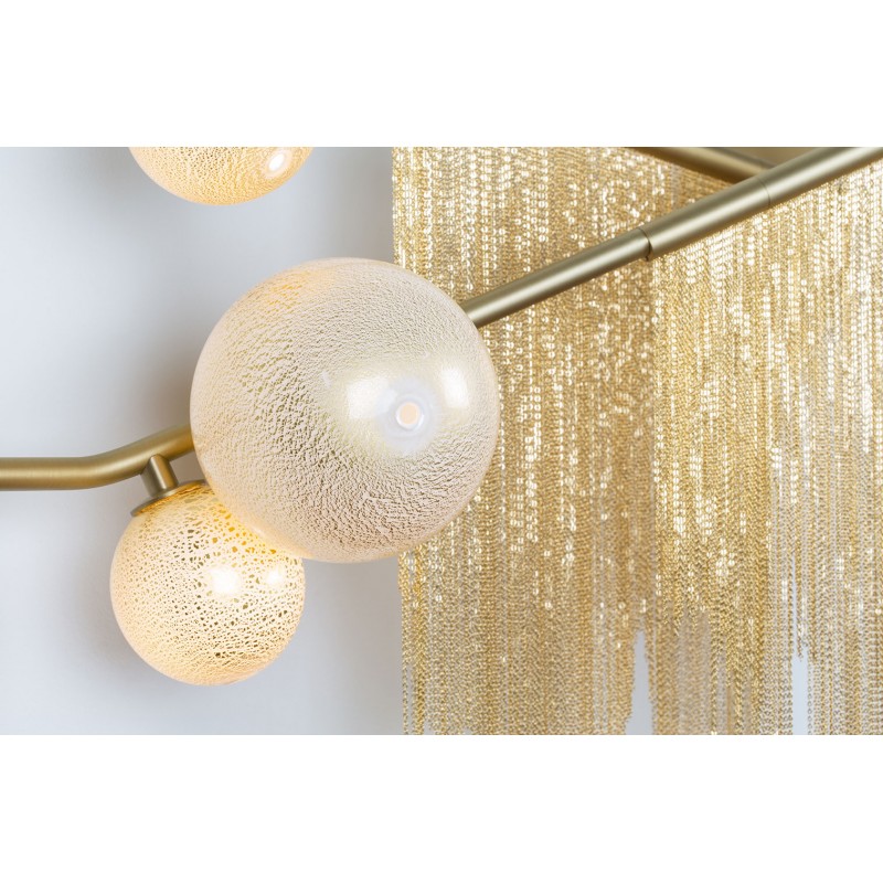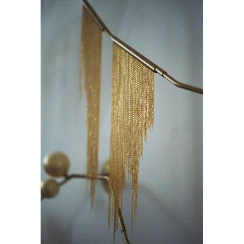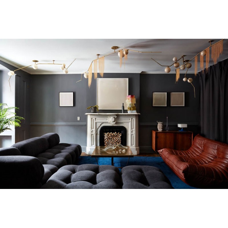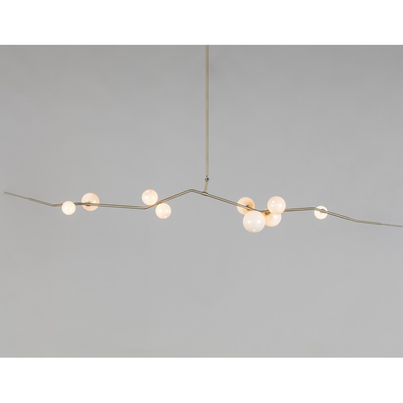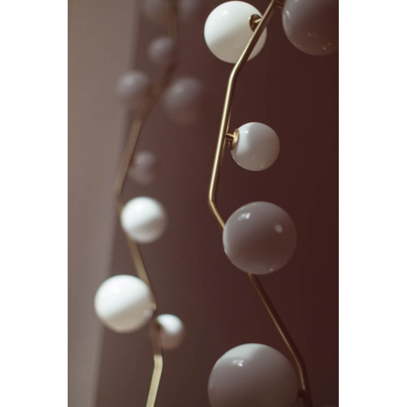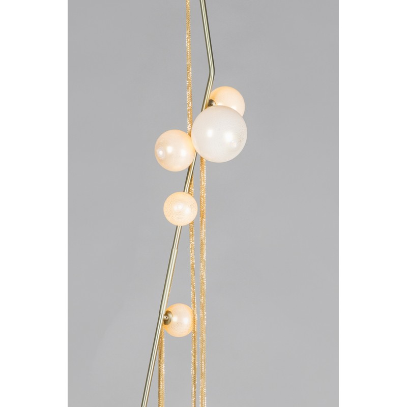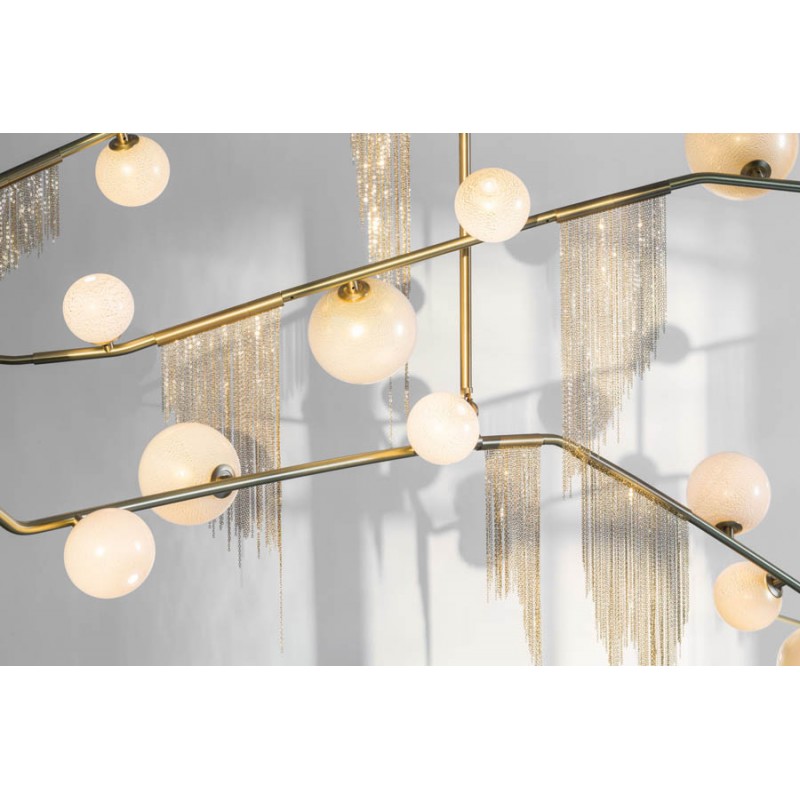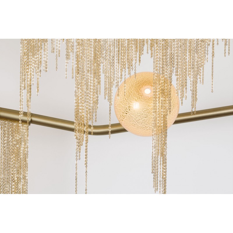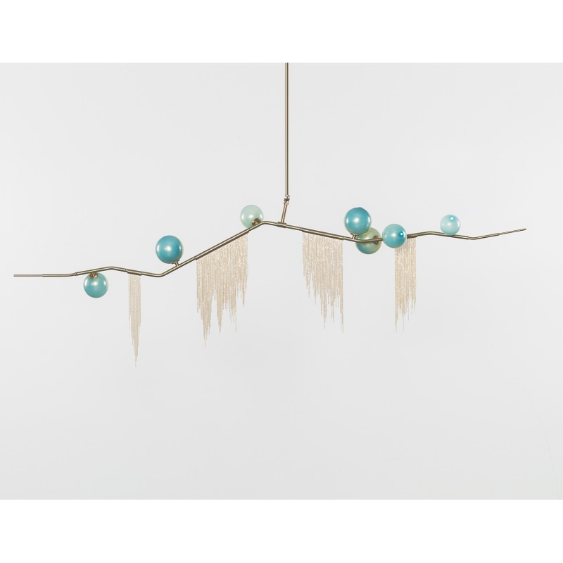 This gives a harmonious balance between effortlessly chic design with an opulent twist. The delicate gold fringing juxtaposes the rigid gold arms and frosted glass, which brings a sense of chaos to space. The Chandelier is available in a 6, 7, 9, or 10 bulb option, and can be hung either alone, to keep it simple and neat, or clustered together to create a luxuriously textured feature in any space. The on-trend brushed gold finish is one of the hottest trends in lighting at the moment, while the gold chains will keep it edgy and different. This is a diverse group of fixtures with dozens of possible configurations and several finishes, unified by the use of small, pale, round globes--yellow, pink, white or blue--burnished with gold foil that gives them a soft, otherworldly glow amid the slender metal branches. From chandeliers that hang above a table like a gentle solar system to the bold yet almost weightless Cherry Bomb cages, which resemble lobster traps freshly pulled from the bay, glistening in the sun, the collection gives expression to a panoply of emotions.