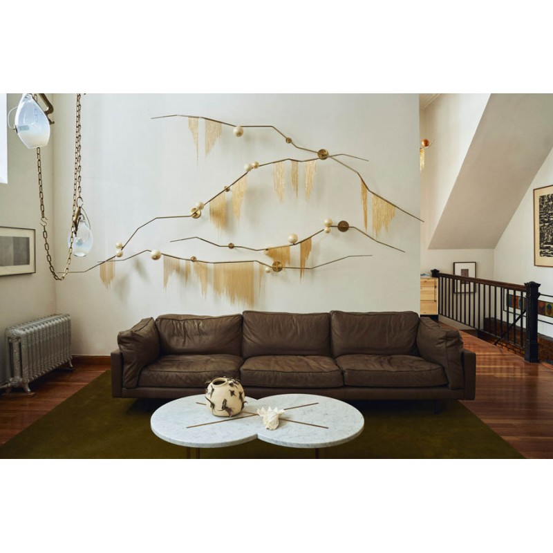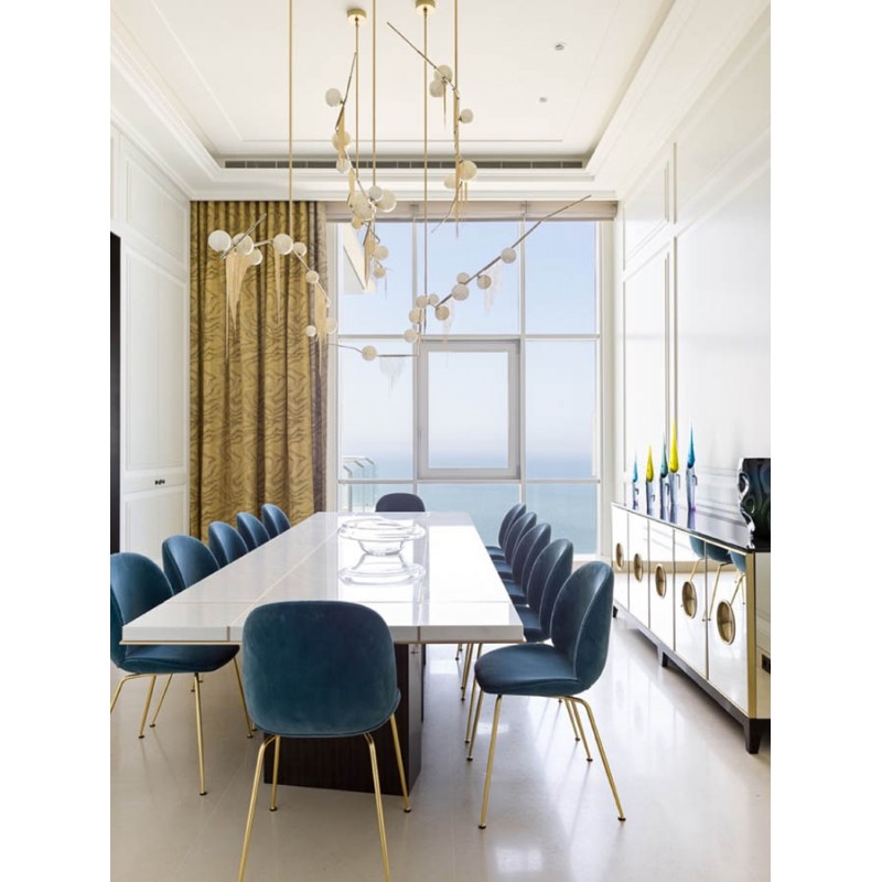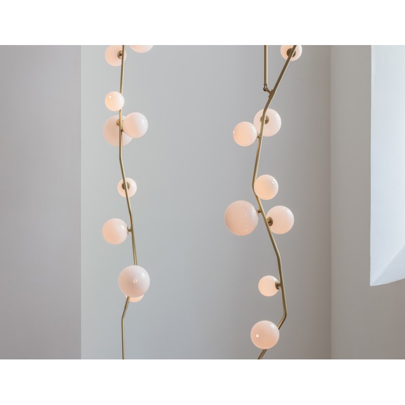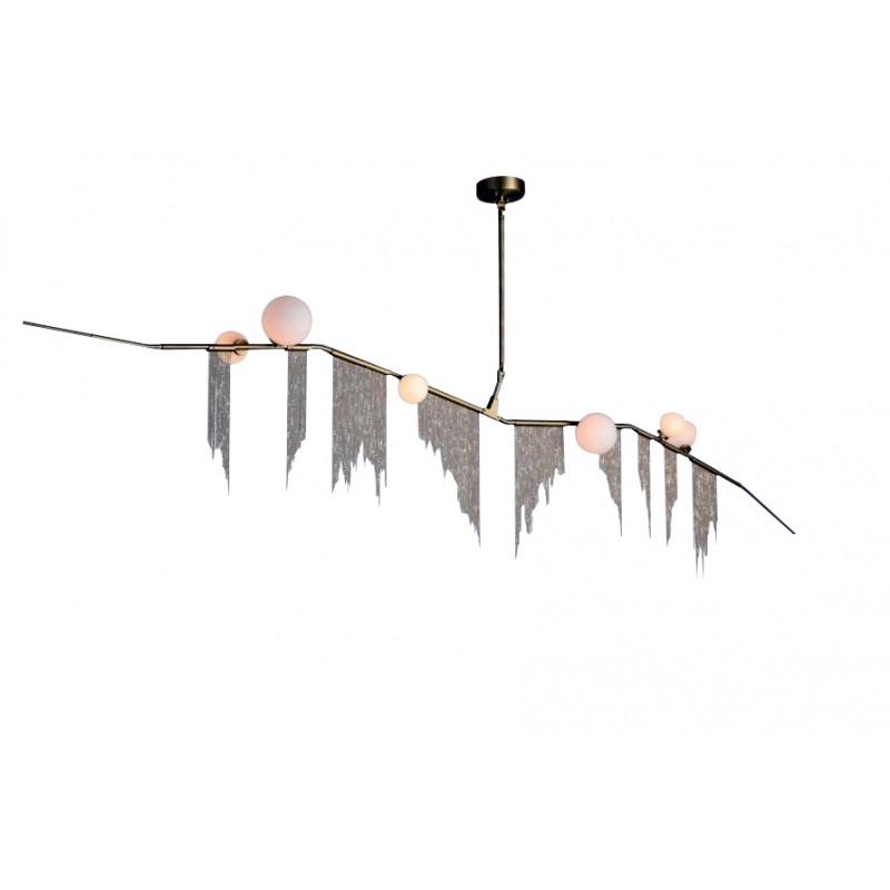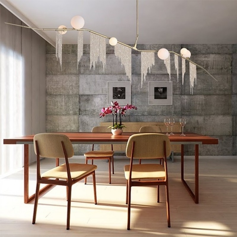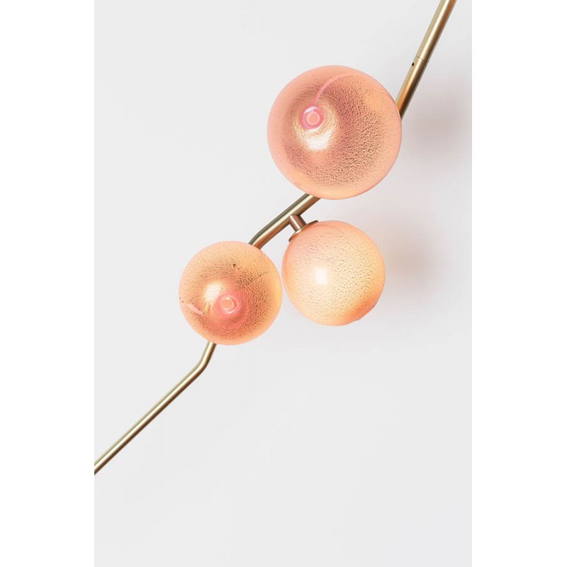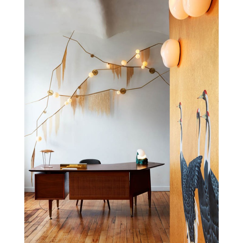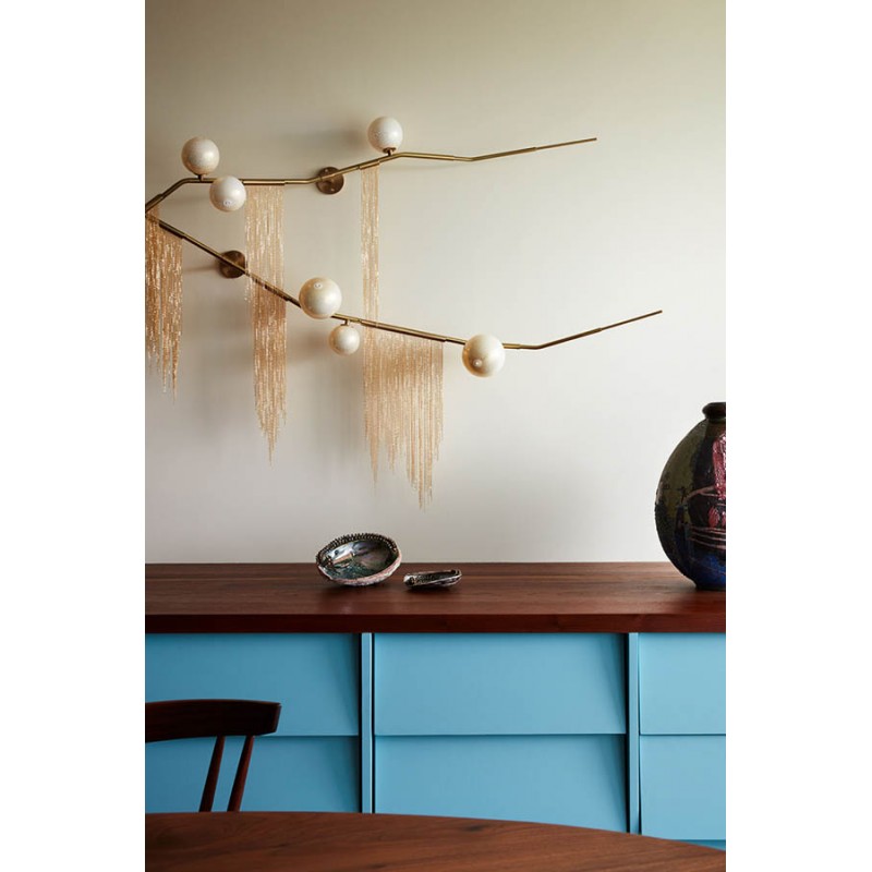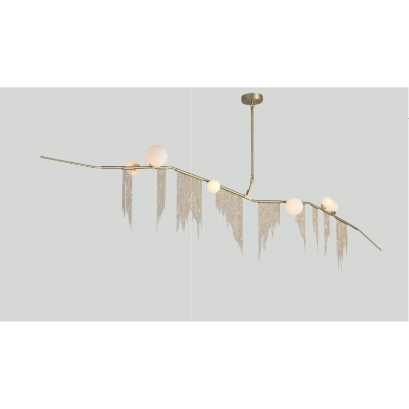 This gives a harmonious balance between effortlessly chic design with an opulent twist. The delicate gold fringing juxtaposes the rigid gold arms and frosted glass, which brings a sense of chaos to space. The Chandelier is available in a 6, 7, 9, or 10 bulb option, and can be hung either alone, to keep it simple and neat, or clustered together to create a luxuriously textured feature in any space. The on-trend brushed gold finish is one of the hottest trends in lighting at the moment, while the gold chains will keep it edgy and different. This is a diverse group of fixtures with dozens of possible configurations and several finishes, unified by the use of small, pale, round globes--yellow, pink, white or blue--burnished with gold foil that gives them a soft, otherworldly glow amid the slender metal branches. From chandeliers that hang above a table like a gentle solar system to the bold yet almost weightless Cherry Bomb cages, which resemble lobster traps freshly pulled from the bay, glistening in the sun, the collection gives expression to a panoply of emotions.