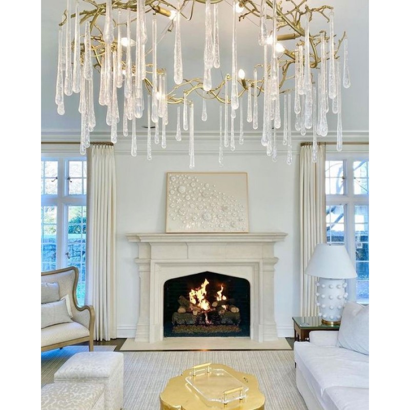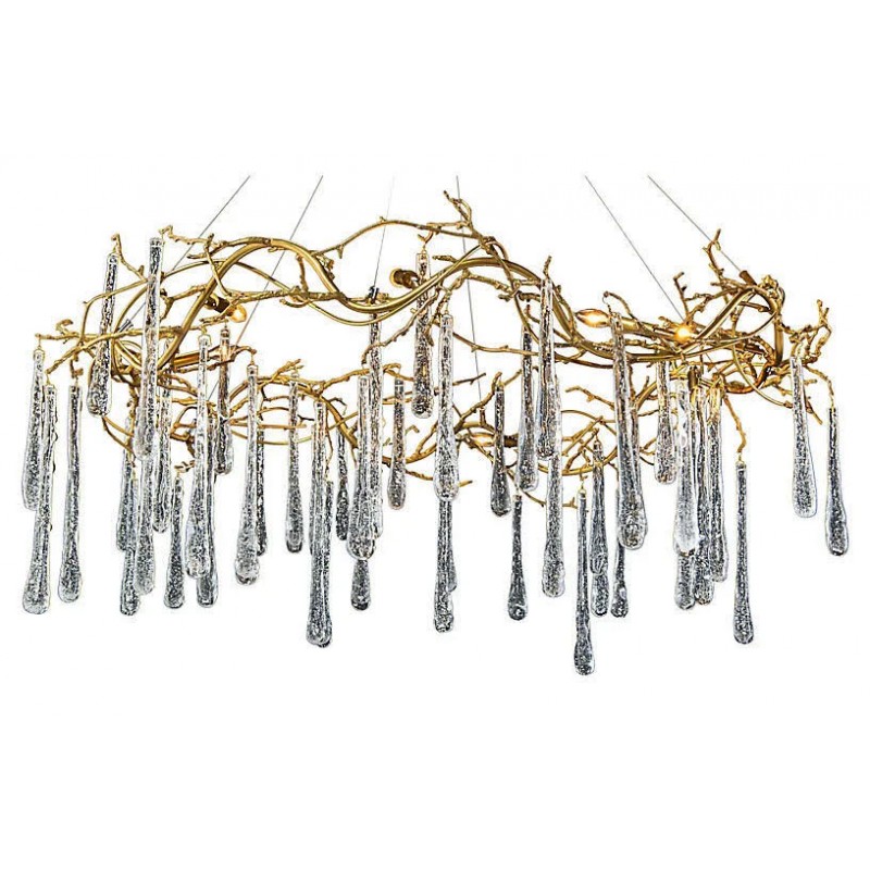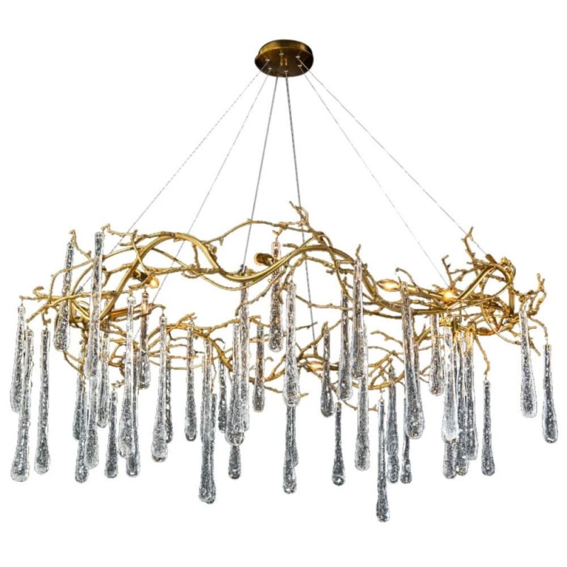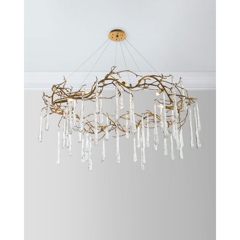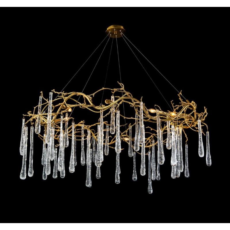 An eight-light halo of organically formed brass branches dripping with hand-blown glass teardrops will add a dynamic setting in any room. The chandelier is supported by six-wire cables that are 59" long that are adjustable. Having created custom chandeliers for over three decades, we specialize in bringing lighting concepts into reality, whether your inspiration comes from a rough sketch, an existing chandelier, our original concepts, or even your own creative imagination. Large or small, our team can meet the challenge.