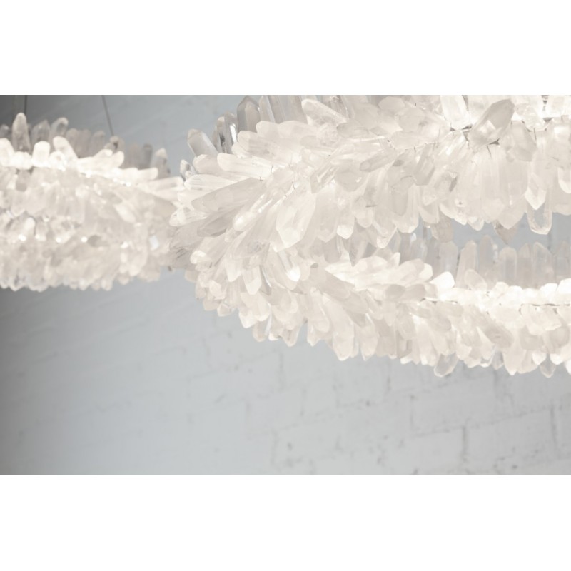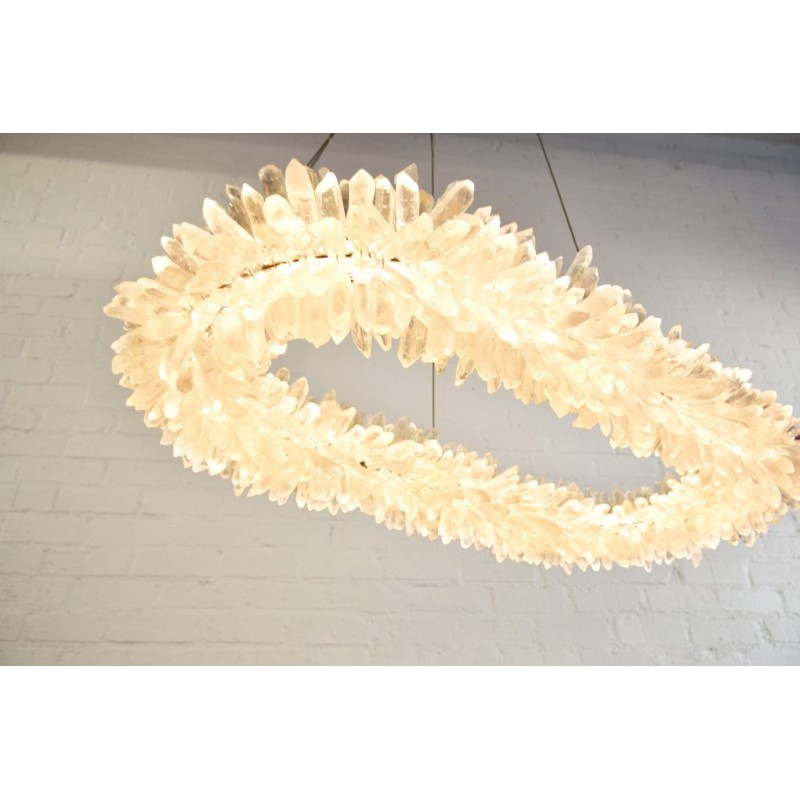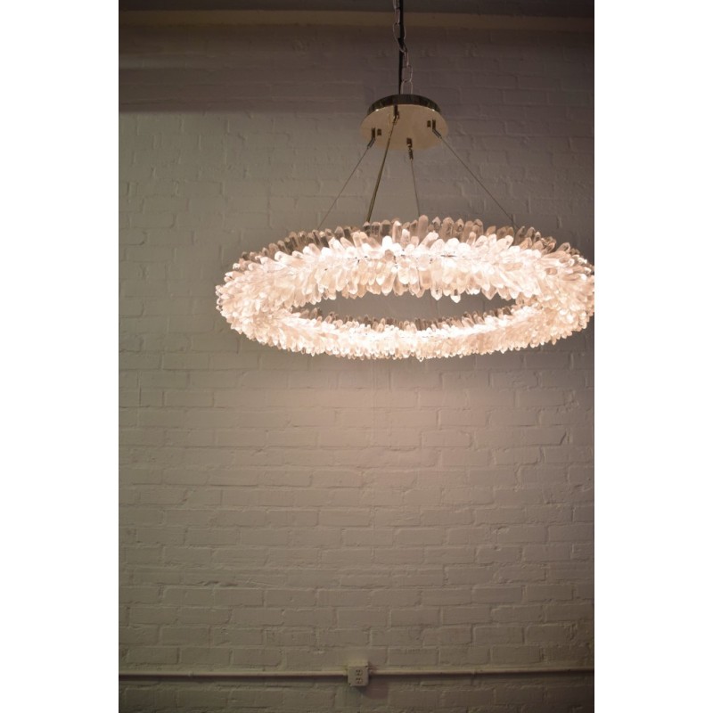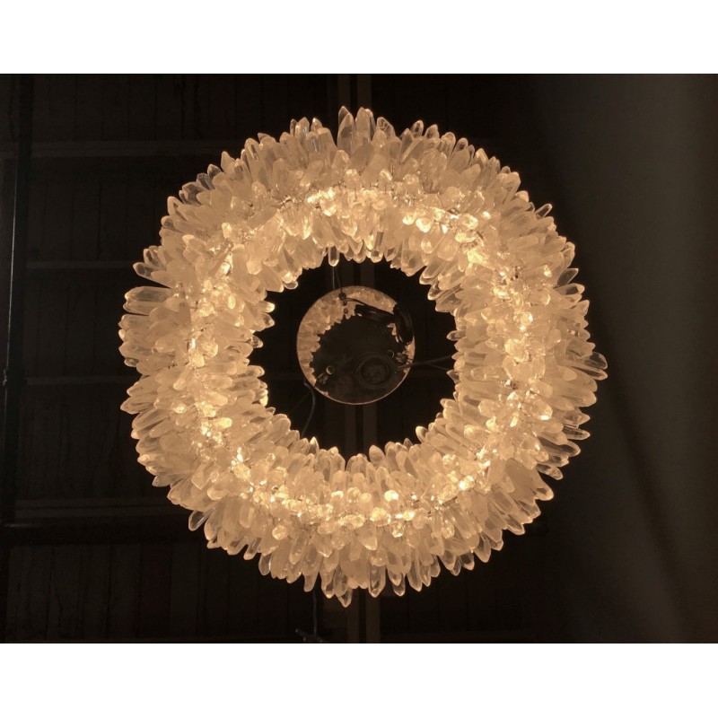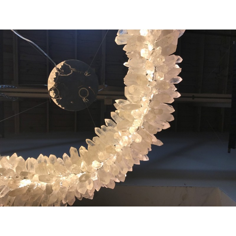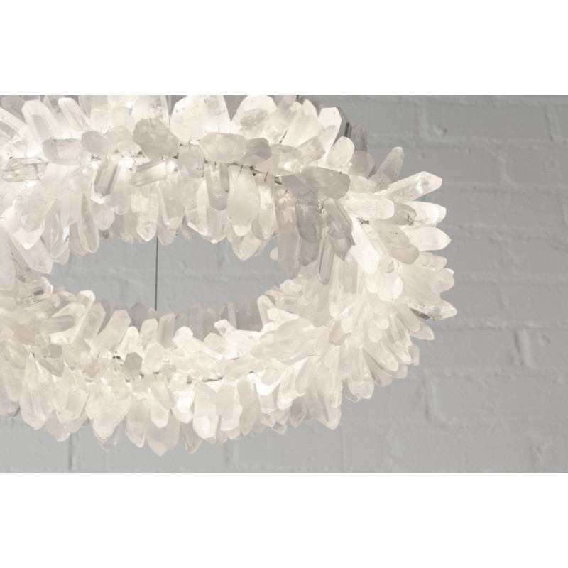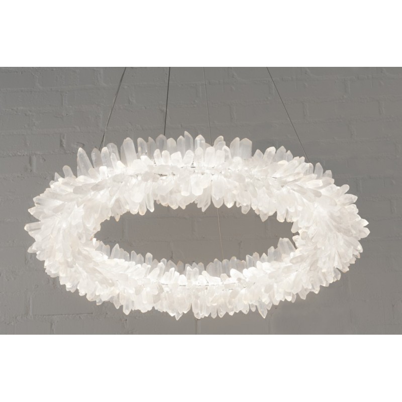 The ancient Greek gave to mortals what was re-served for the gods “fire”. Here, a simple yet elegant construction creates a timeless light – a ring of ‘flames’. With the gift of fire, Prometheus allowed humanity to develop… Simple yet elegant construction with warm white LED, natural uncut Brazilian rock quartz rock crystals points create a halo of texture and shadow. Greek philosophy’s quest was to distill all things to their essence, their most elemental. Whether in Euclid’s elements of geometry or Democritus’ first concept of the atom, Greek thought explored the possibilities of nature’s abstracted and universal essence. Naturally occurring quartz crystals appear to have grown by Mother Nature, and lit themselves from the inside, illustrating an exploration of pure natural expression.