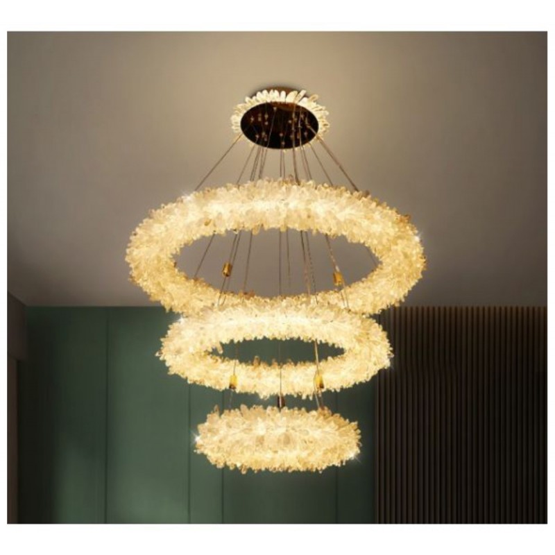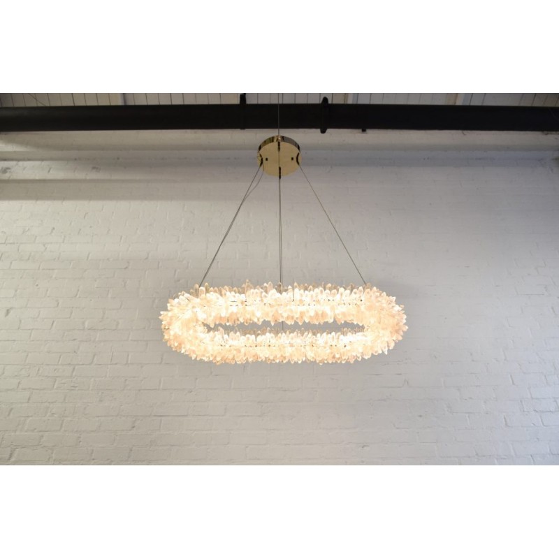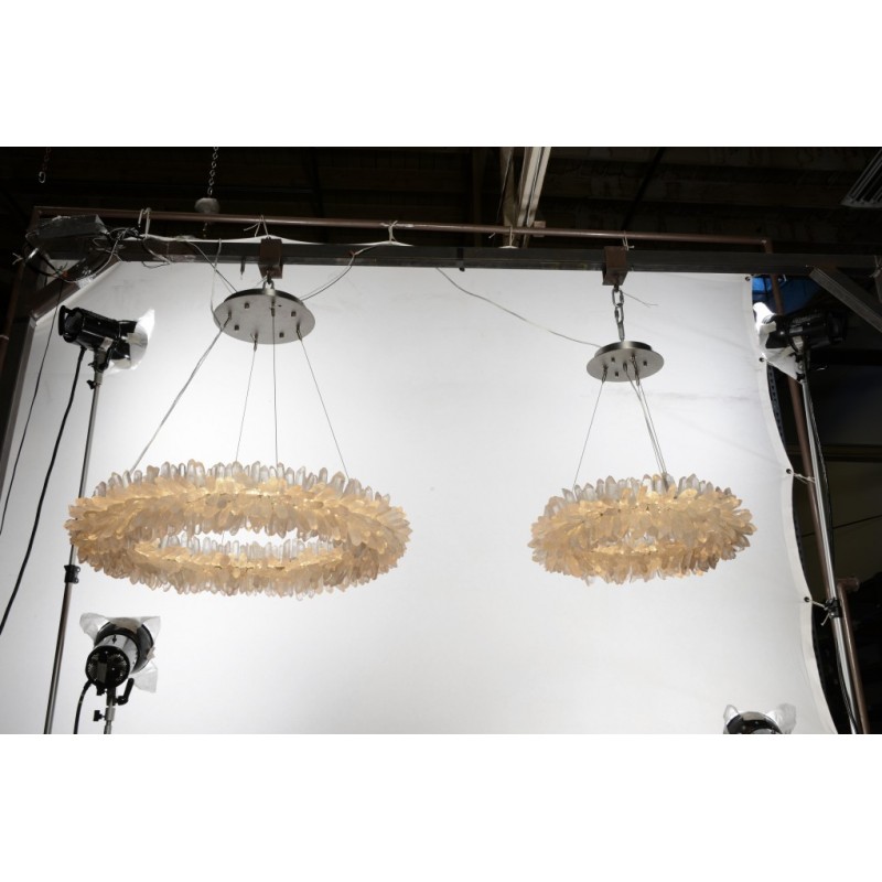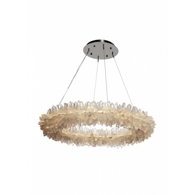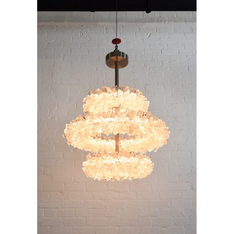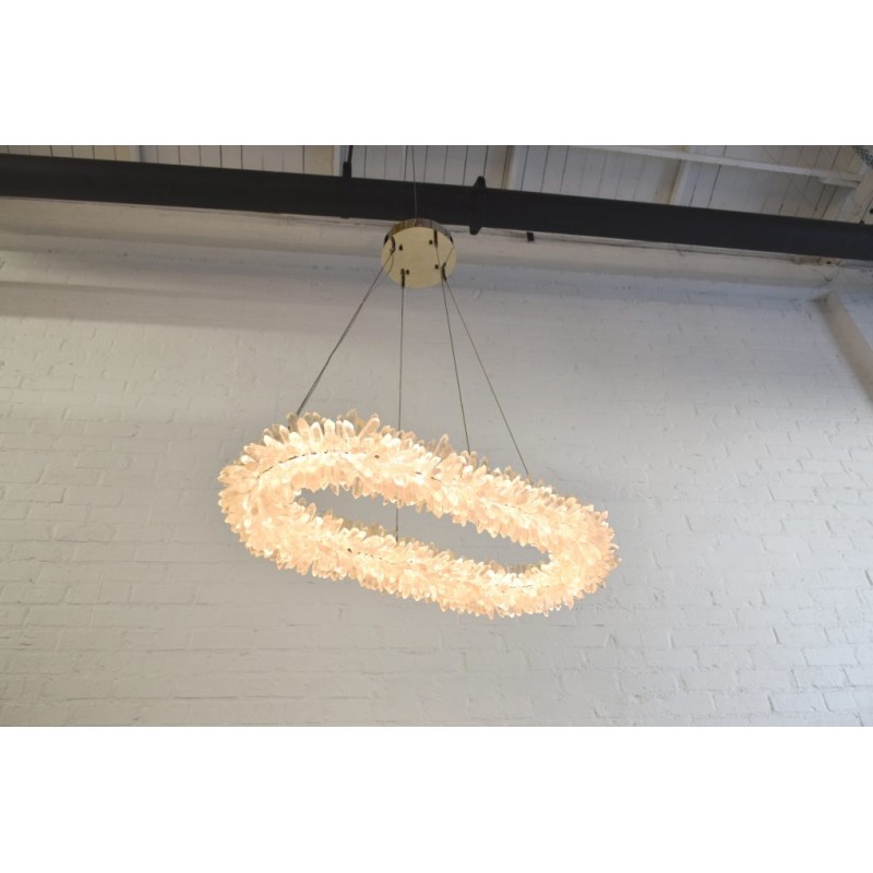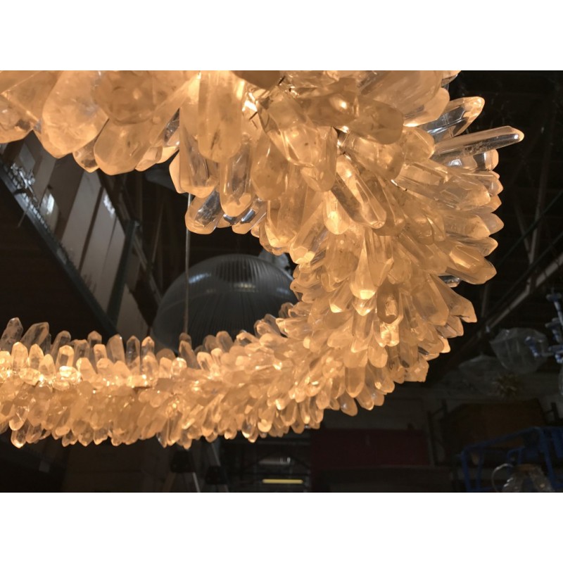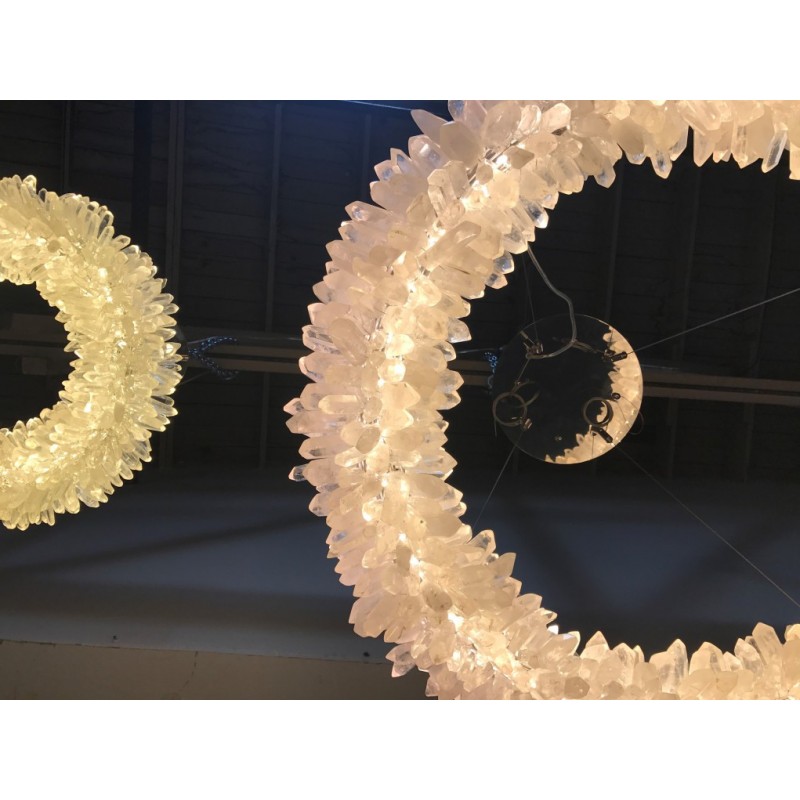 The ancient Greek gave to mortals what was re-served for the gods “fire”. Here, a simple yet elegant construction creates a timeless light – a ring of ‘flames’. With the gift of fire, Prometheus allowed humanity to develop… Simple yet elegant construction with warm white LED, natural uncut Brazilian rock quartz rock crystals points create a halo of texture and shadow. Greek philosophy’s quest was to distill all things to their essence, their most elemental. Whether in Euclid’s elements of geometry or Democritus’ first concept of the atom, Greek thought explored the possibilities of nature’s abstracted and universal essence. Naturally occurring quartz crystals appear to have grown by Mother Nature, and lit themselves from the inside, illustrating an exploration of pure natural expression.