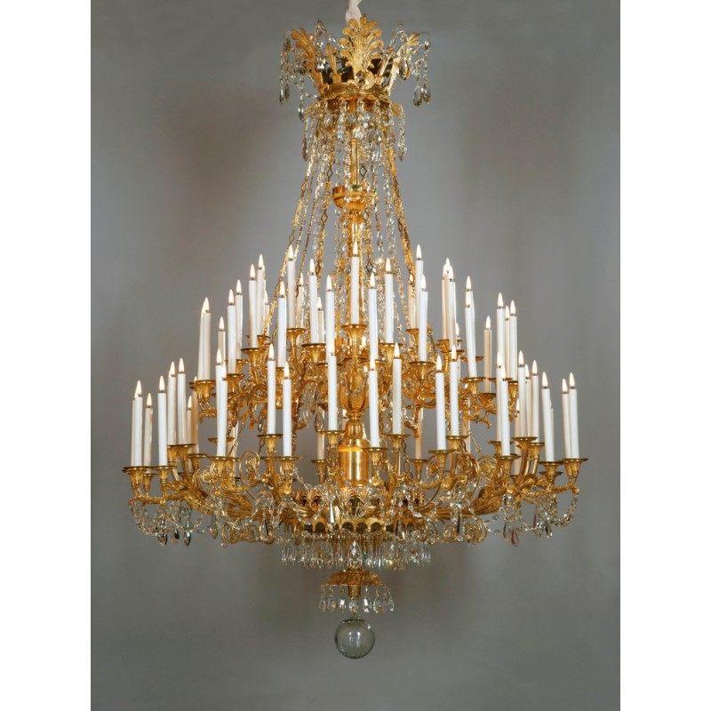 Grand Empire features multiple tiers, each adorned with slender, white candle-like lights arranged in concentric circles. The golden fixtures connect the tiers, and transparent crystal pendants hang elegantly, reflecting light. This exquisite piece combines functionality and aesthetics, making it a captivating focal point in any room.