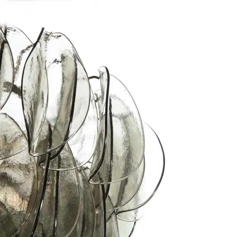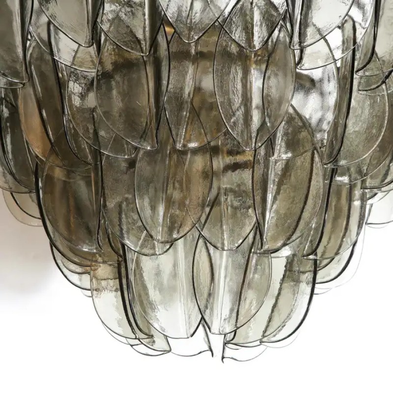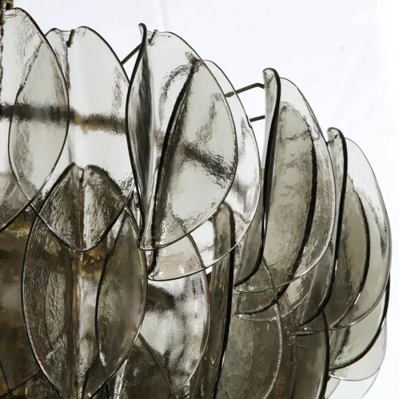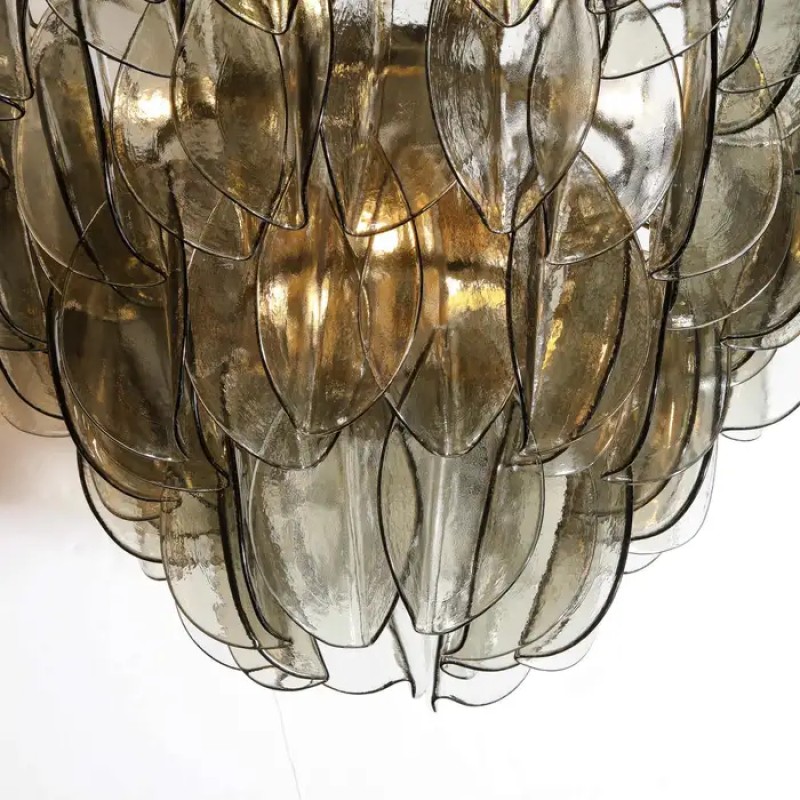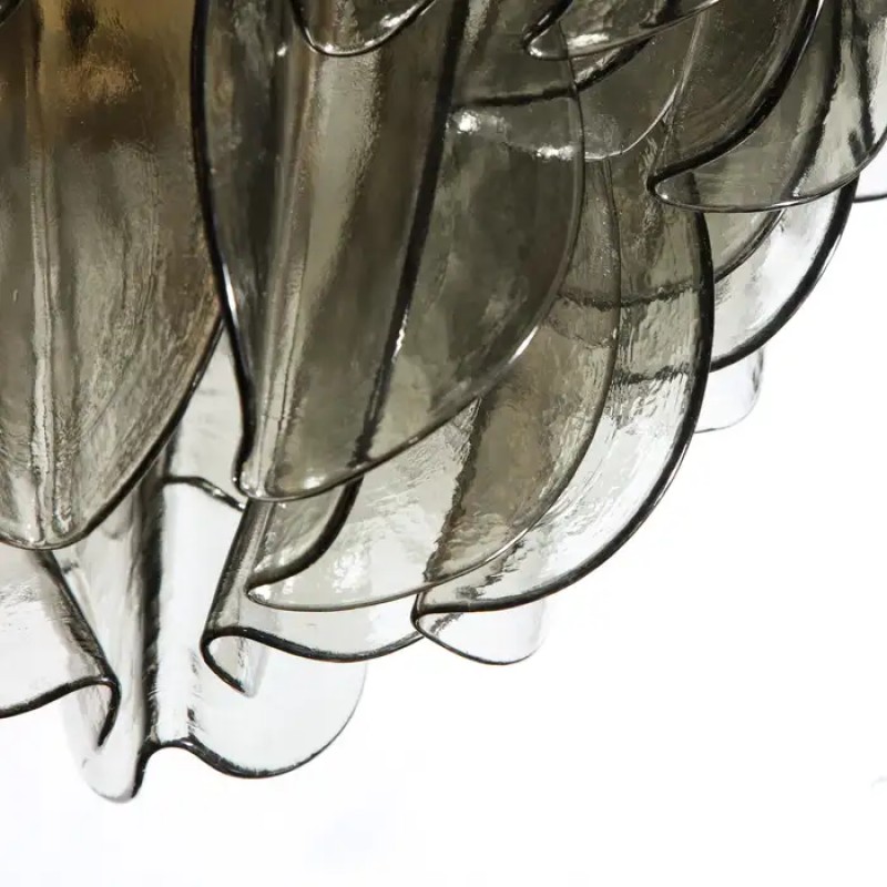The MODERNIST FEATHER chandelier boasts a unique and organic design, composed of numerous leaf-like glass elements layered intricately to form a cascading, voluminous structure. The glass leaves are tinted with a subtle smoky hue, adding a touch of elegance and sophistication. Each leaf is individually framed with fine metalwork, contributing to the chandelier's detailed and artistic appeal. The overall form resembles a blooming flower or a delicate cluster of petals, creating a soft, ambient glow when illuminated. This chandelier is a perfect blend of nature-inspired aesthetics and modern design, ideal for enhancing the decor of contemporary living spaces.