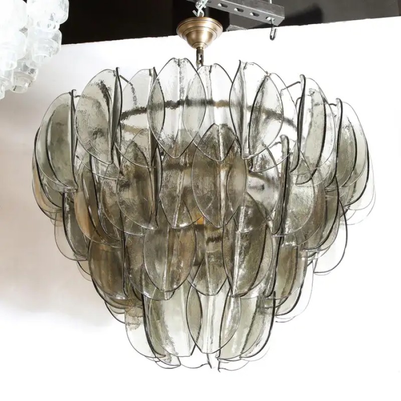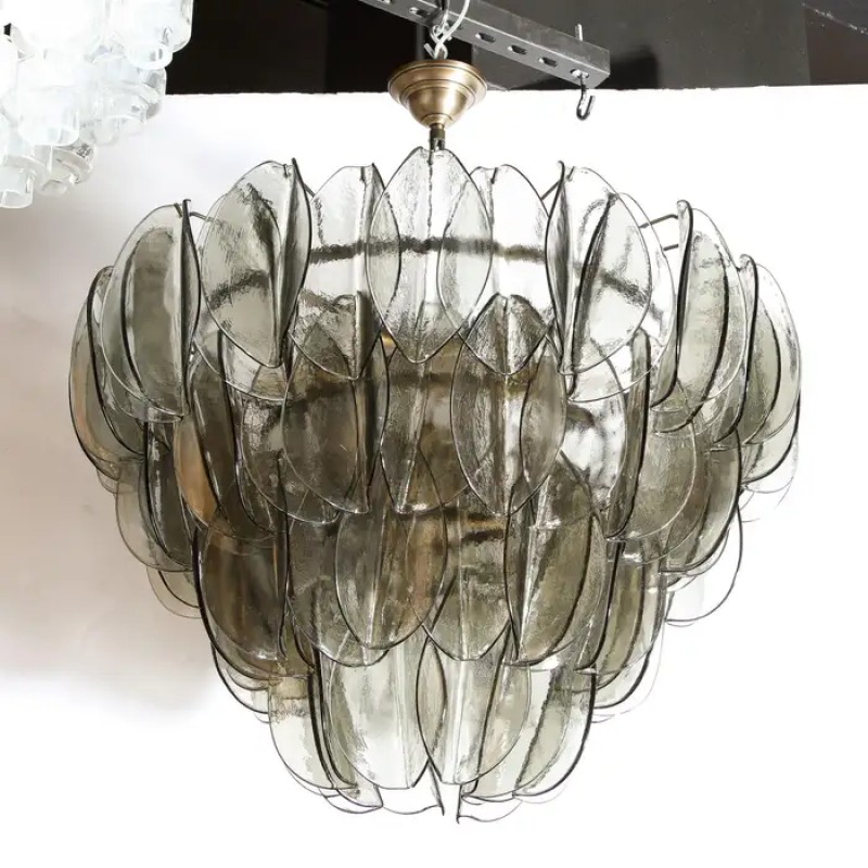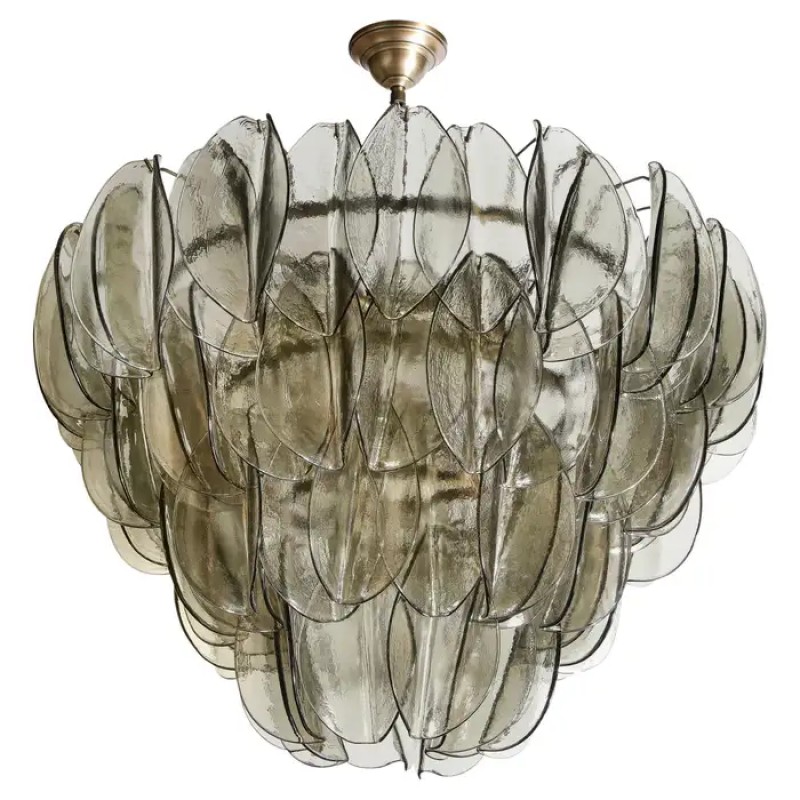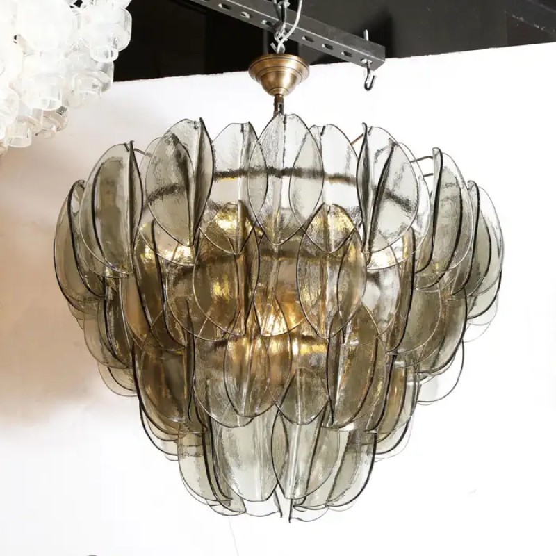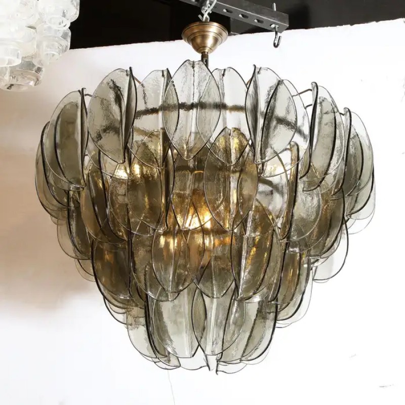 The MODERNIST FEATHER chandelier boasts a unique and organic design, composed of numerous leaf-like glass elements layered intricately to form a cascading, voluminous structure. The glass leaves are tinted with a subtle smoky hue, adding a touch of elegance and sophistication. Each leaf is individually framed with fine metalwork, contributing to the chandelier's detailed and artistic appeal. The overall form resembles a blooming flower or a delicate cluster of petals, creating a soft, ambient glow when illuminated. This chandelier is a perfect blend of nature-inspired aesthetics and modern design, ideal for enhancing the decor of contemporary living spaces.