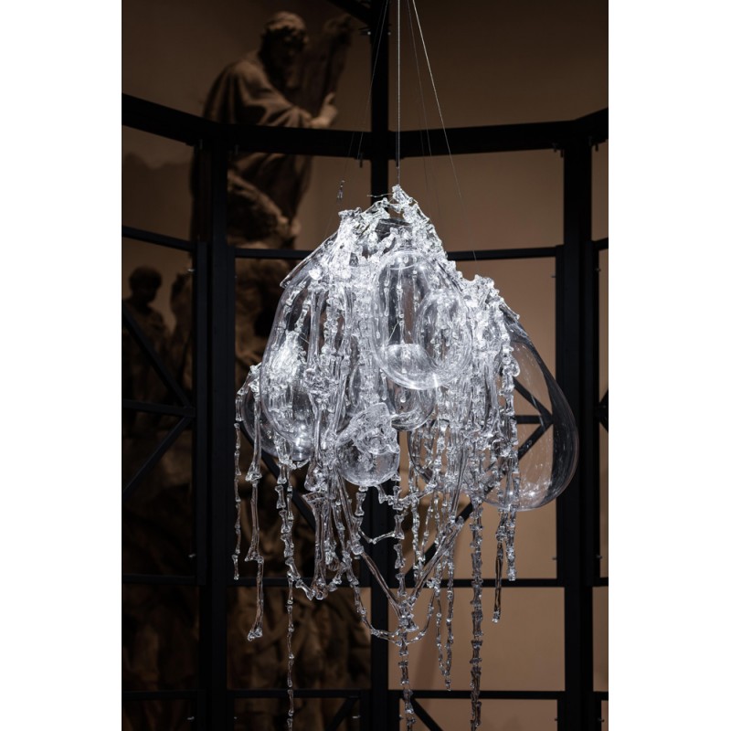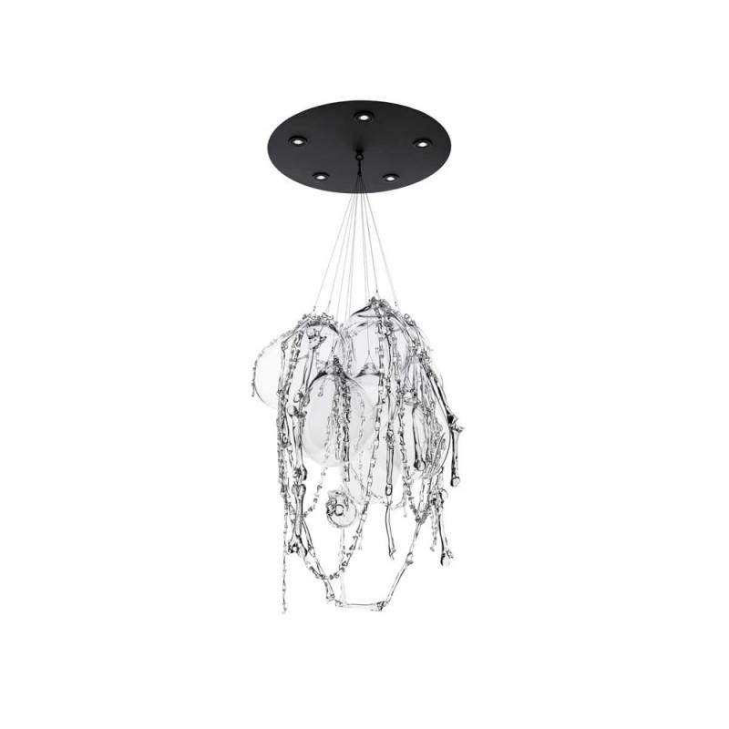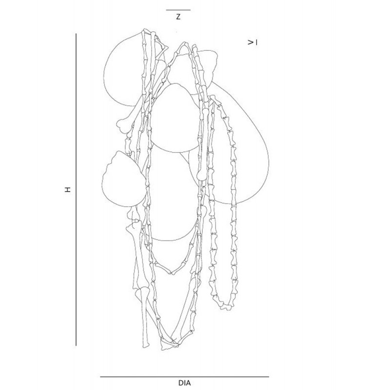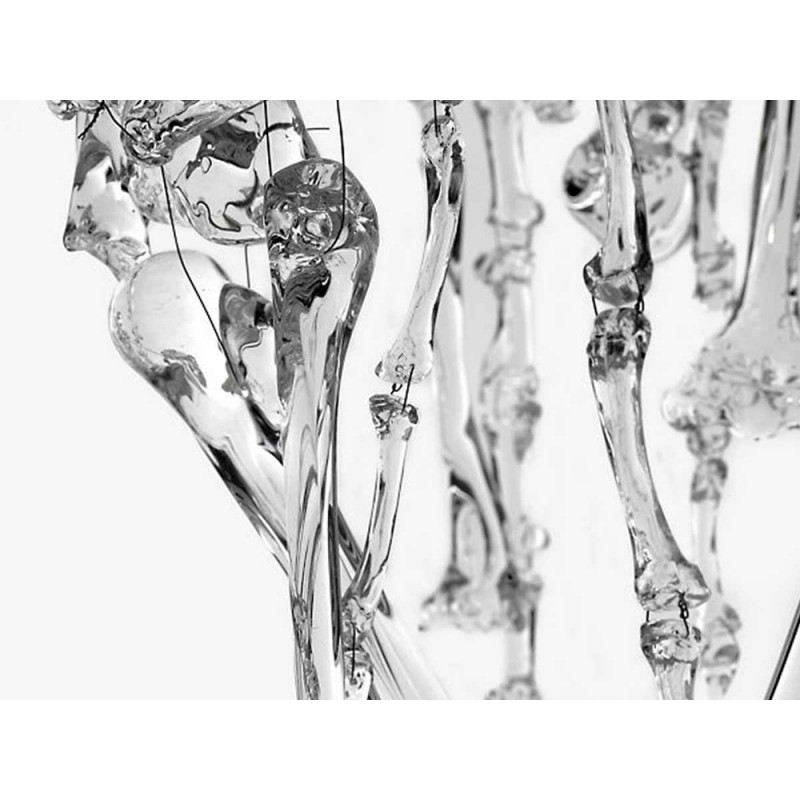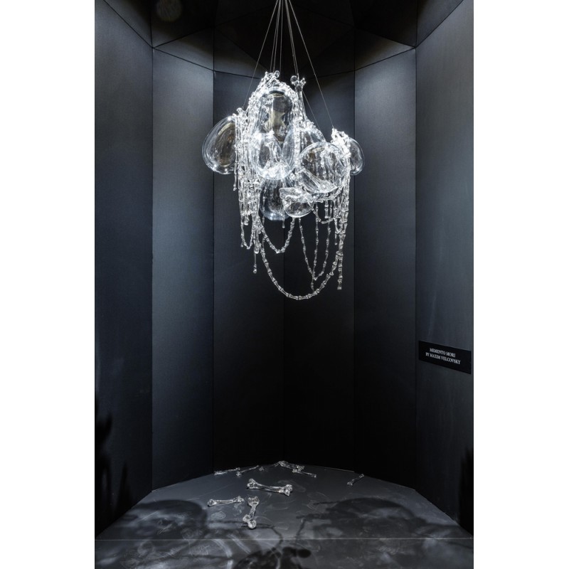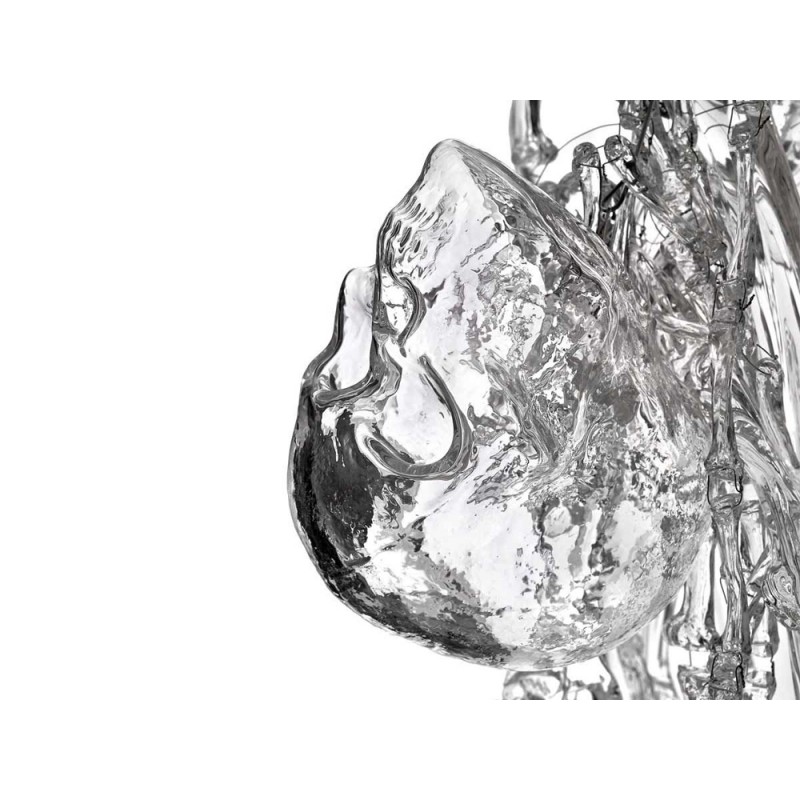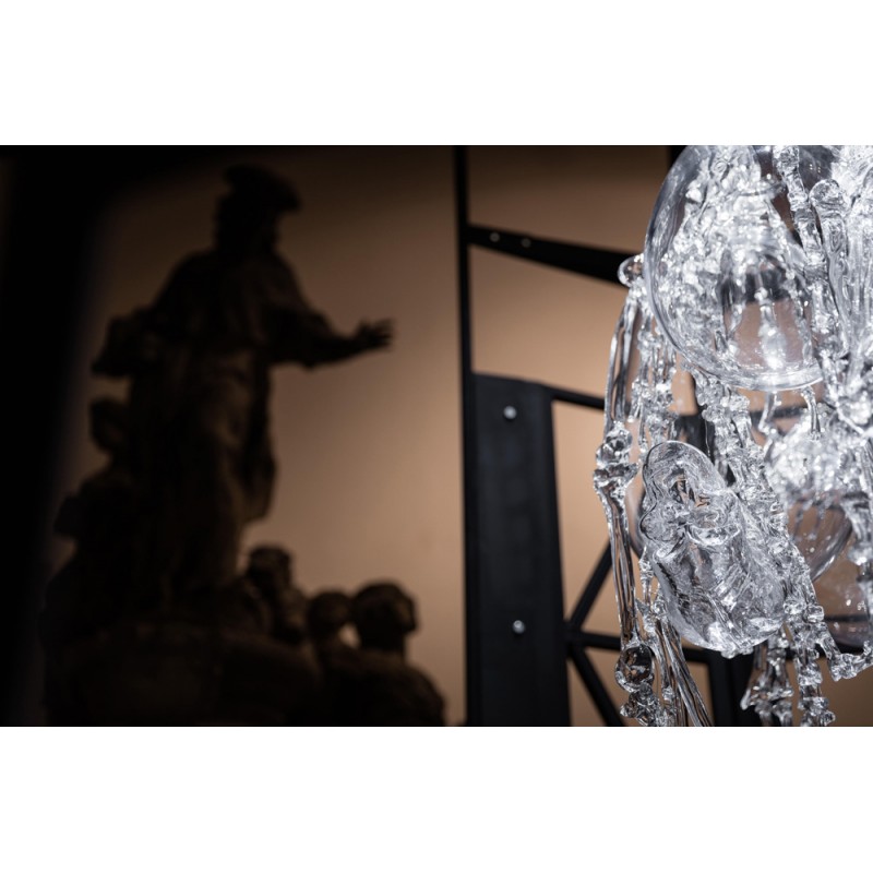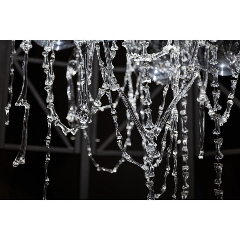 A great visual impact. Memento Mori which stands for “Recalling Death” in Latin, is the emblem of this object that symbolizes birth and death, a clear reference to crafts which have been handed down generations in Europe. The lamp is made up of a big circular ceiling rose that hosts five spotlights projecting a direct light on the body in pressed art glass. The glass body represents a set of bones of different sizes. The chains, also made up of small bones, reinterpret the timeless classic chandeliers. The light, projected through the glass, gives life to charming and elegant light compositions. The simplicity is only apparent and it shows design and manufacturing expertise, able to solve complexity in elements and details that are hidden in the main structure. Designed to fit into spacious environments, this lamp can be easily placed over a large table in the dining room, on a kitchen island or in large living rooms, immediately catching the attention and is especially suitable for luxurious contexts.