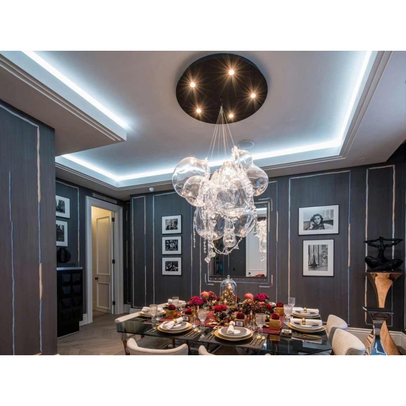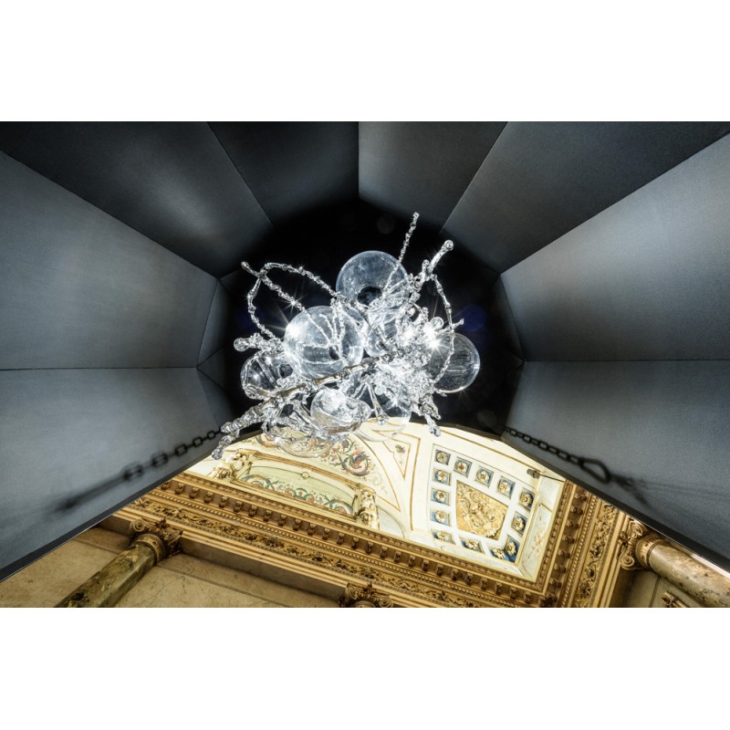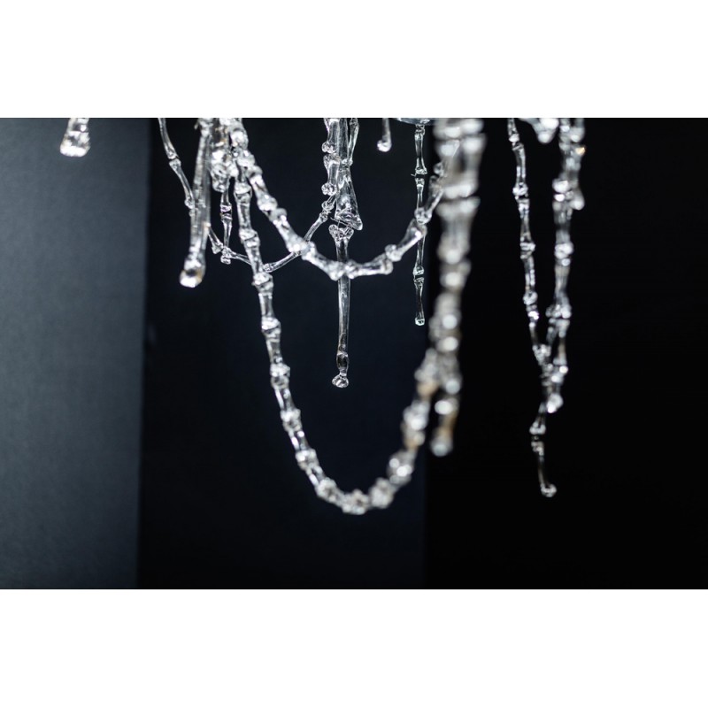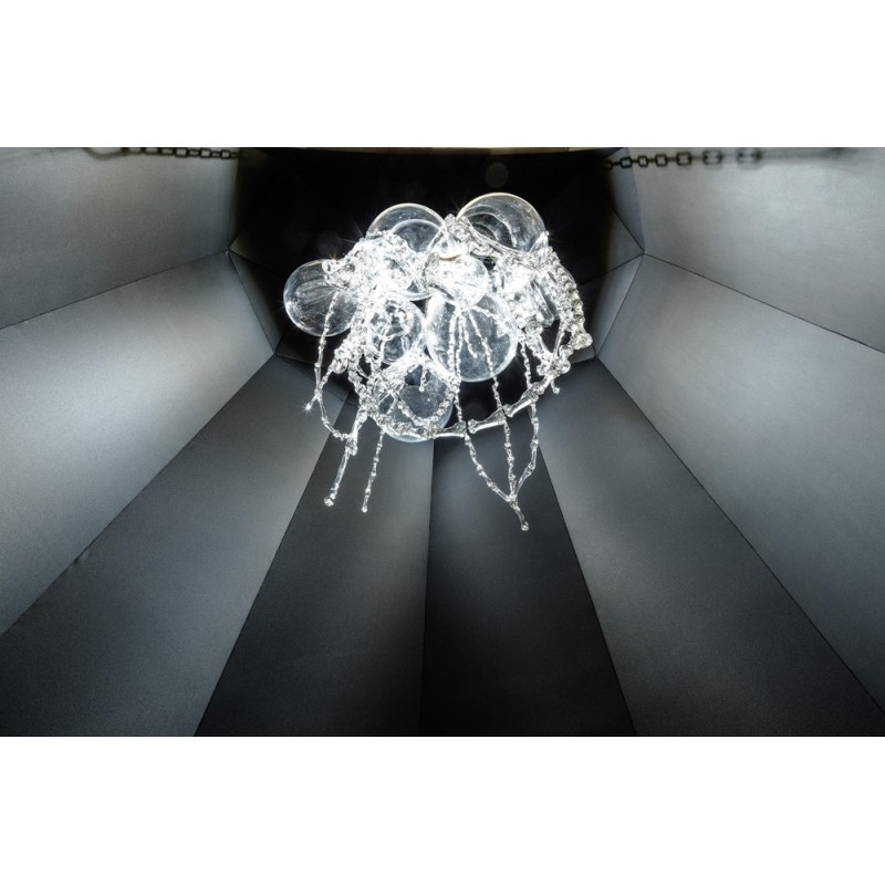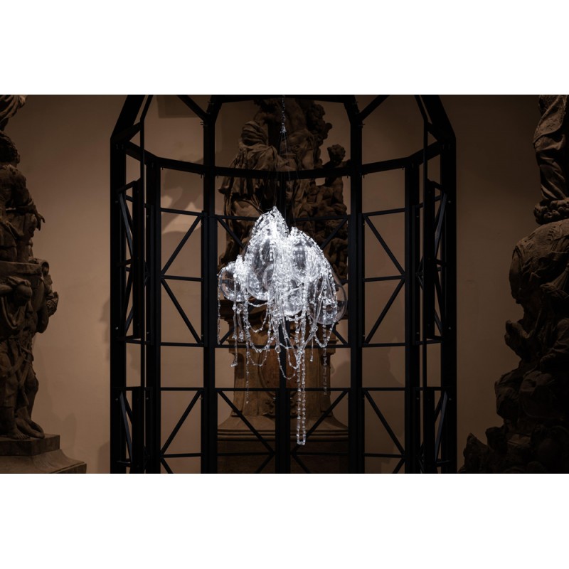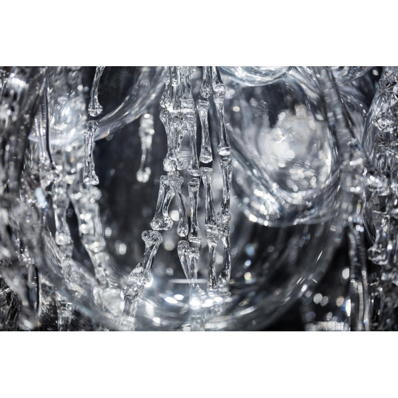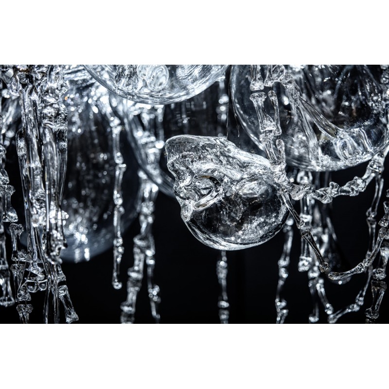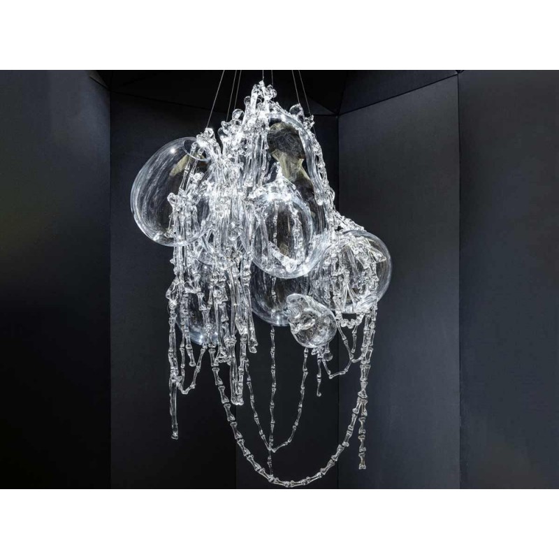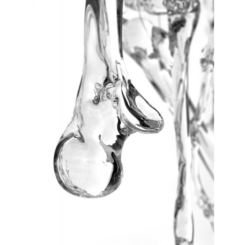 A great visual impact. Memento Mori which stands for “Recalling Death” in Latin, is the emblem of this object that symbolizes birth and death, a clear reference to crafts which have been handed down generations in Europe. The lamp is made up of a big circular ceiling rose that hosts five spotlights projecting a direct light on the body in pressed art glass. The glass body represents a set of bones of different sizes. The chains, also made up of small bones, reinterpret the timeless classic chandeliers. The light, projected through the glass, gives life to charming and elegant light compositions. The simplicity is only apparent and it shows design and manufacturing expertise, able to solve complexity in elements and details that are hidden in the main structure. Designed to fit into spacious environments, this lamp can be easily placed over a large table in the dining room, on a kitchen island or in large living rooms, immediately catching the attention and is especially suitable for luxurious contexts.