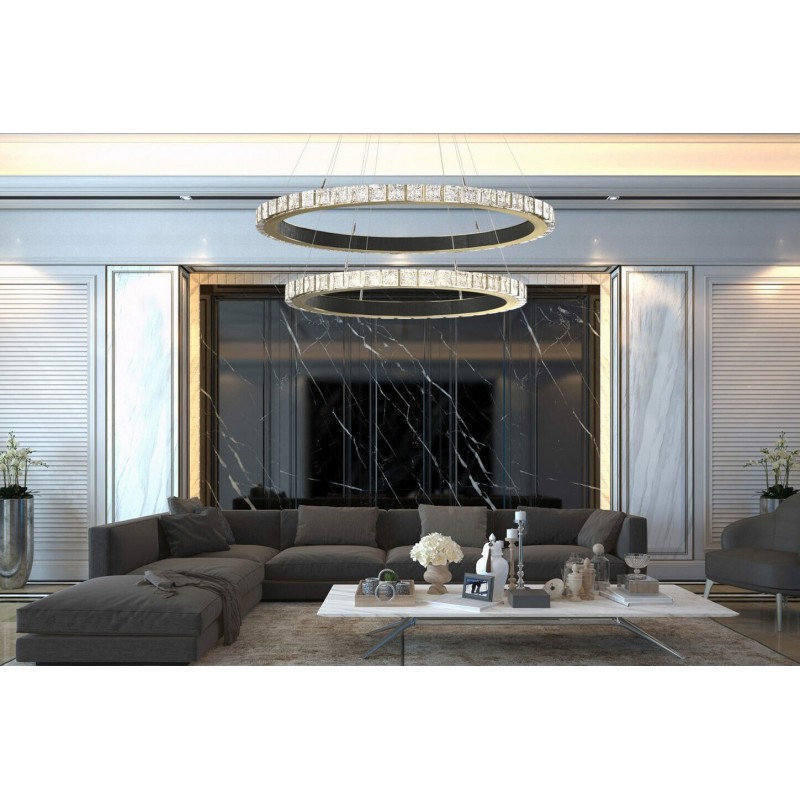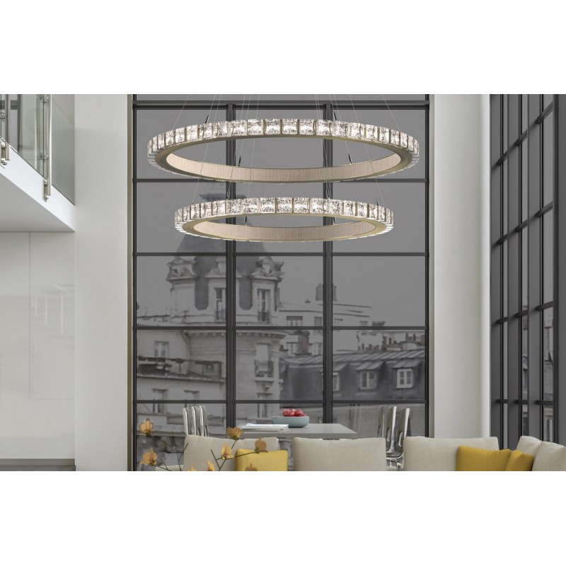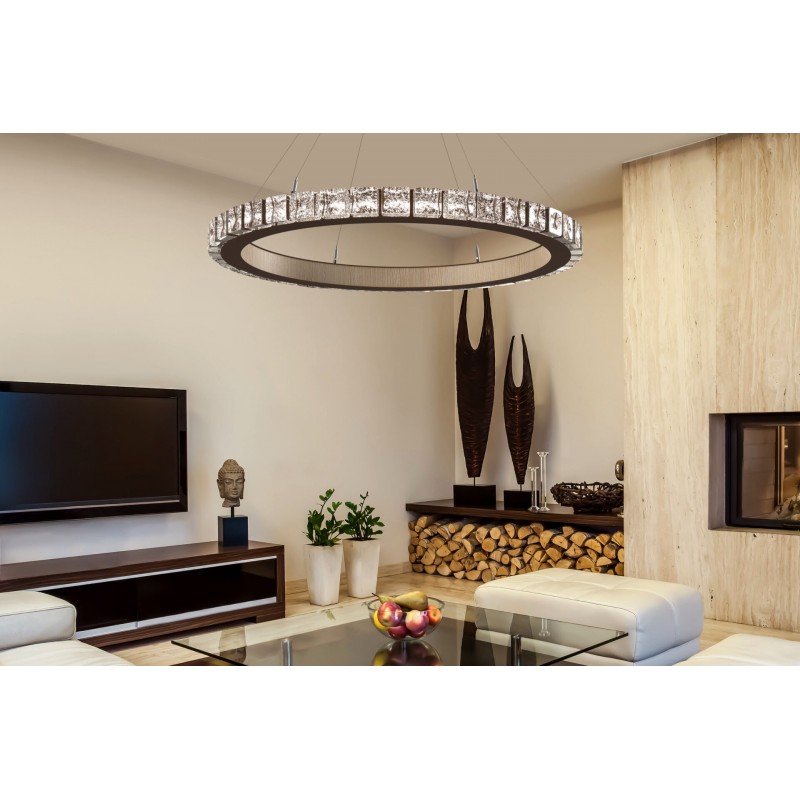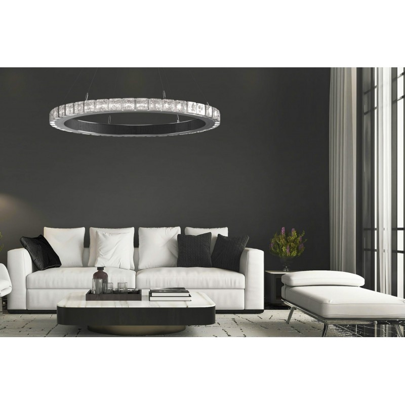 Deceptively simple in design, this sparkling ring chandelier captures the iconic glamour of a diamond eternity ring. At Alan Mizrahi Lighting Design, we supply and manufacture many highly sought-after designer pieces. All Chandeliers can be customized by a number of lights, styles, colors, and sizes to meet your specific needs. Every chandelier can also be combined with a matching table lamp and wall lamp to accomplish the best room design.