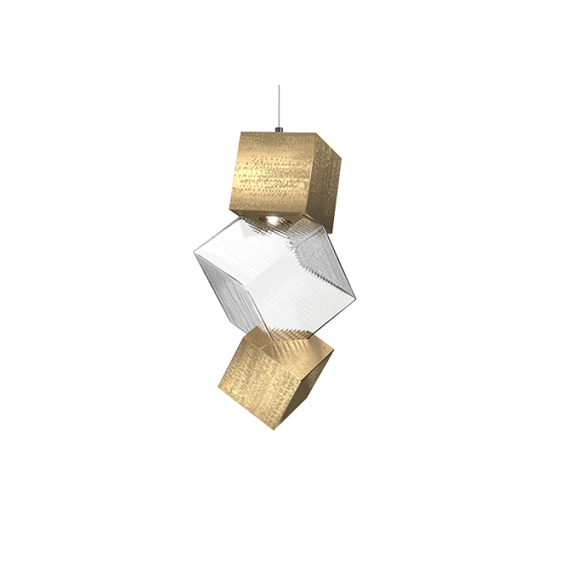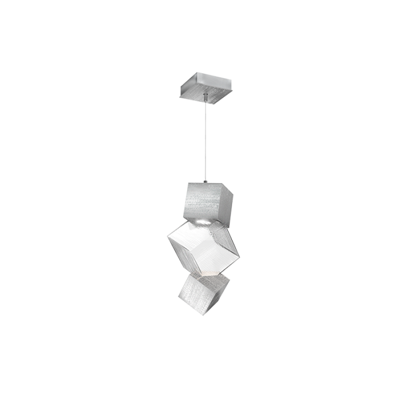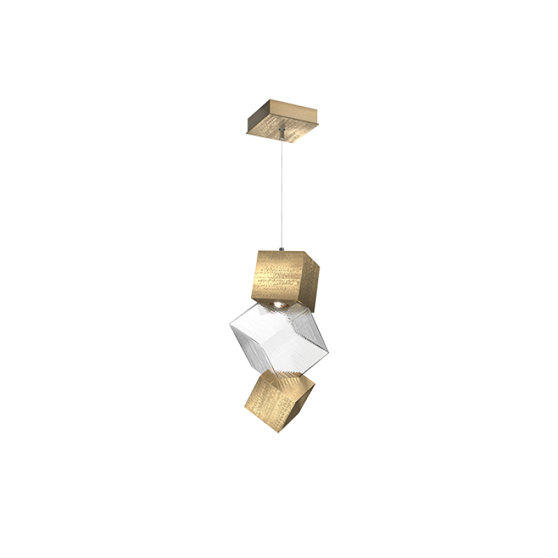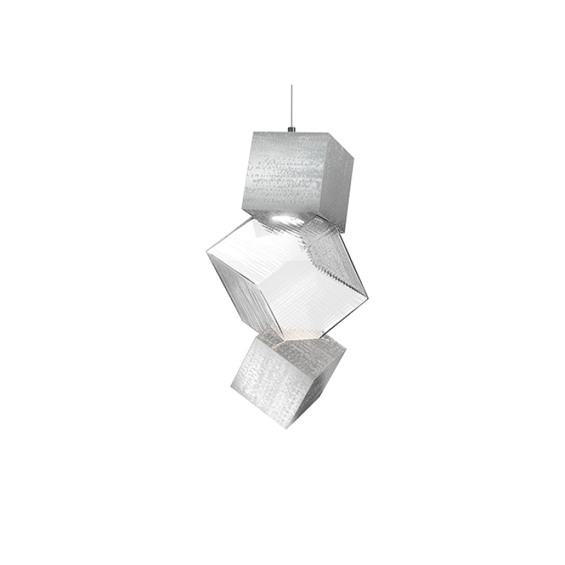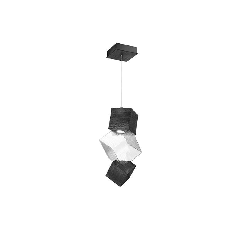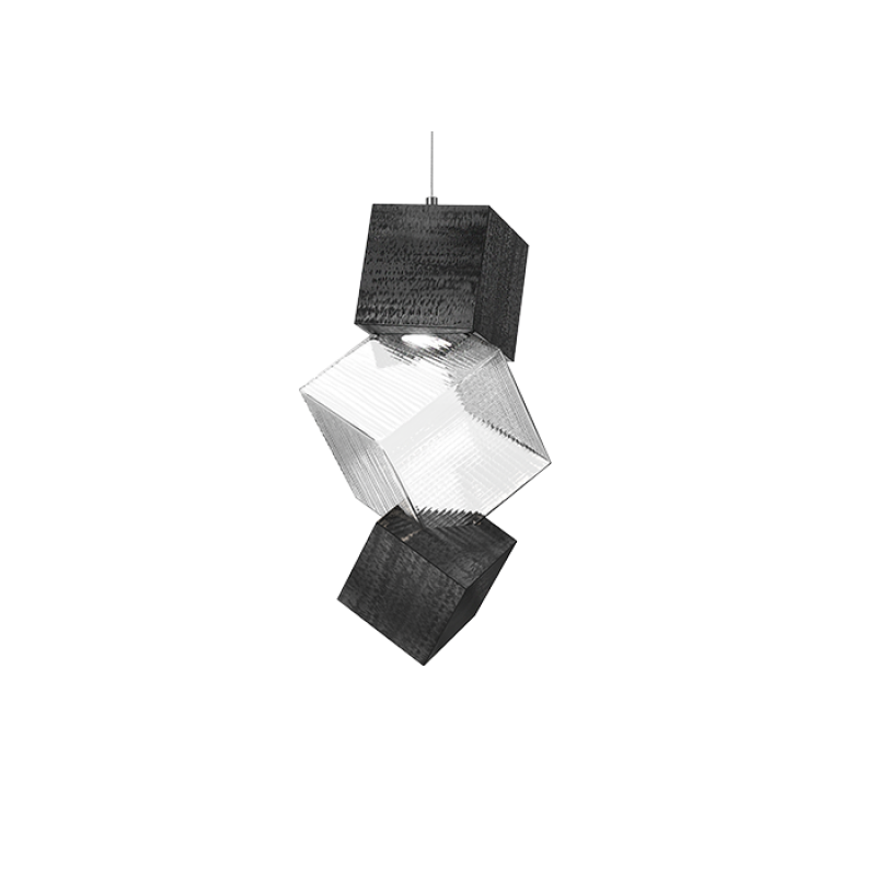 A geometric lighting sculpture in hand-distressed steel and textured blown glass. Includes adjustable cable suspension and 3,000K integrated LED.