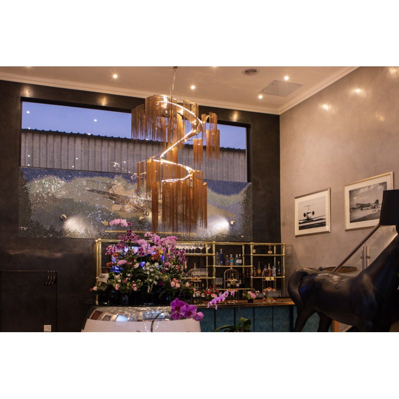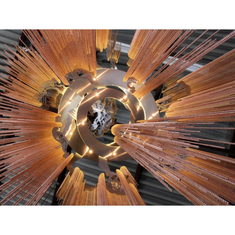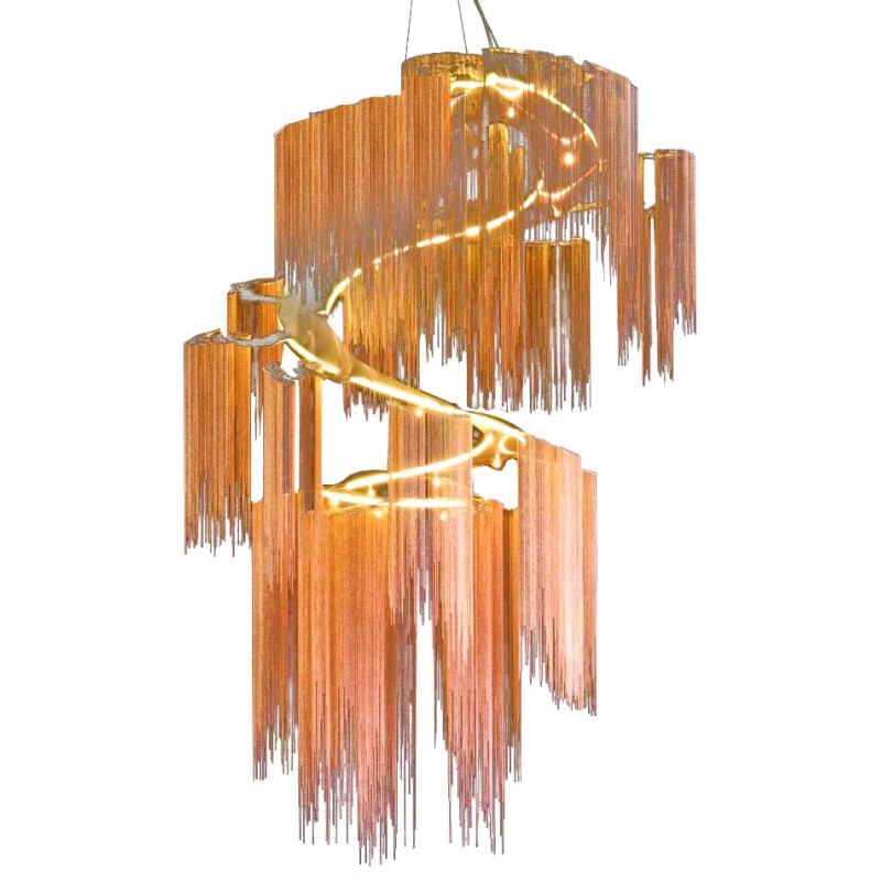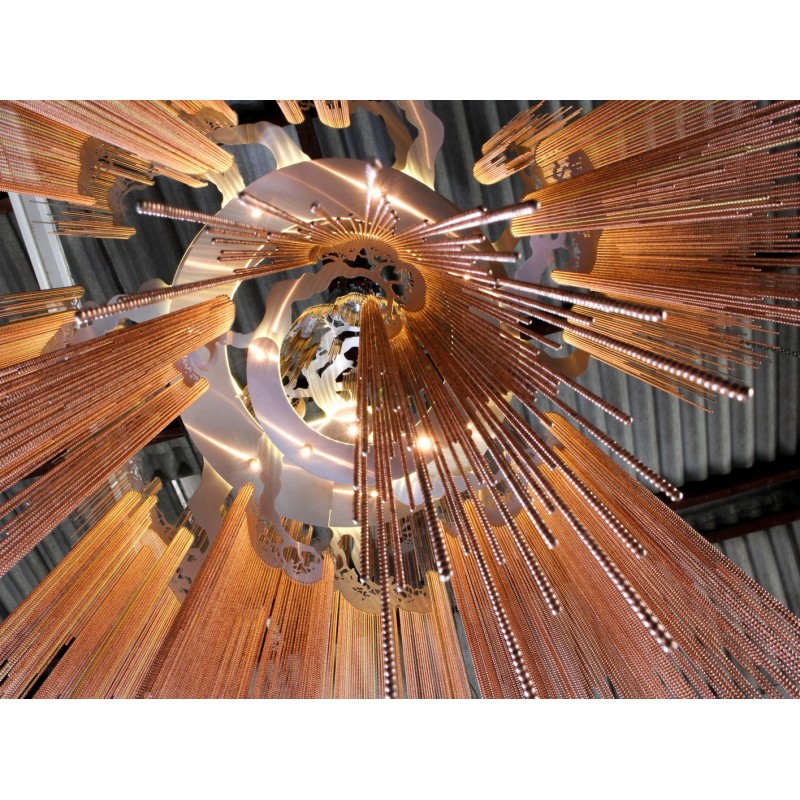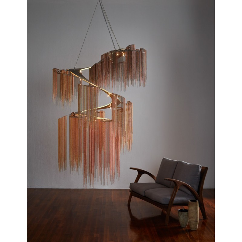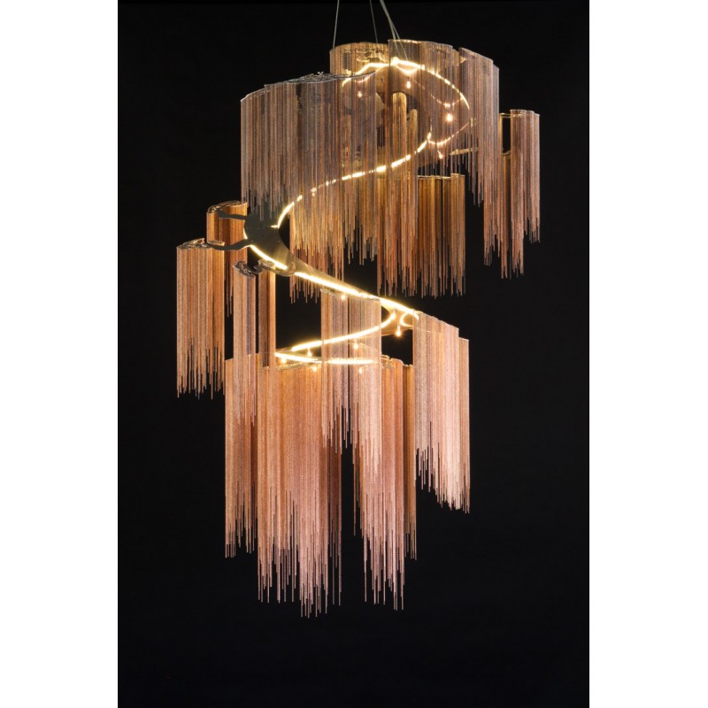 A design which is based on part of a massive tree forest installation. This is an evolution of our enchanted faraway tree which fuses all the branches into a single elegant spiraling frame. Made from several cascading rings of stainless steel frames, laser cut, chrome plated or lacquered, solid brass components and ball chain in optional finishes. This highly eclectic, somewhat 'gothic' design is inspired by a glistening, dripping stalactite and constructed by an interconnected latticework of chain. The inverted conical form gives the art piece a weightless, floating quality. At Alan Mizrahi Lighting Design, we manufacture many highly sought after pieces. All Chandeliers can be customized by the number of lights, style, color and size to meet your specific needs. Every chandelier can also be combined with a matching table lamp and wall lamp to accomplish the best room design.