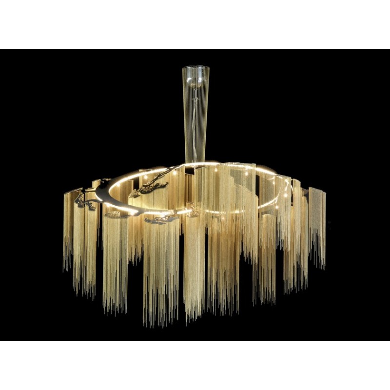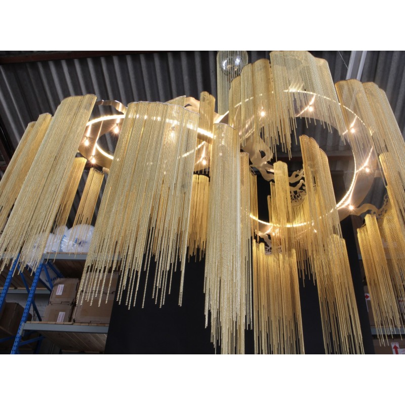 A design which is based on part of a massive tree forest installation. This is an evolution of our enchanted faraway tree which fuses all the branches into a single elegant spiraling frame. Made from several cascading rings of stainless steel frames, laser cut, chrome plated or lacquered, solid brass components and ball chain in optional finishes. This highly eclectic, somewhat 'gothic' design is inspired by a glistening, dripping stalactite and constructed by an interconnected latticework of chain. The inverted conical form gives the art piece a weightless, floating quality. At Alan Mizrahi Lighting Design, we manufacture many highly sought after pieces. All Chandeliers can be customized by the number of lights, style, color and size to meet your specific needs. Every chandelier can also be combined with a matching table lamp and wall lamp to accomplish the best room design.